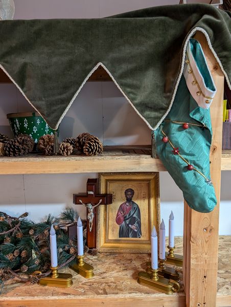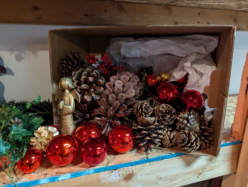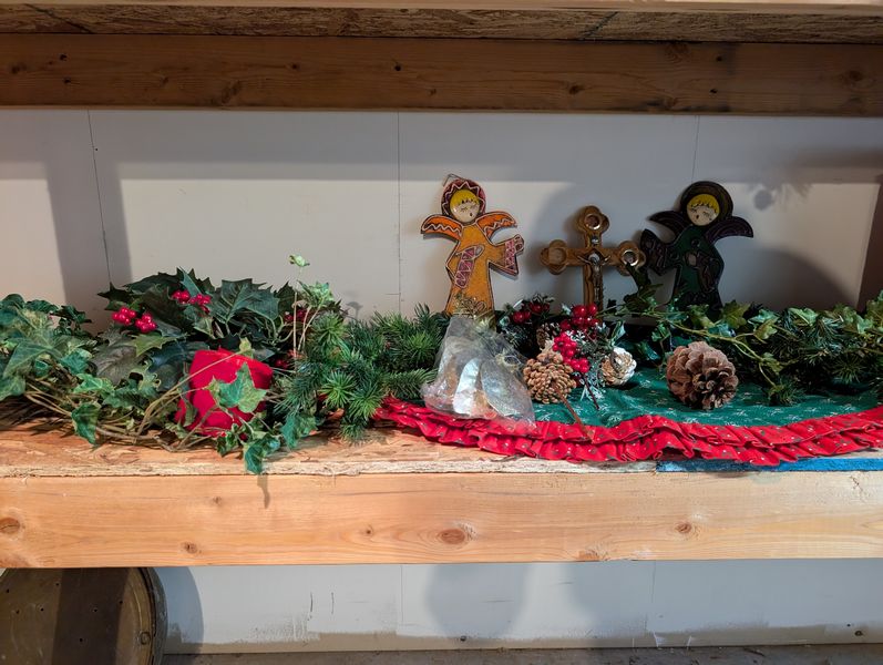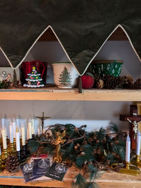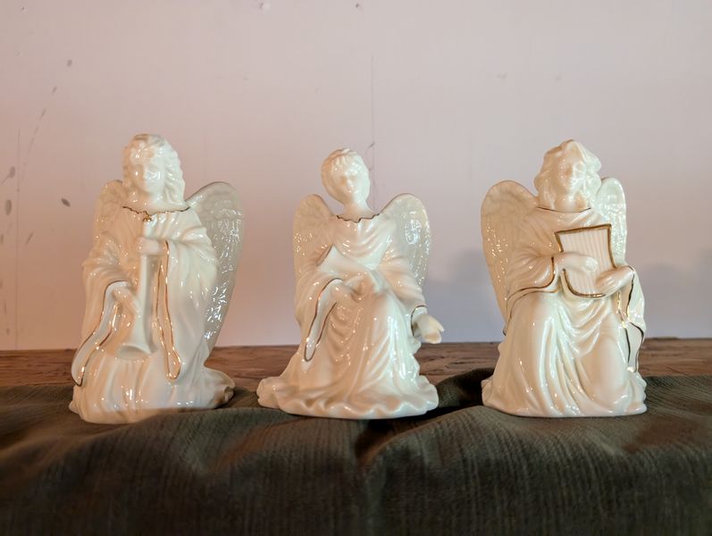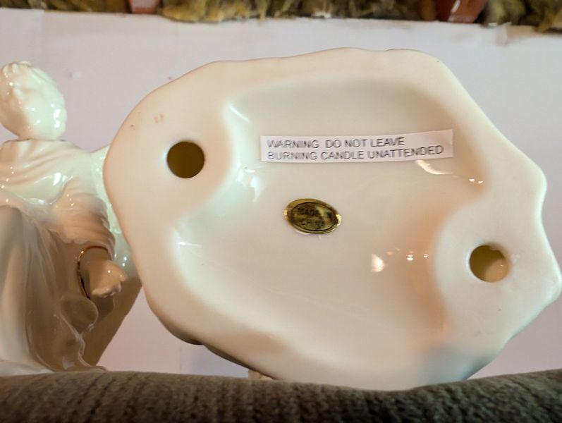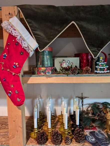 Christmas Décor. set of 3 porcelain figures (see photos); fireplace scarf; window candles; stockings; ornaments; framed religious wall art; other related holiday items as seen in photos. Loc in unfinished basement near walk out.