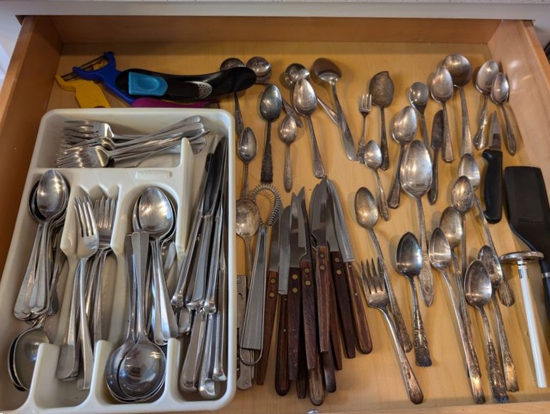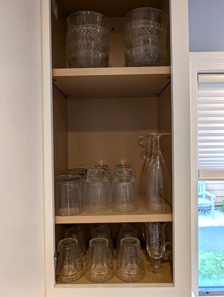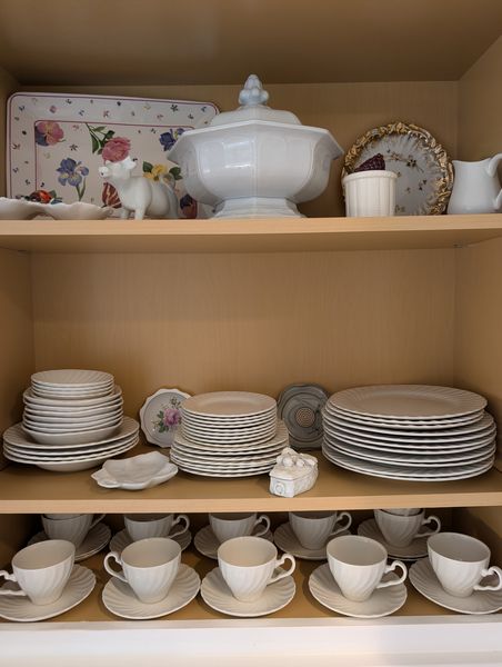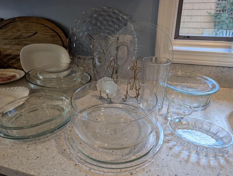 Kitchen Dishes and Serve ware. Contents of upper cab's, counter beneath, one drawer below. Incl: vintage white dish set (incomplete); cutting boards; placemats; clear glass bowls, platters, pitcher; glassware; assort flatware (stainless and plated). See photos for details.