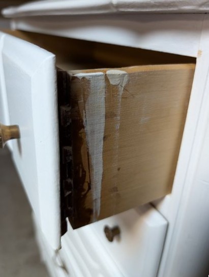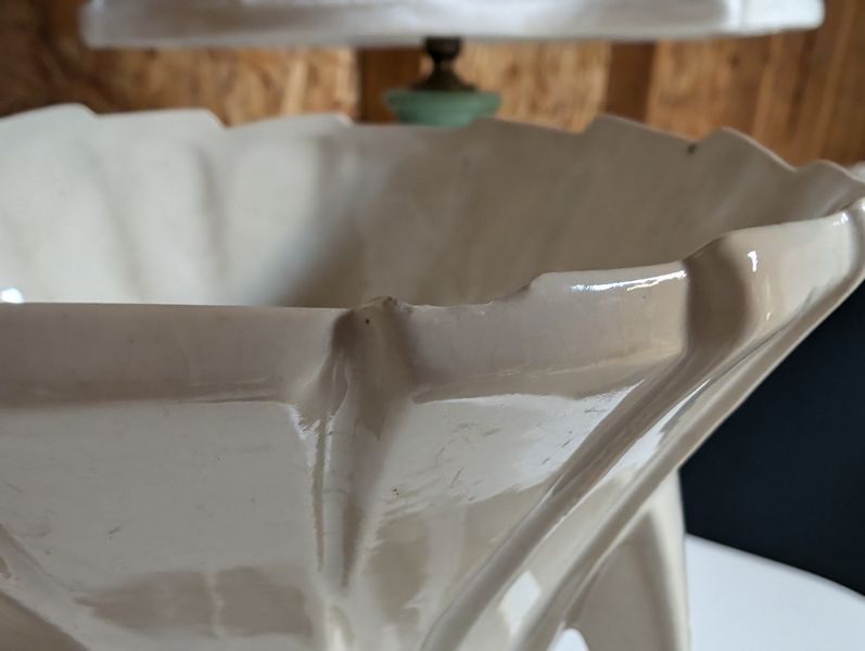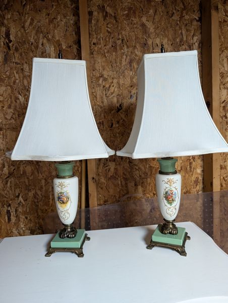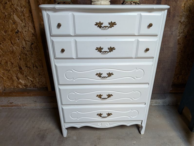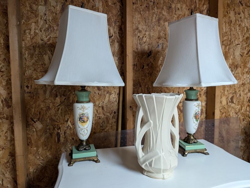 Dresser, Lamps, McCoy Vase. White painted 5-dr dovetailed dresser, 31"Wx17.5"Dx44"H; pr vintage table lamps with shades; McCoy pottery vase, 1'H (see photo chip on mouth). Loc in garage.