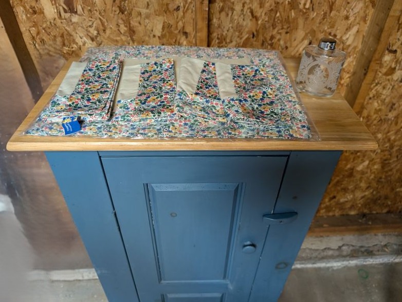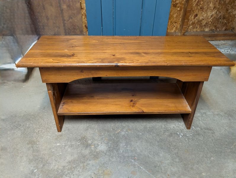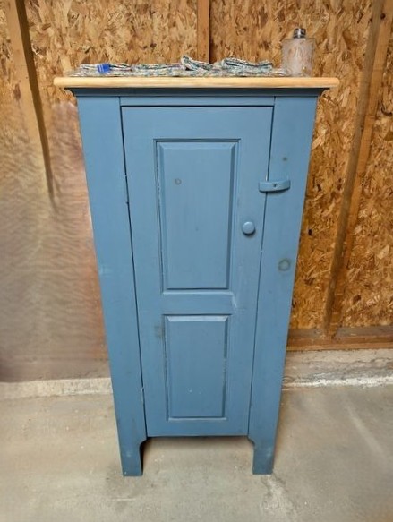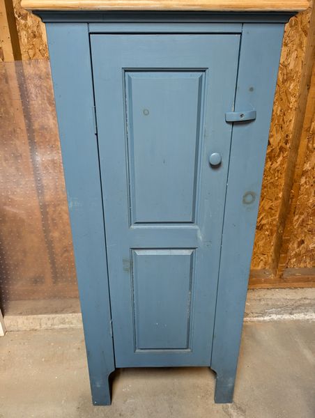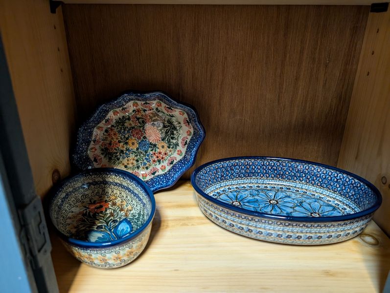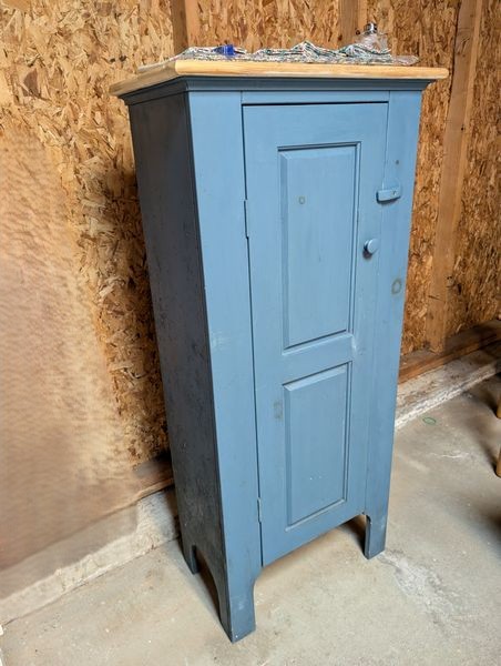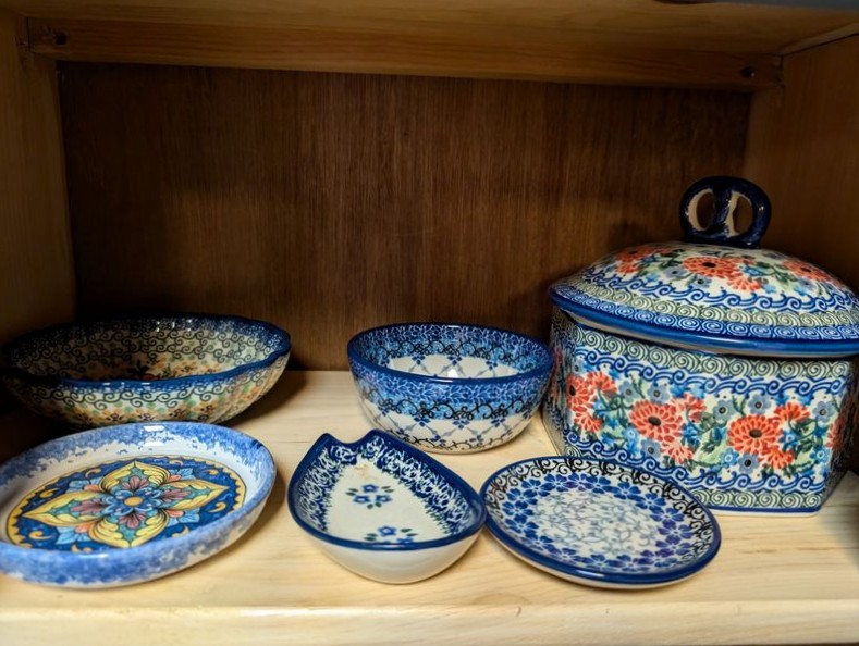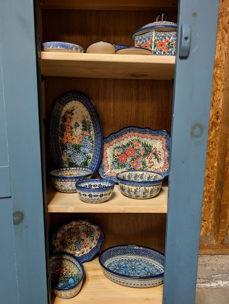 Jelly Cabinet, Bench, Polish Pottery. Blue painted jelly cab with three shelves, 23"Wx11"Dx51"H; wood bench, 35"Lx13"Dx17"H; 15 pcs Polish Pottery, incl: bowls, platters, dishes, covered crock, spoon rest (see photos for details); items seen on top of cab. Loc in garage.