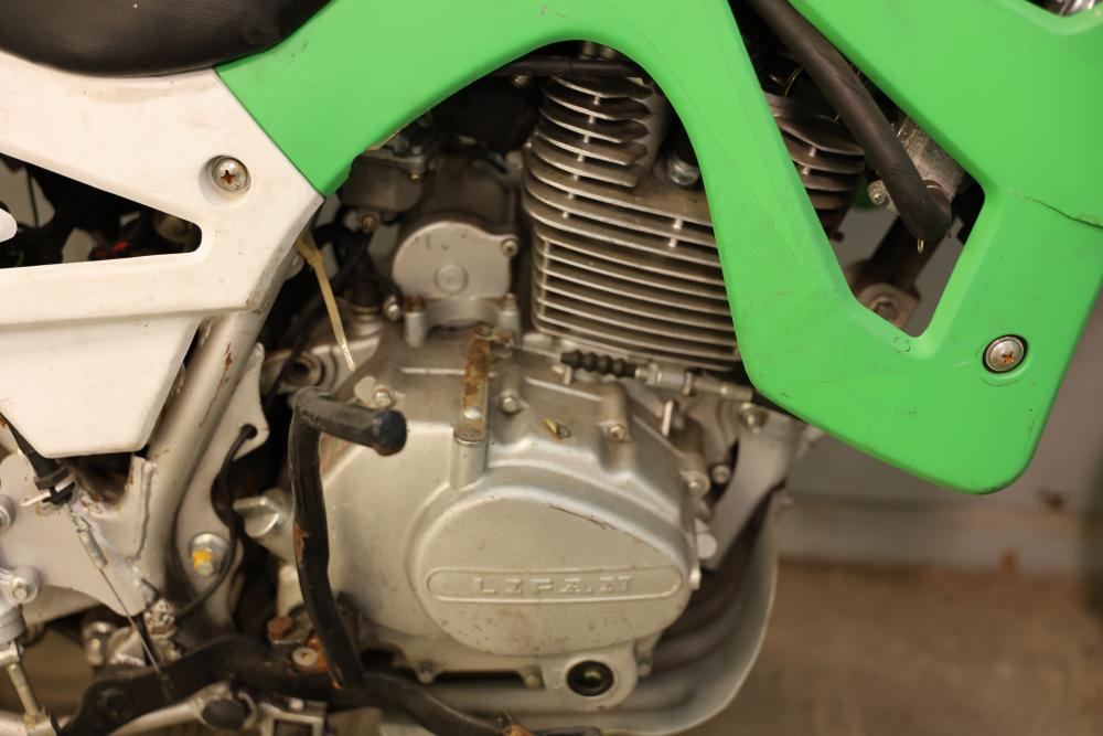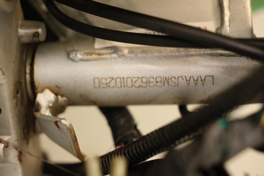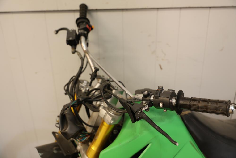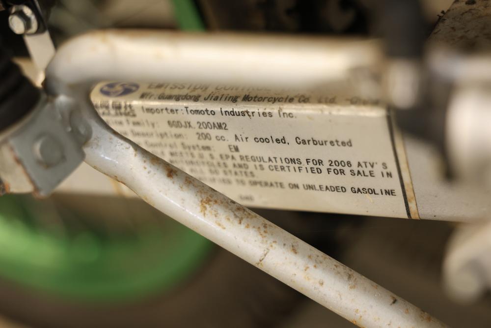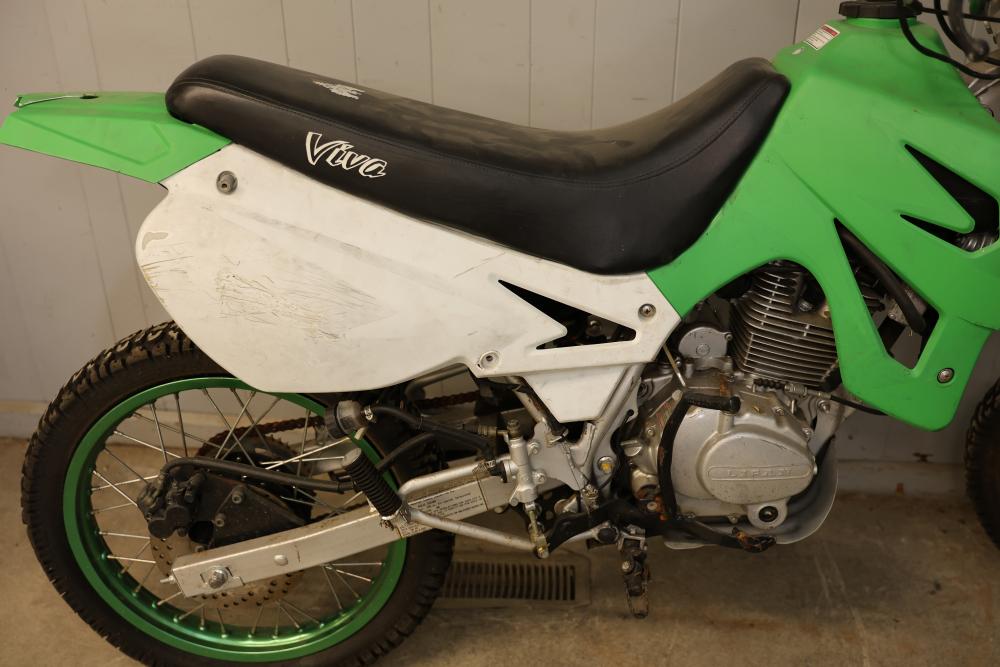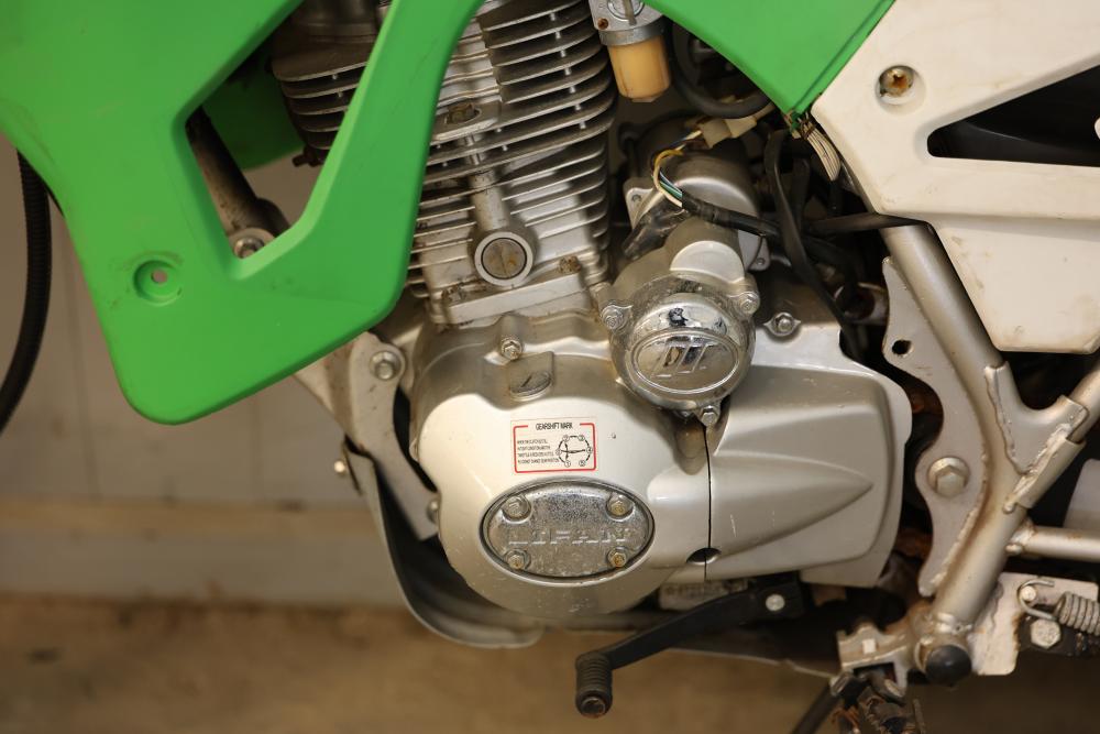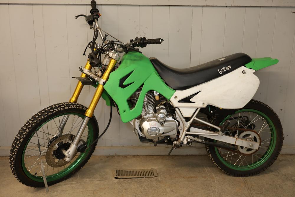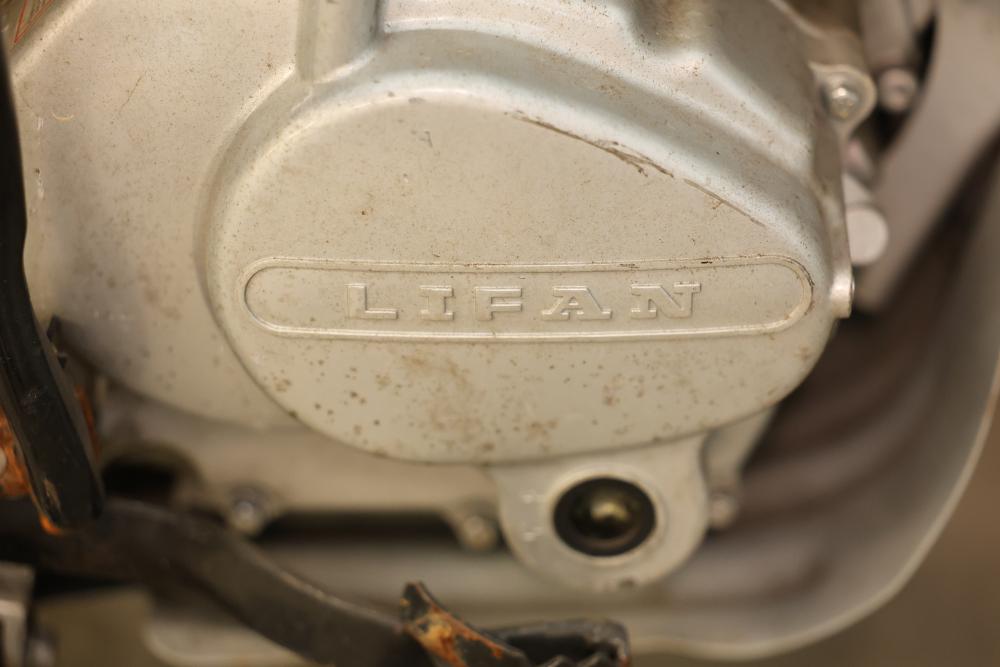Dirt Bike with Lifan 200 cc 5-Speed Manual 4-Stroke Engine. VIN# LAAAJSMB362010250. Features a 26 inch front wheel and a 23 inch rear wheel. The bike is missing its headlight and has cracked body panels in several areas. It has no title and no key and is intended for off-road usage. Pickup only.