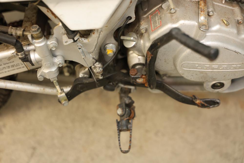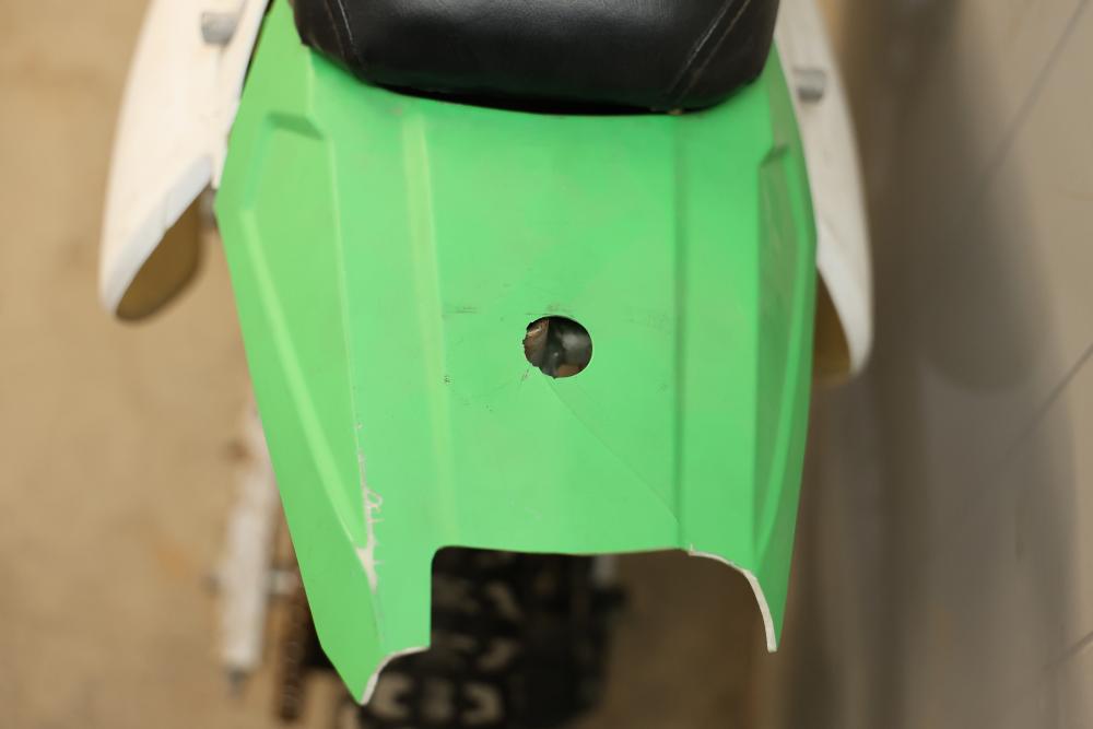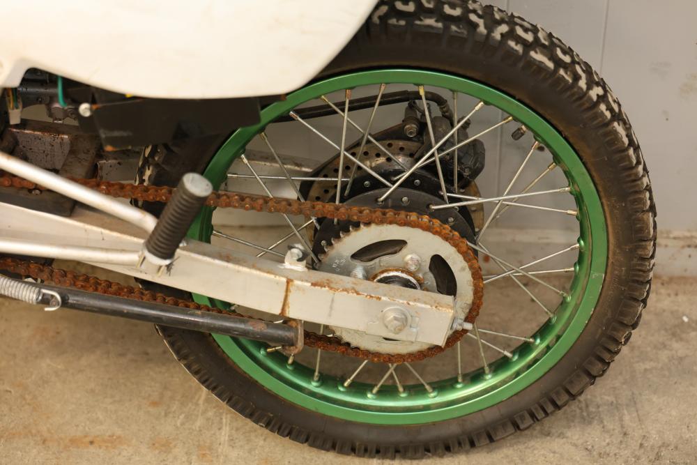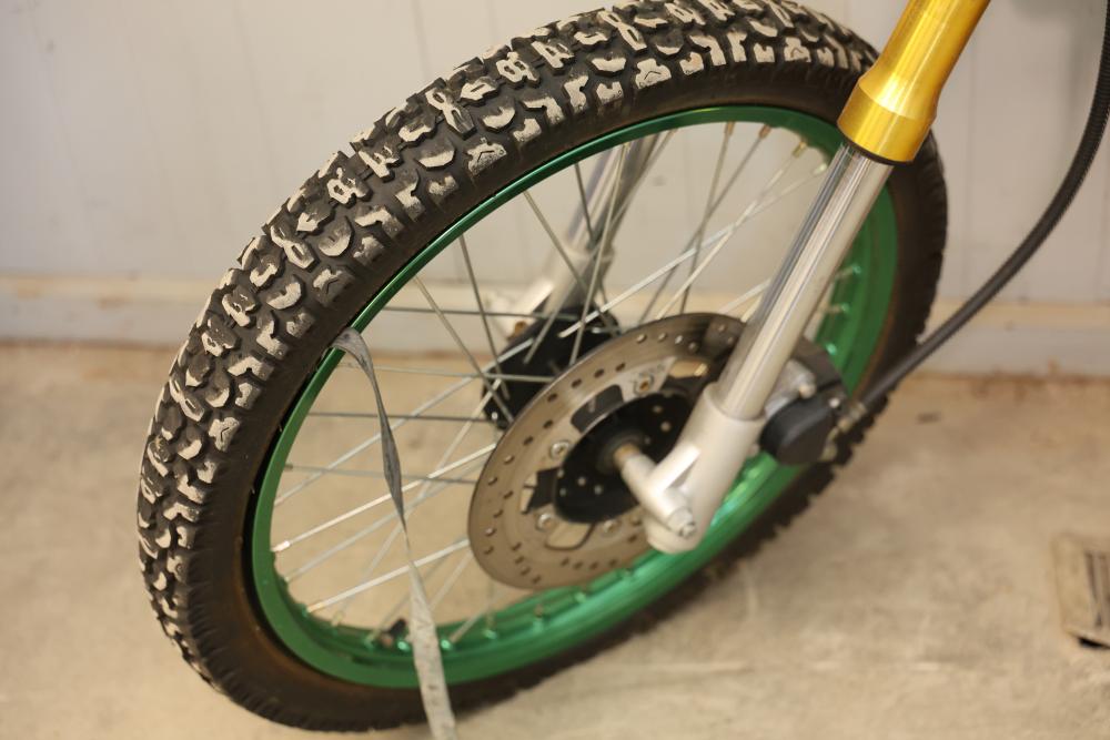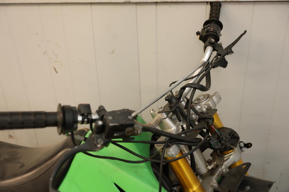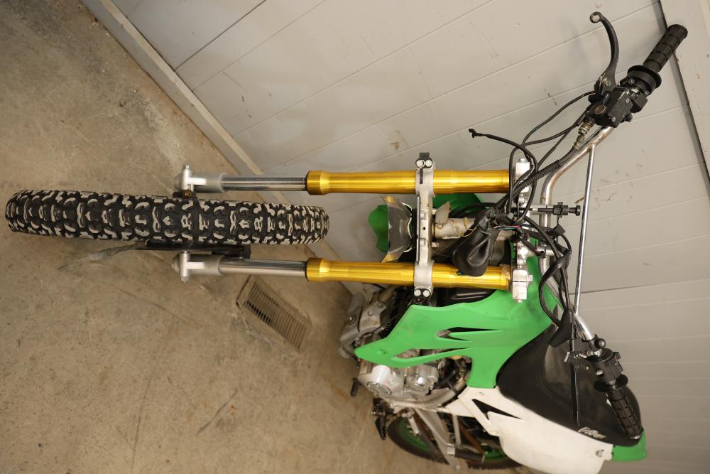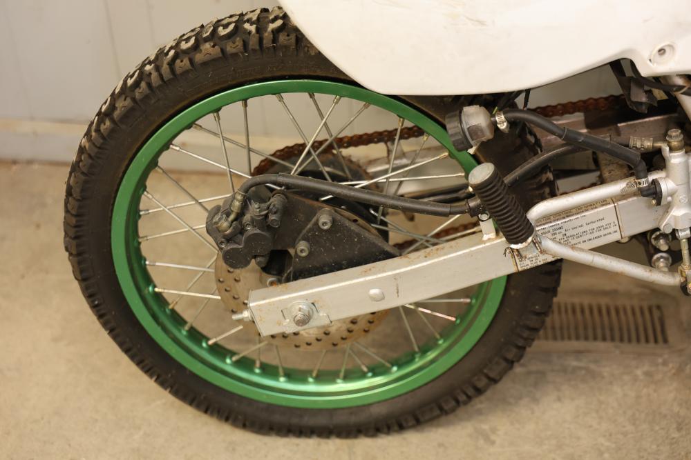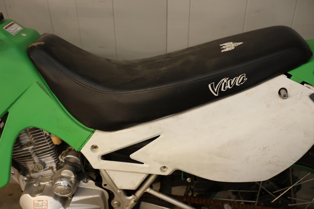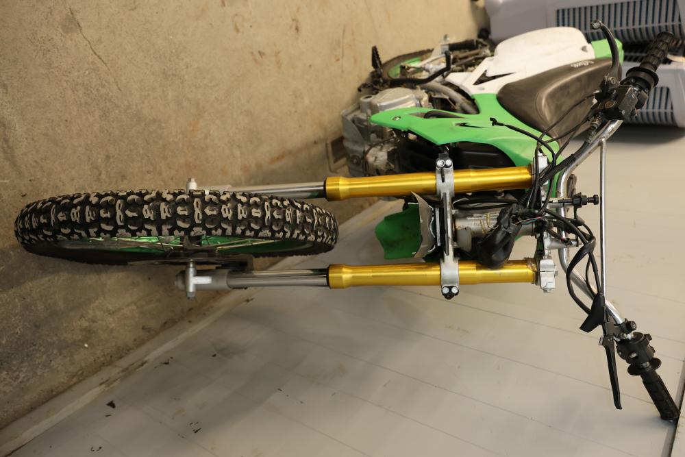 Dirt Bike with Lifan 200 cc 5-Speed Manual 4-Stroke Engine. VIN# LAAAJSMB362010250. Features a 26 inch front wheel and a 23 inch rear wheel. The bike is missing its headlight and has cracked body panels in several areas. It has no title and no key and is intended for off-road usage. Pickup only.