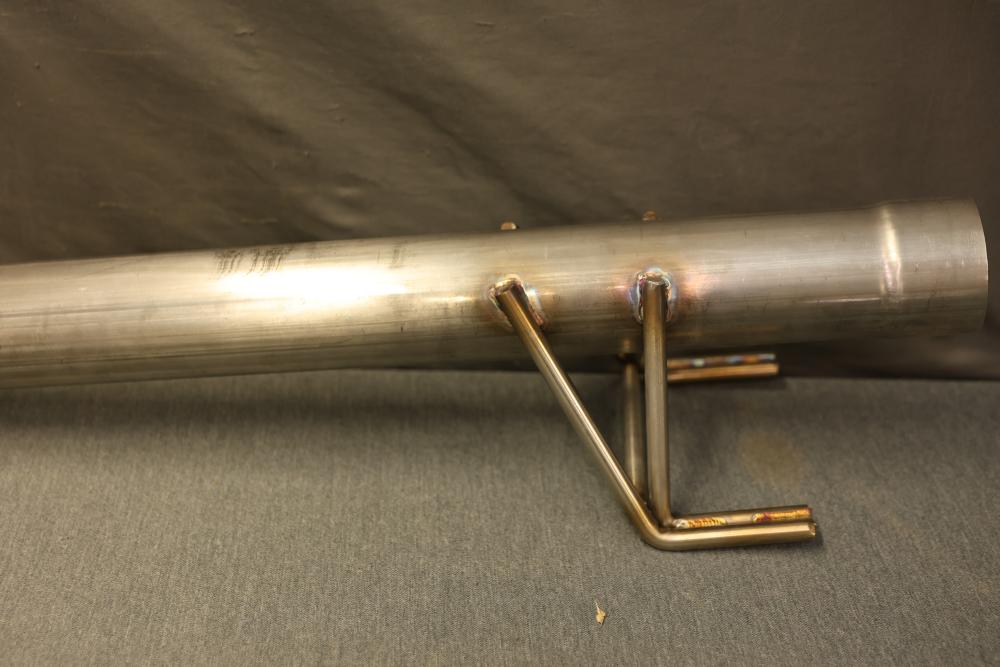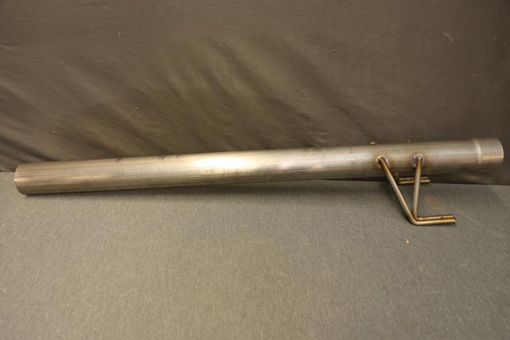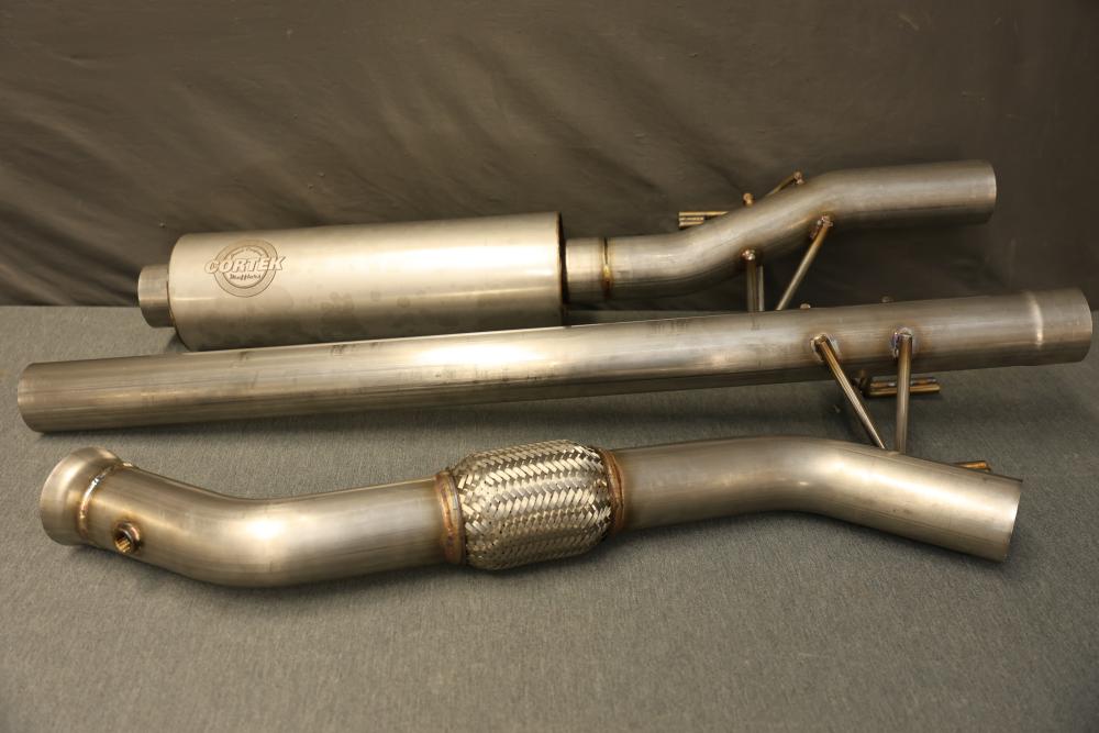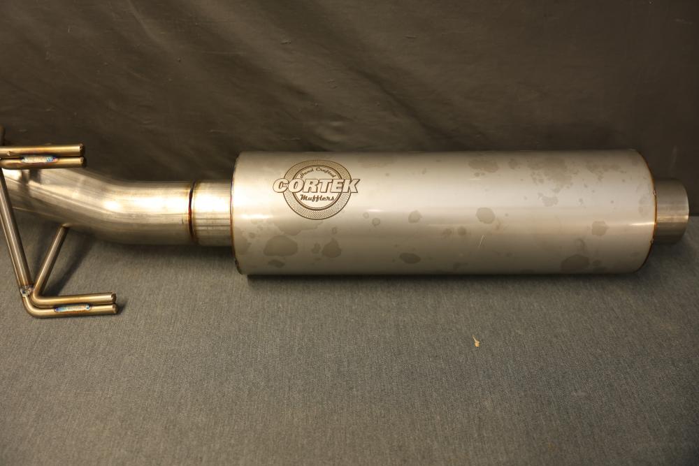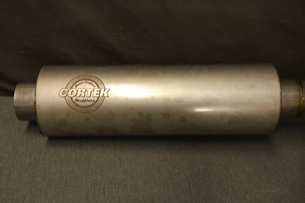 Cortex Muffler 45 Series Round 4518CC3030, 3 Inch Diameter, 18 Inch Body Length, 22 Inch Overall Length. Includes muffler and additional exhaust components, as shown. Made of metal, showing some surface markings. Suitable for specific exhaust system configurations. Pickup only.