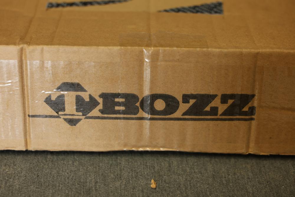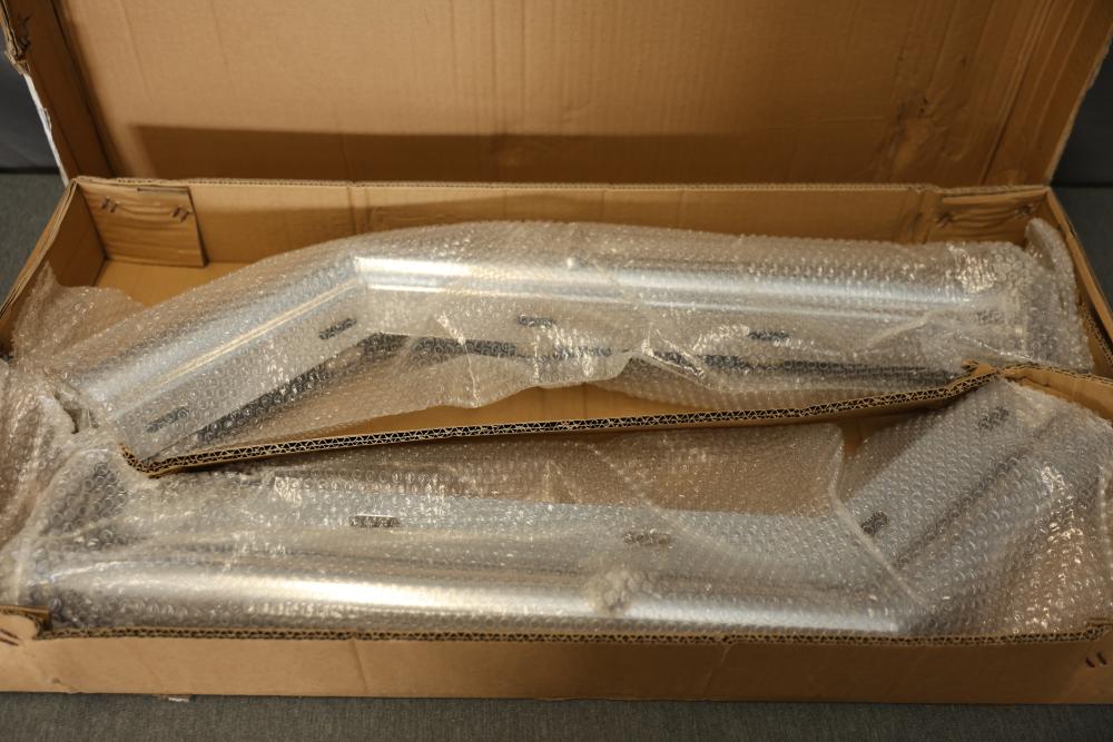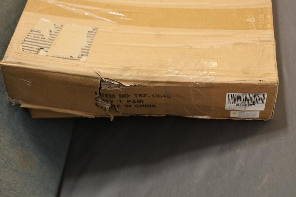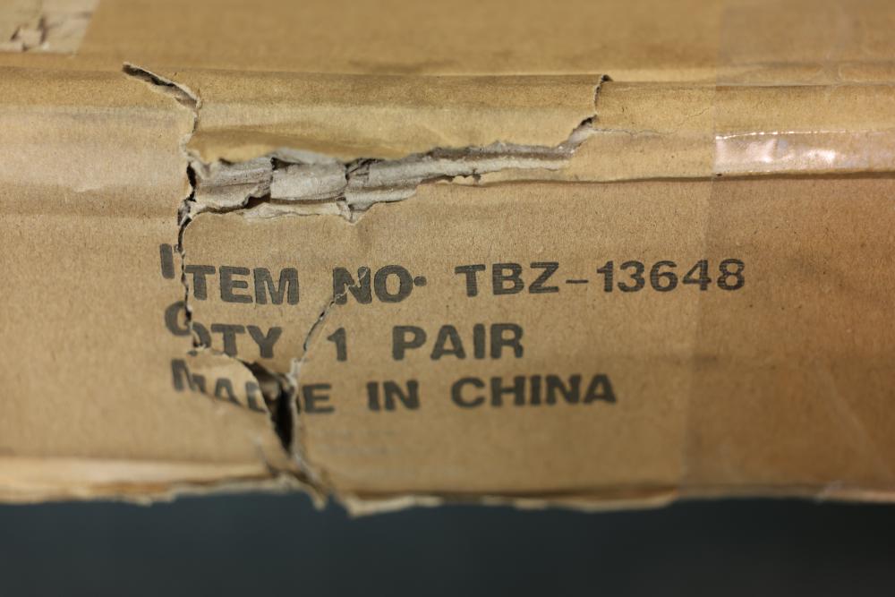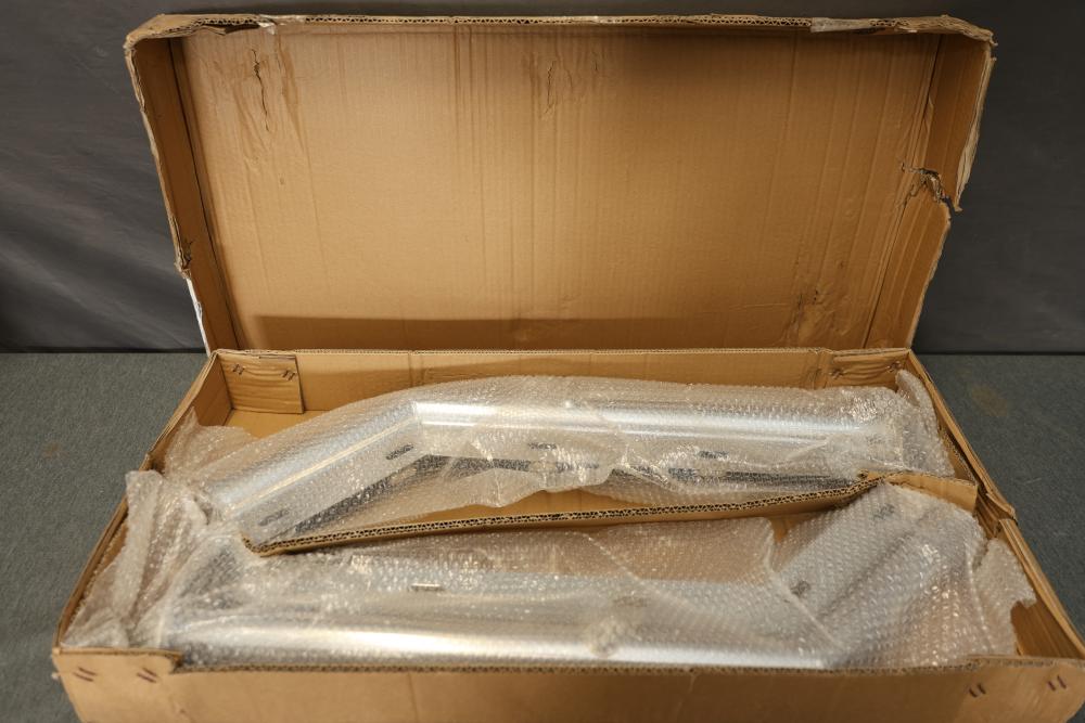 TBOZZ Chrome Angled Spring Loaded Mud Flap Hanger in a round tube style, measuring 27 inches long with a 1.125-inch belt spacing. Packaged in its original box, showing signs of wear but with contents intact.