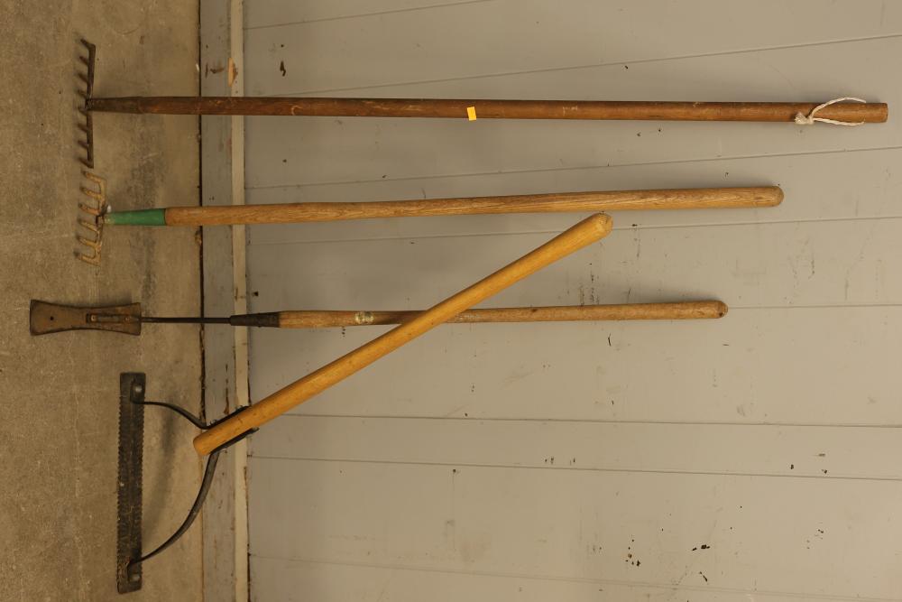Gardening Tools Including Hoe, Pickaxe, Fork, Rake, Axe, and Scythe. Comprises a selection of wooden and metal tools suitable for tasks like digging, raking, chopping, and general yard maintenance. Tools show signs of wear consistent with use. Pickup only.