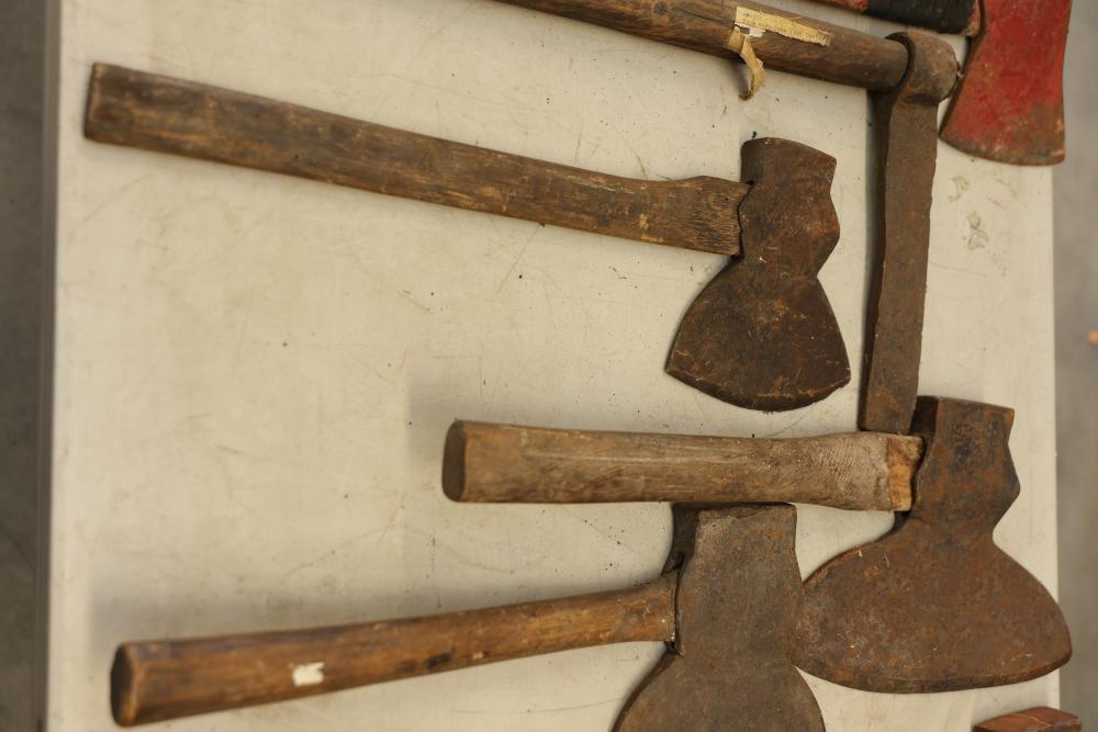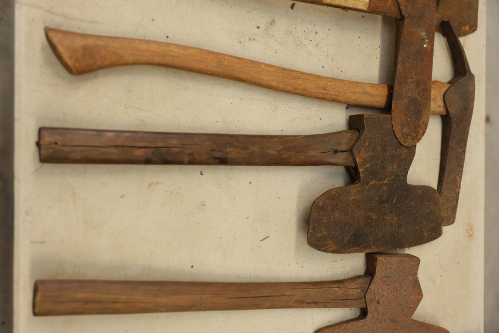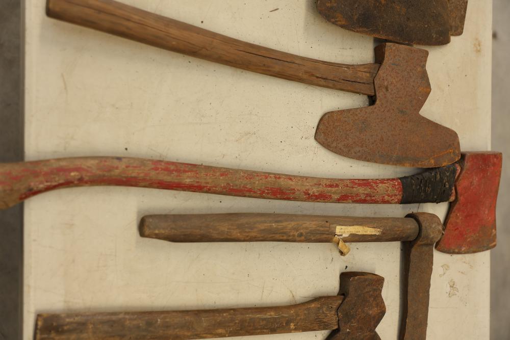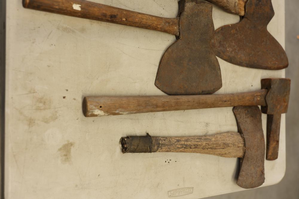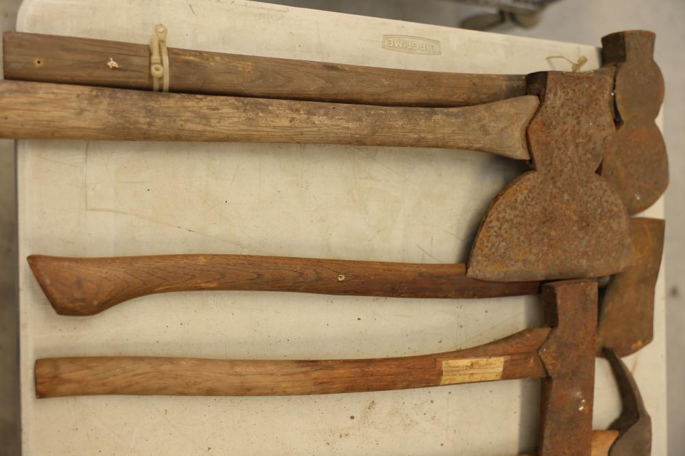 Vintage Axe Set Featuring Wooden Handles and Metal Heads. Includes multiple axes with various blade styles and handle lengths. The axes show wear and patina consistent with age and use. Pickup only.