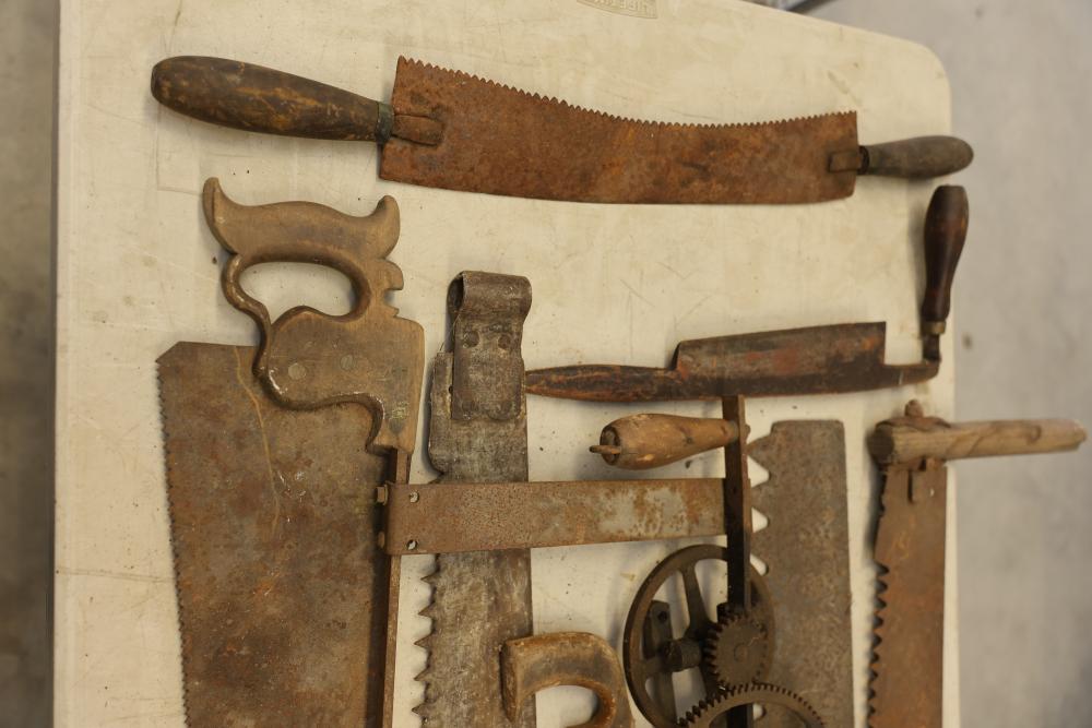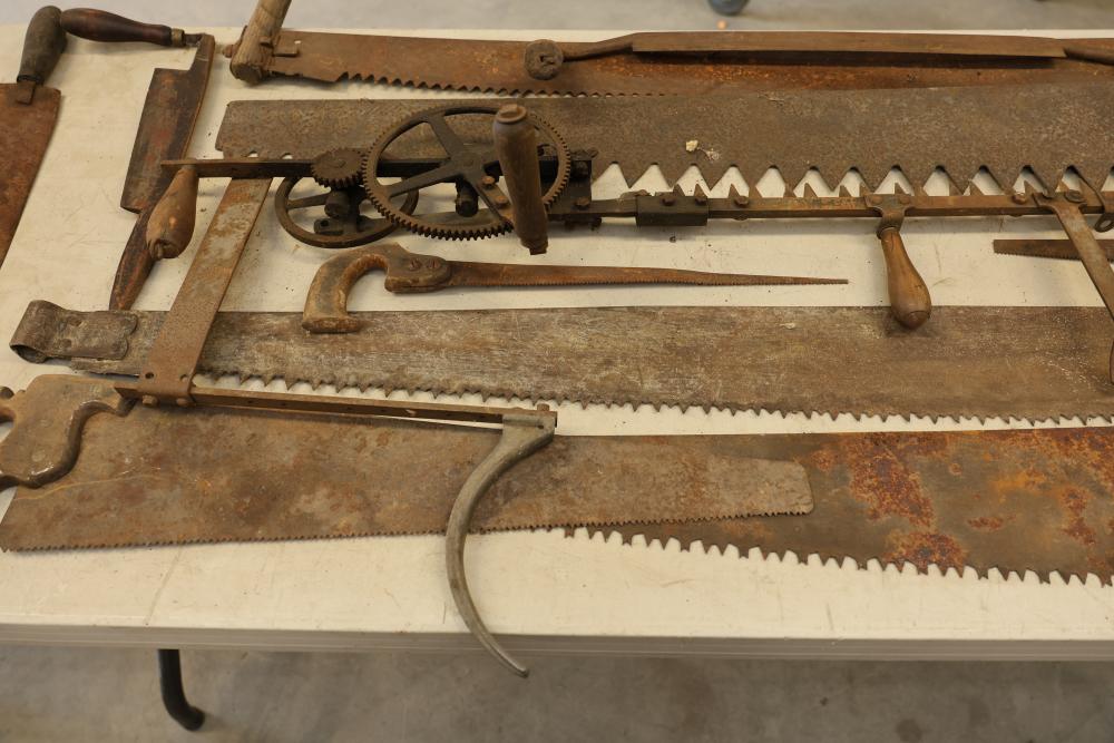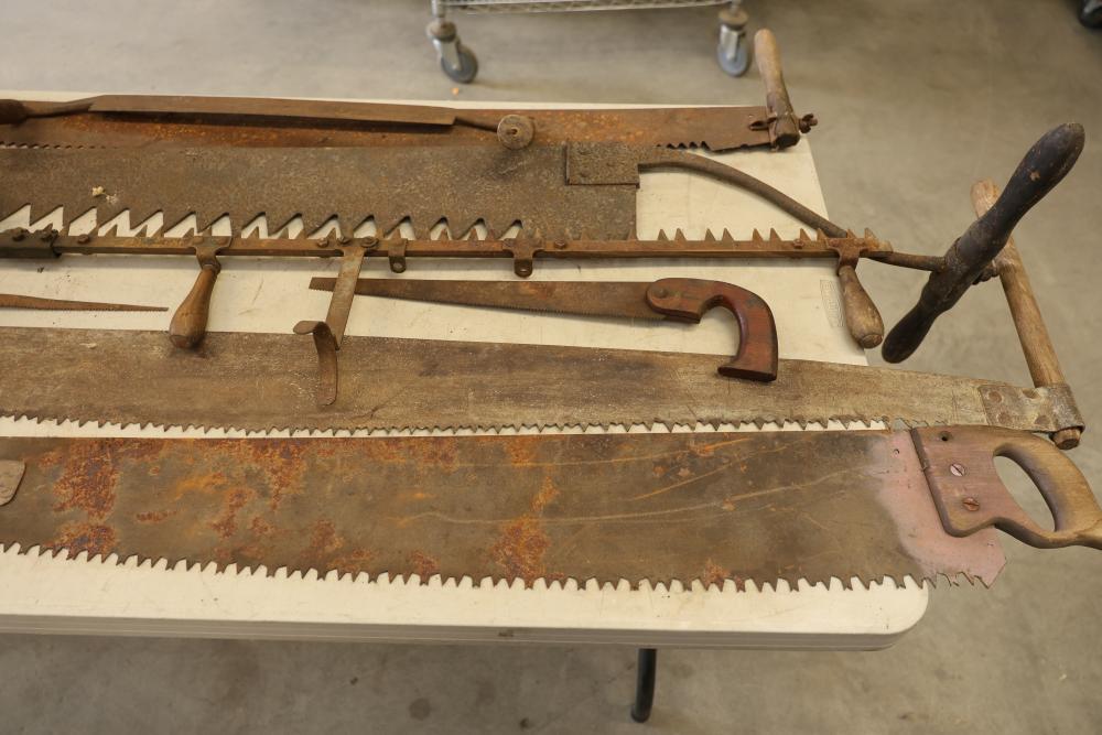 Vintage Hand Saw Set with Assorted Tools. Includes multiple hand saws with wood and metal handles, some showing natural wear and rust consistent with age and use. Features a variety of blade styles and designs, including large crosscut saws and smaller hand saws. Pickup only.