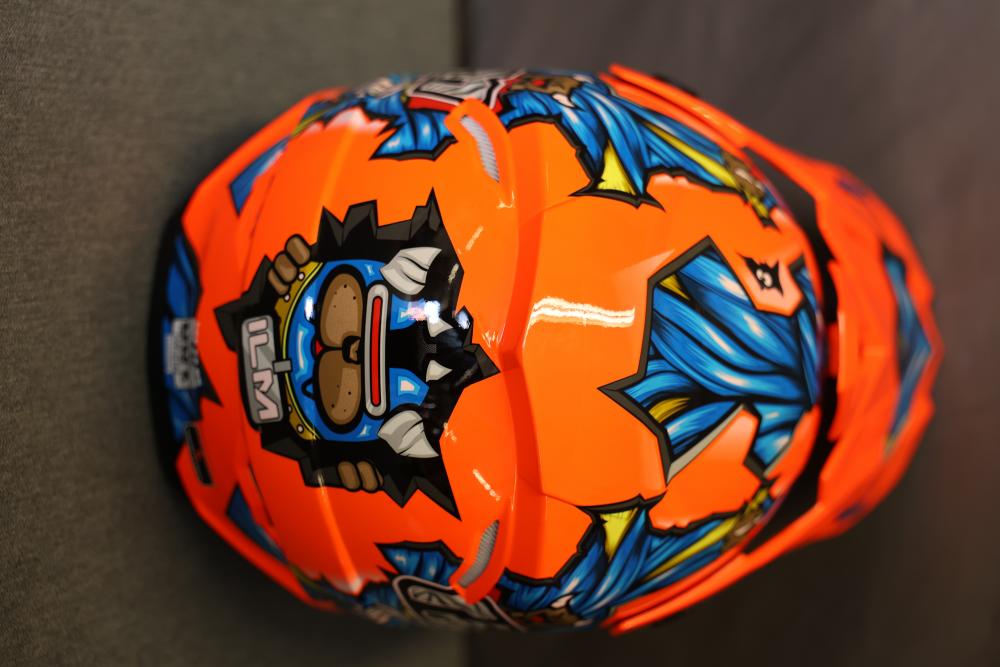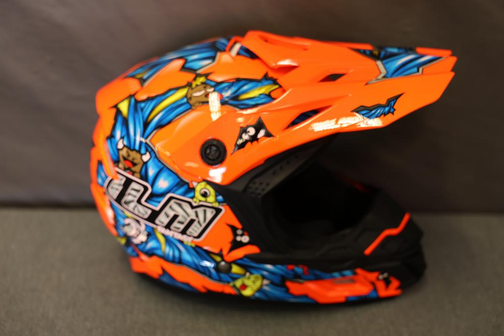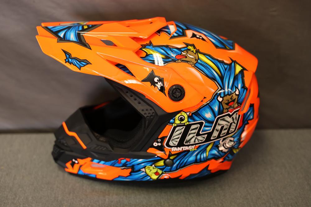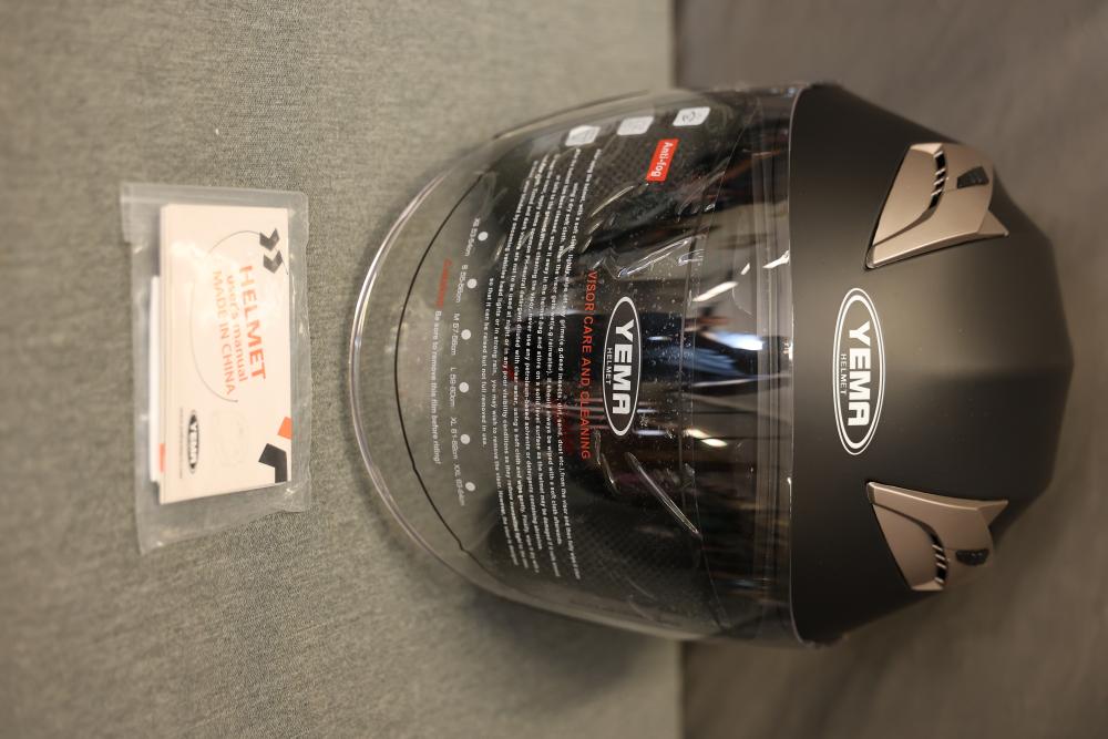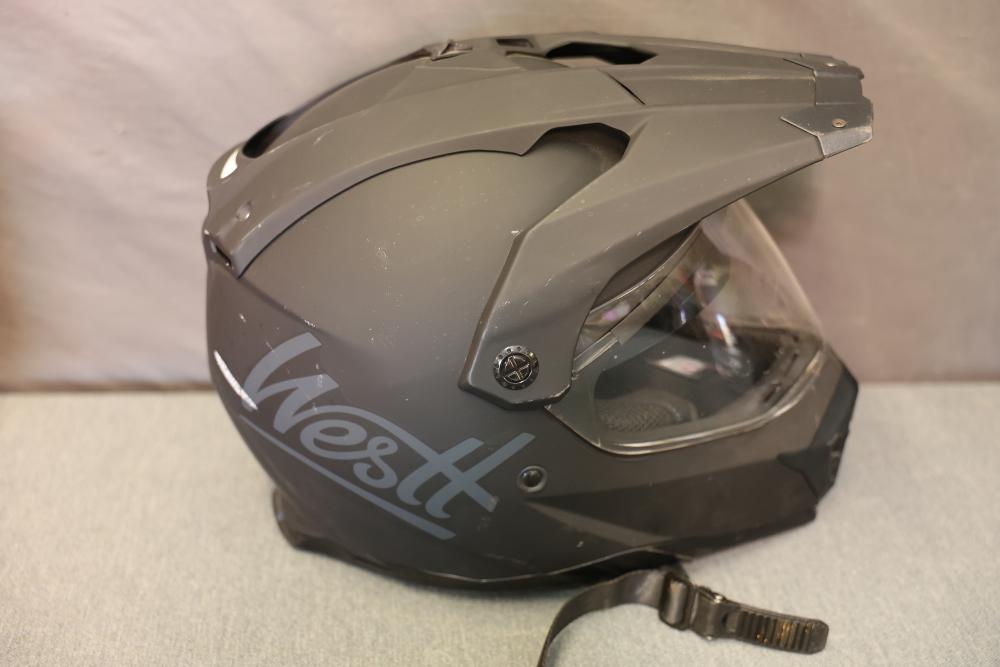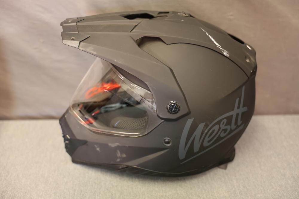 Motorcycle and biking helmets featuring Westt, ILM, and Yema. Includes a matte gray full-face Westt helmet, an orange ILM helmet with graphic designs, and a black Yema helmet with a clear visor. The Yema helmet comes with its original pouch and paperwork. Pickup only.