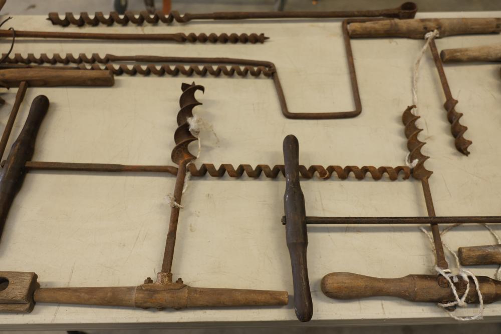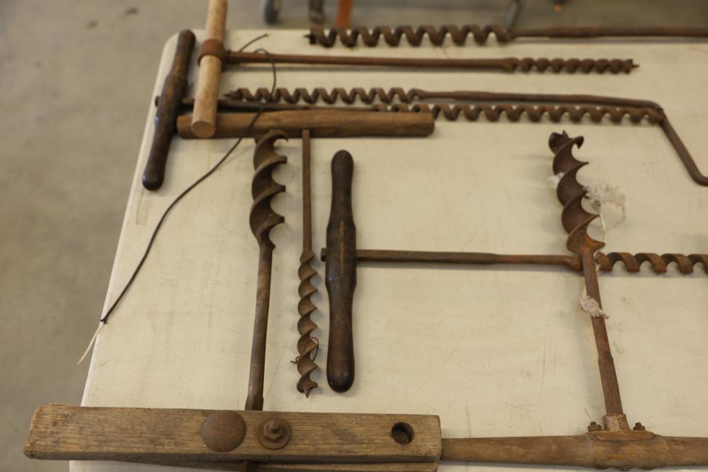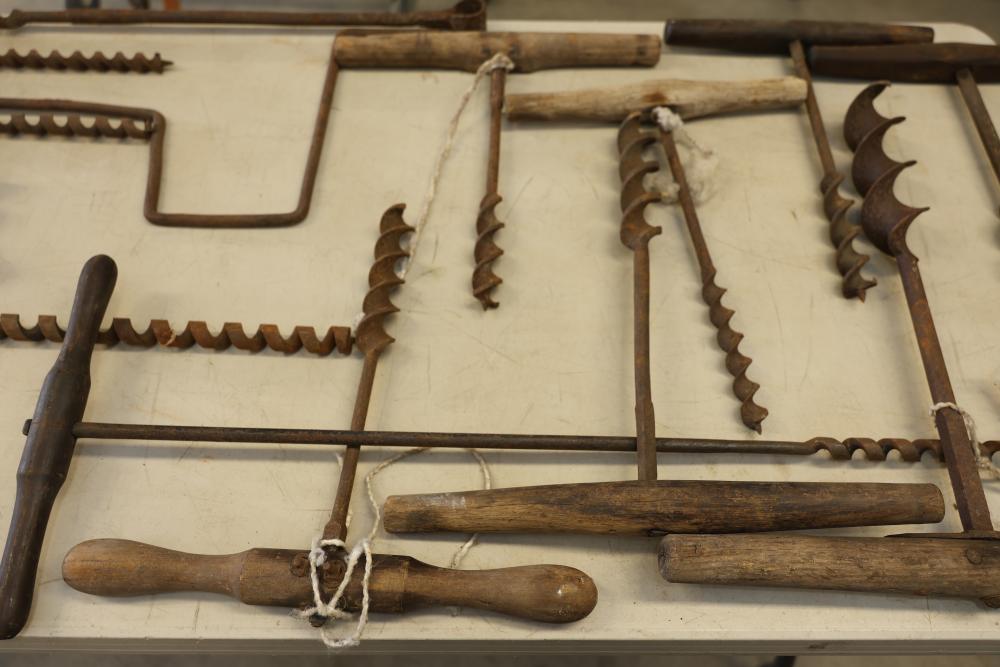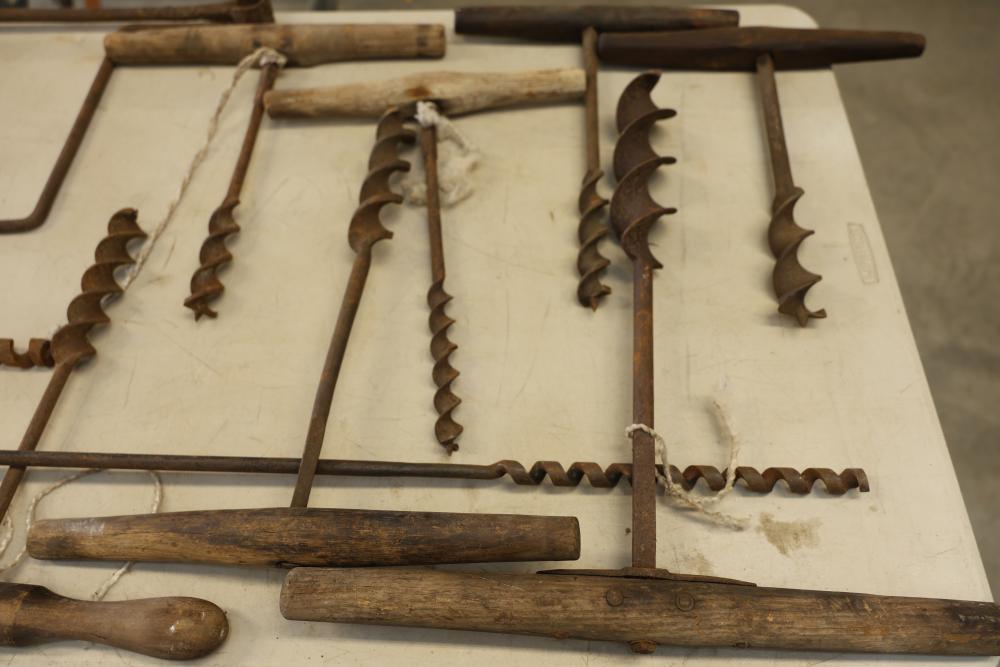 Vintage T-Handle Drill Augers, featuring a selection of auger bits with wooden T-handles and steel shafts. Includes various sizes and shapes of augers, showcasing aged patinas and wear consistent with use and age. Ideal for display or restoration projects. Pickup only.