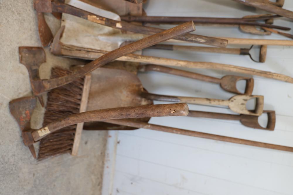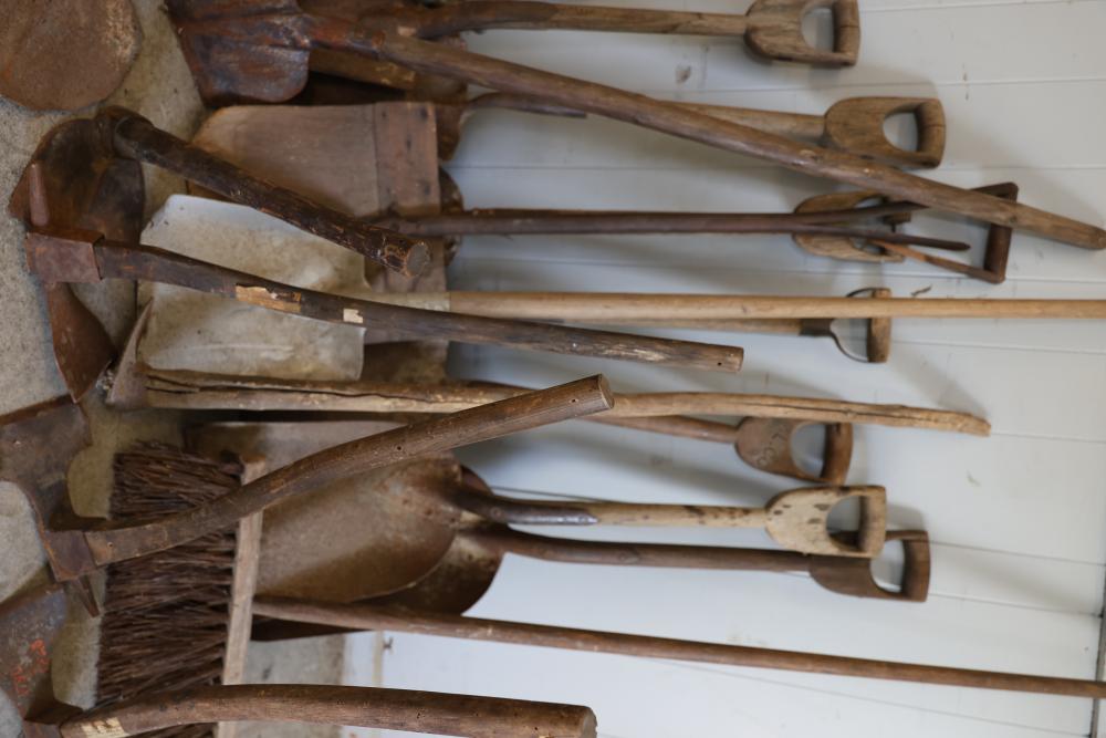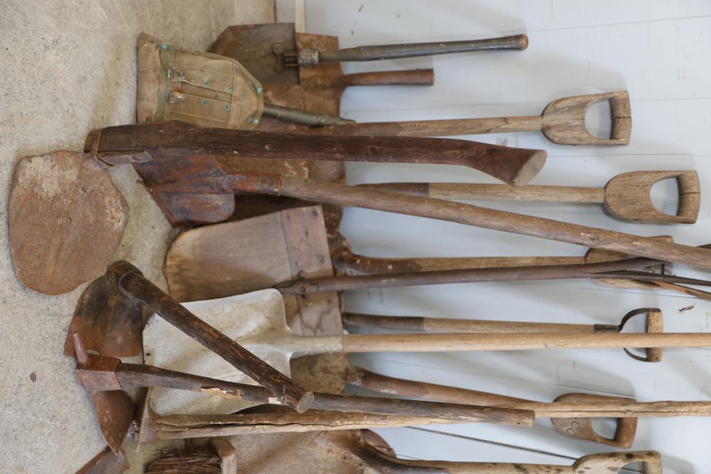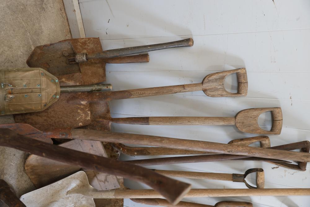 Vintage Shovels with Wooden Handles and Metal Blades. A group featuring multiple tools including shovels of differing head shapes and styles, along with a broom and digging tools. Strongly weathered condition with rust observed on metal parts and wear to the wooden handles. Pickup only.