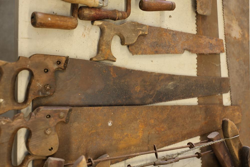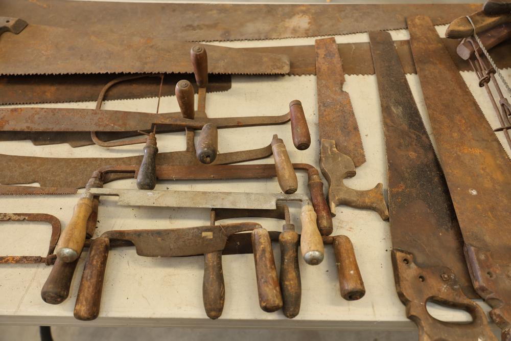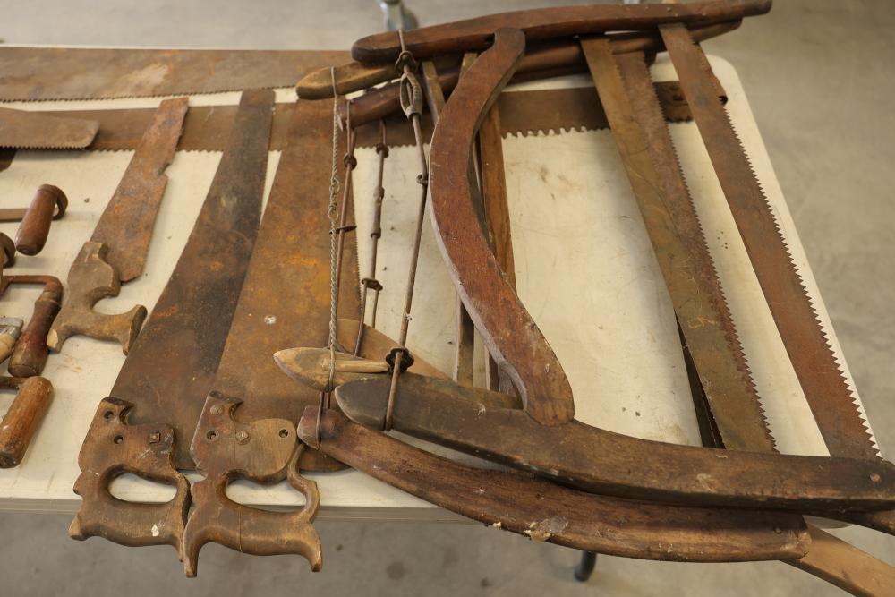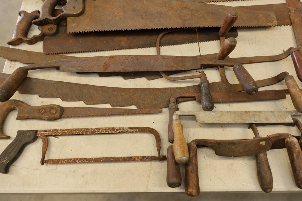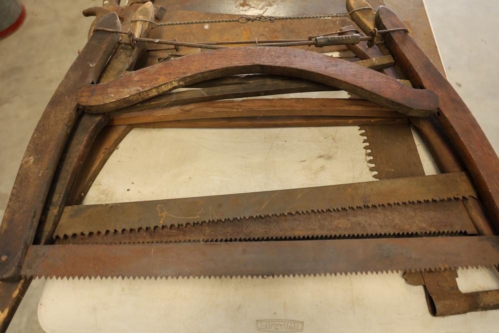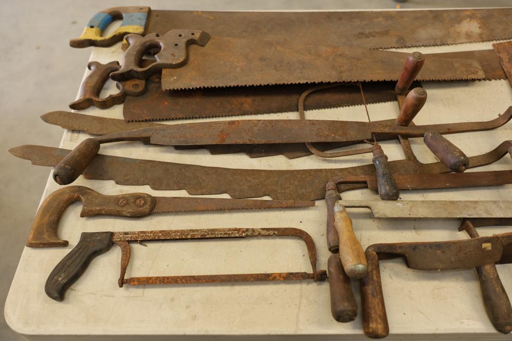 Vintage Hand Saw Set Featuring Assorted Saws and Tools. Includes multiple hand saws, bow saws, and other tools with wooden handles. The tools exhibit notable rust and wear consistent with age and prior use. A unique find for tool enthusiasts or restoration projects. Pickup only.