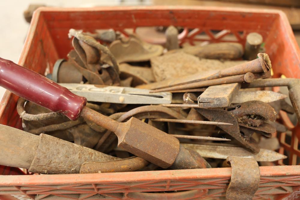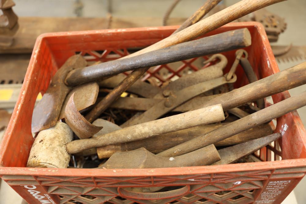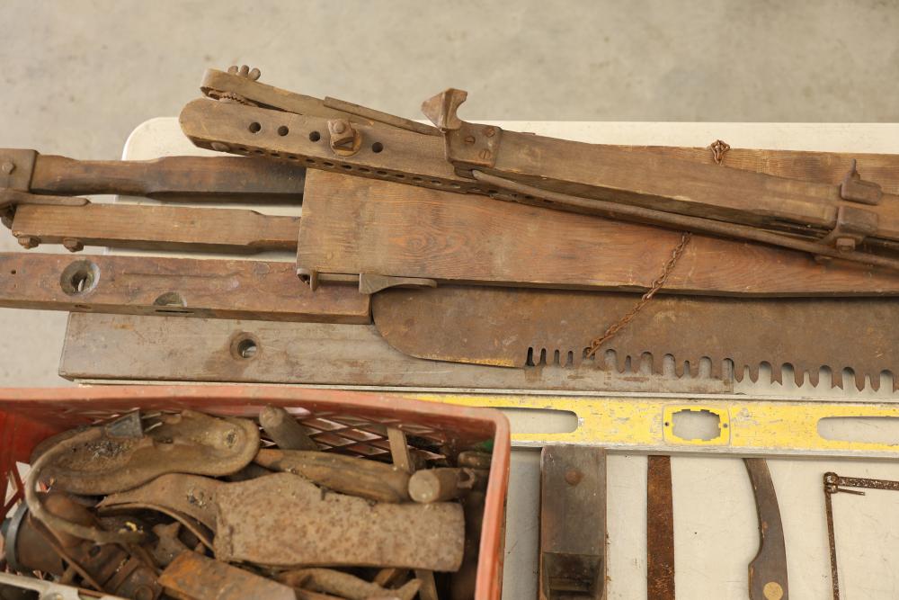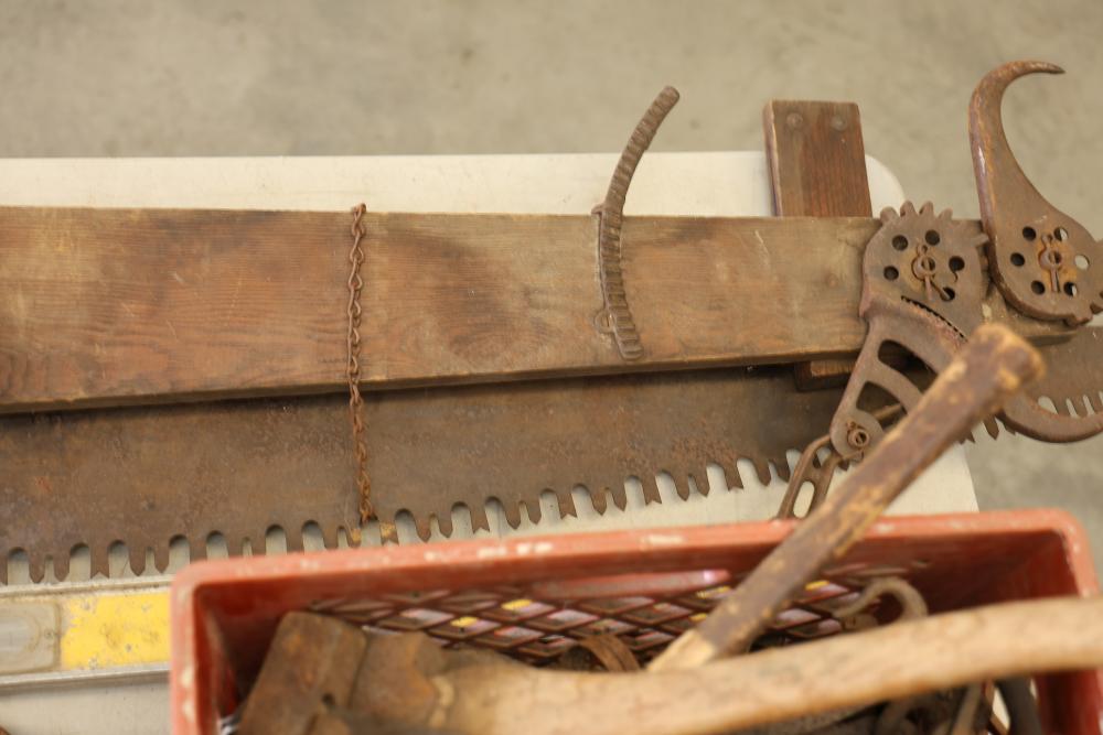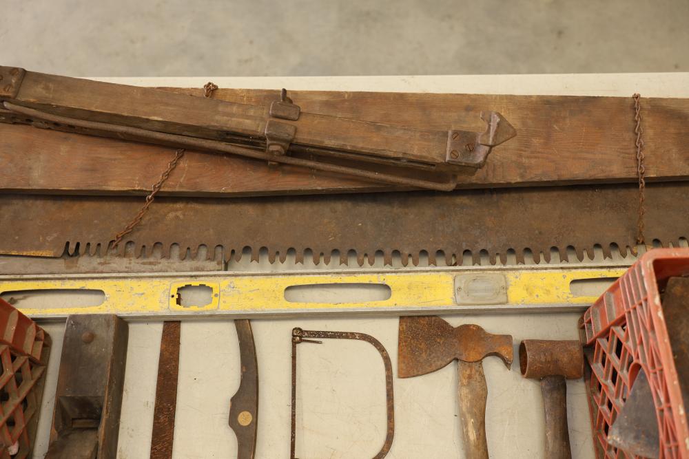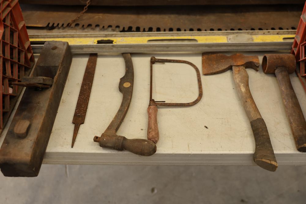 Vintage Hand Tools Including Hand Saws, Hammers, and Axes. A selection of tools featuring hand saws, hammers, axes, and other implements. The grouping includes items visibly aged with wear consistent with prior use. Pickup only.