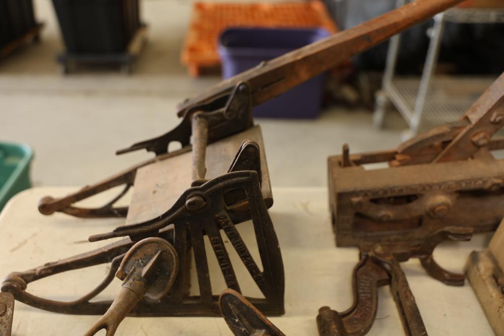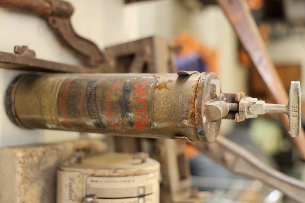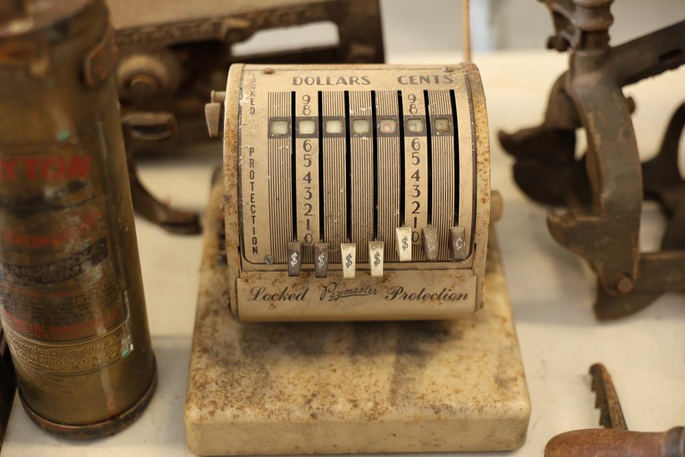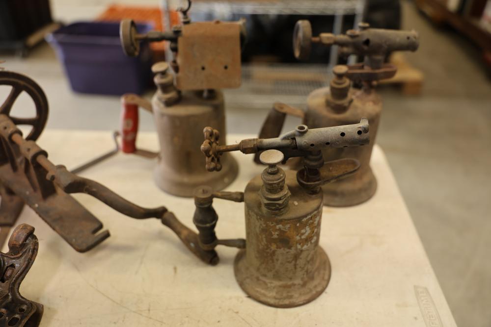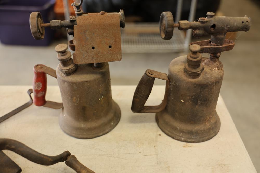 Vintage Blowtorches, Fire Extinguisher, and Paymaster Check Writer Machine. Includes metal blowtorches with wear and patina, a vintage fire extinguisher showing visible age and label wear, a Paymaster Check Writer machine with mechanical components intact, and assorted additional metal tools with visible rust and wear consistent with age. Pickup only.