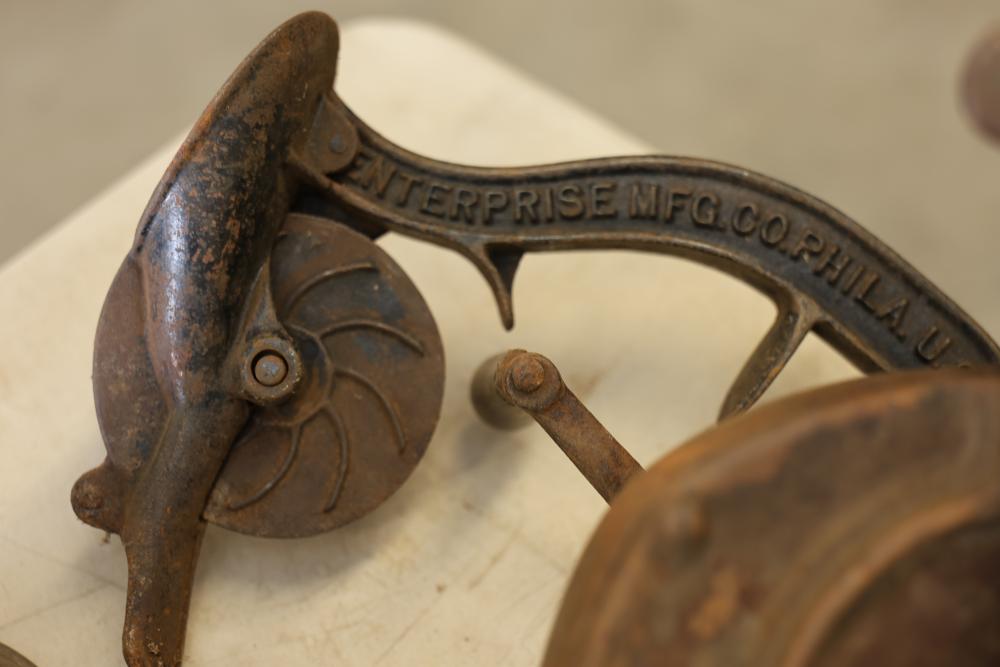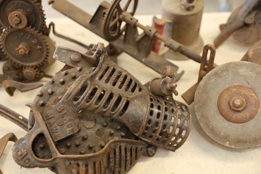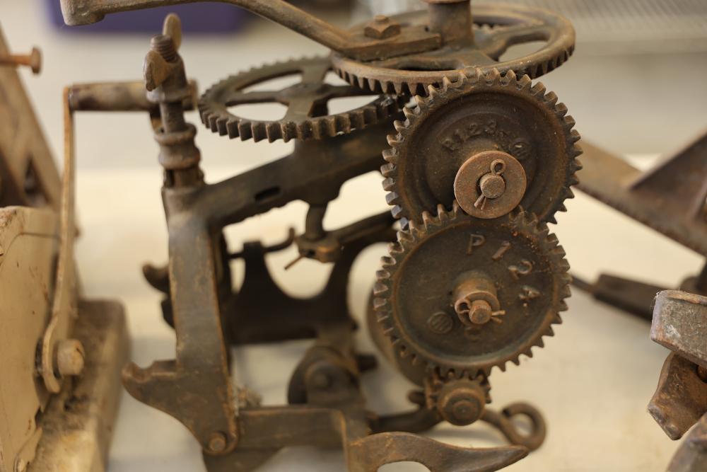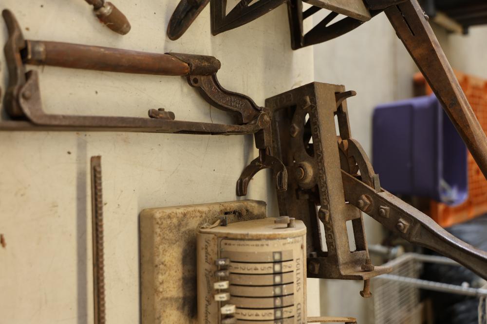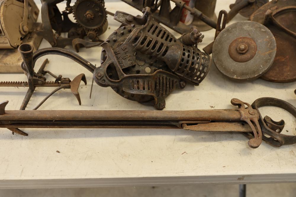 Vintage Blowtorches, Fire Extinguisher, and Paymaster Check Writer Machine. Includes metal blowtorches with wear and patina, a vintage fire extinguisher showing visible age and label wear, a Paymaster Check Writer machine with mechanical components intact, and assorted additional metal tools with visible rust and wear consistent with age. Pickup only.