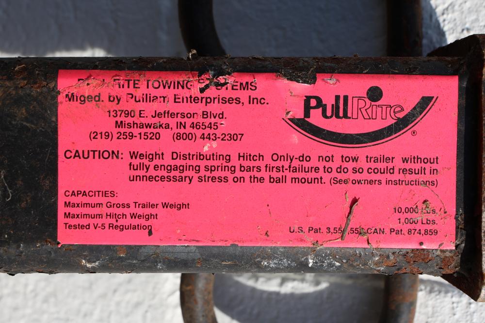 PullRite Towing Systems Weight Distributing Hitch with a 2-inch square receiver opening and a total length of 52 inches. Labeled for a maximum gross trailer weight of 10,000 lbs and a maximum hitch weight of 1,200 lbs. Includes adjustment features for effective towing weight distribution. Pickup only.