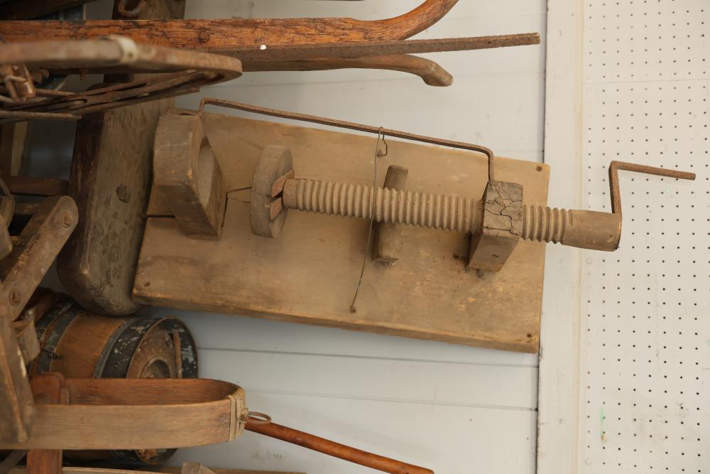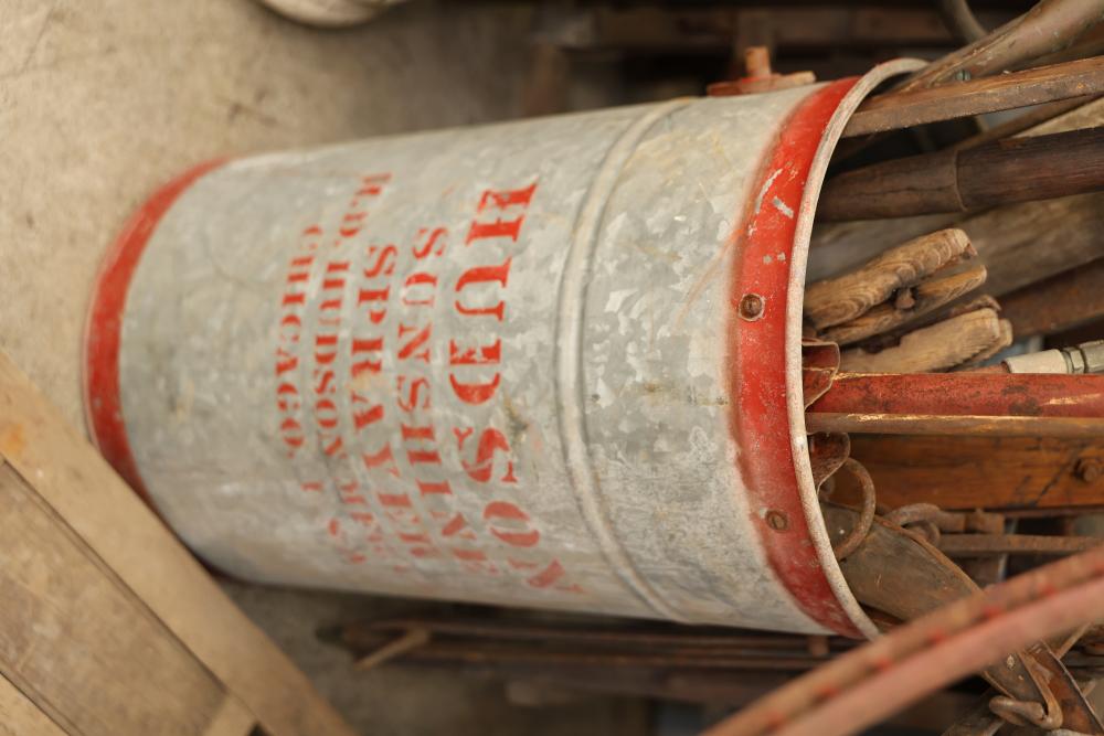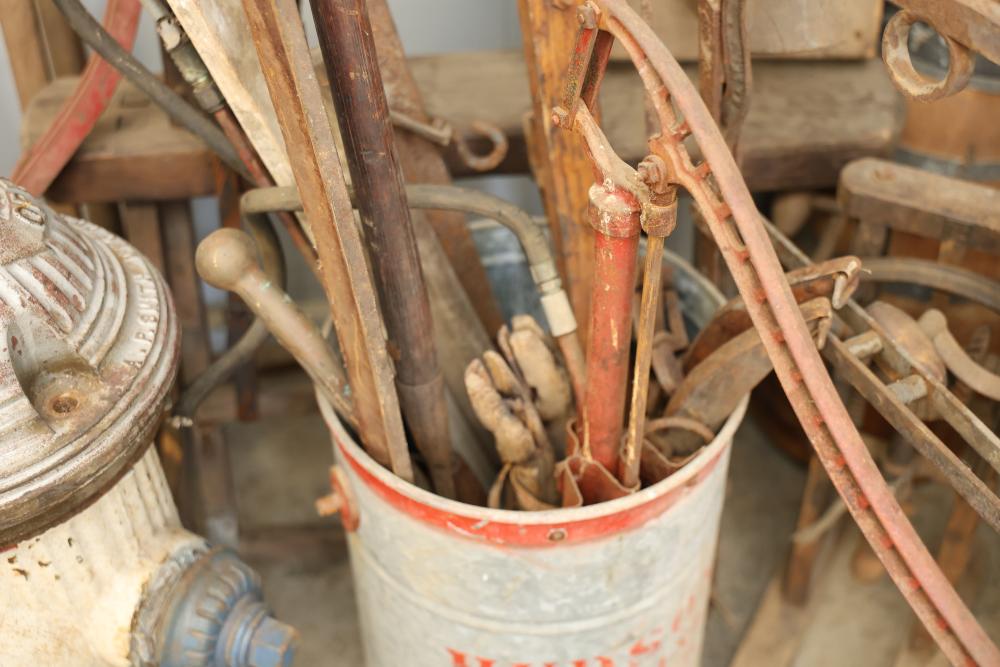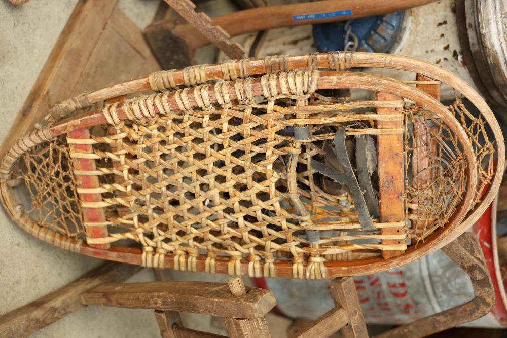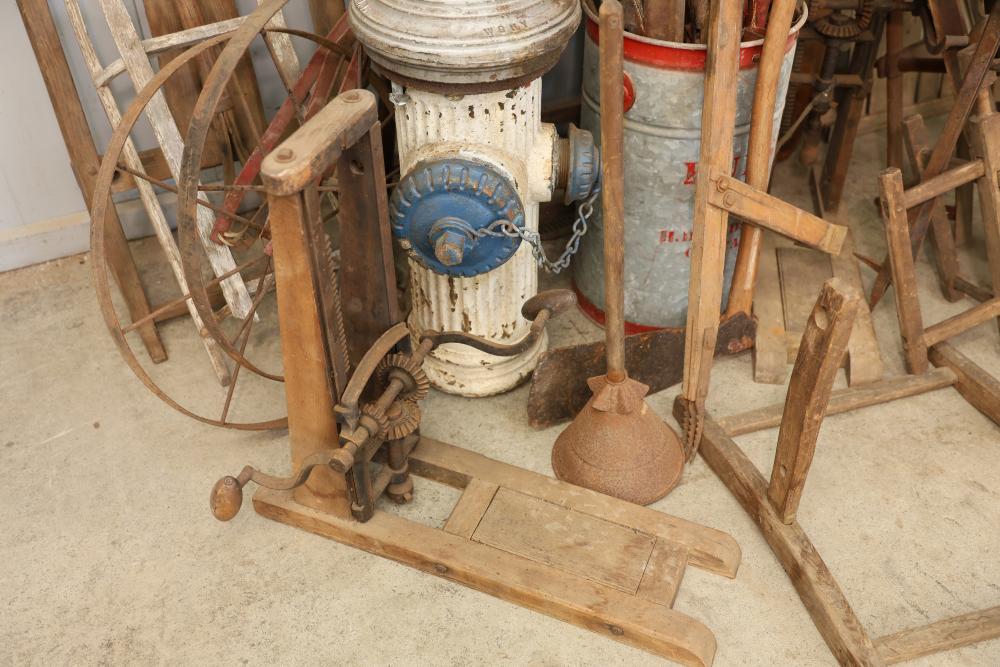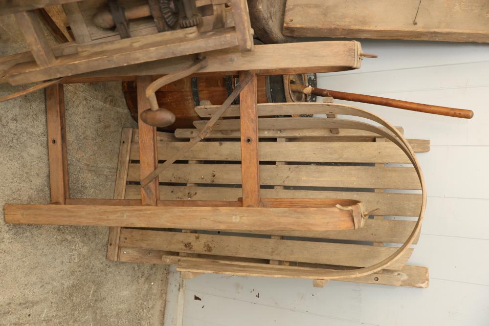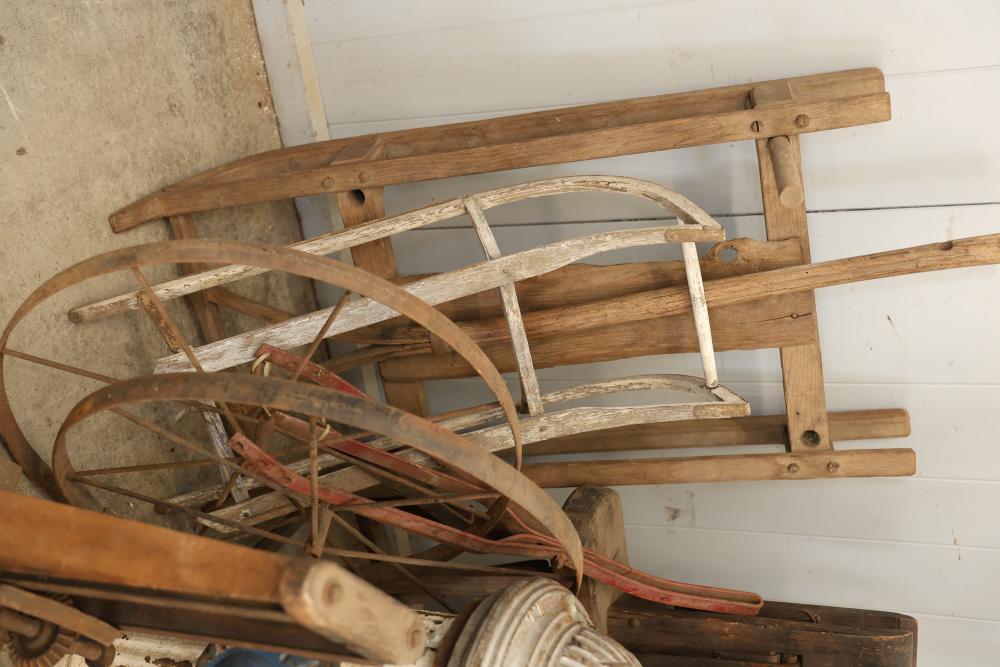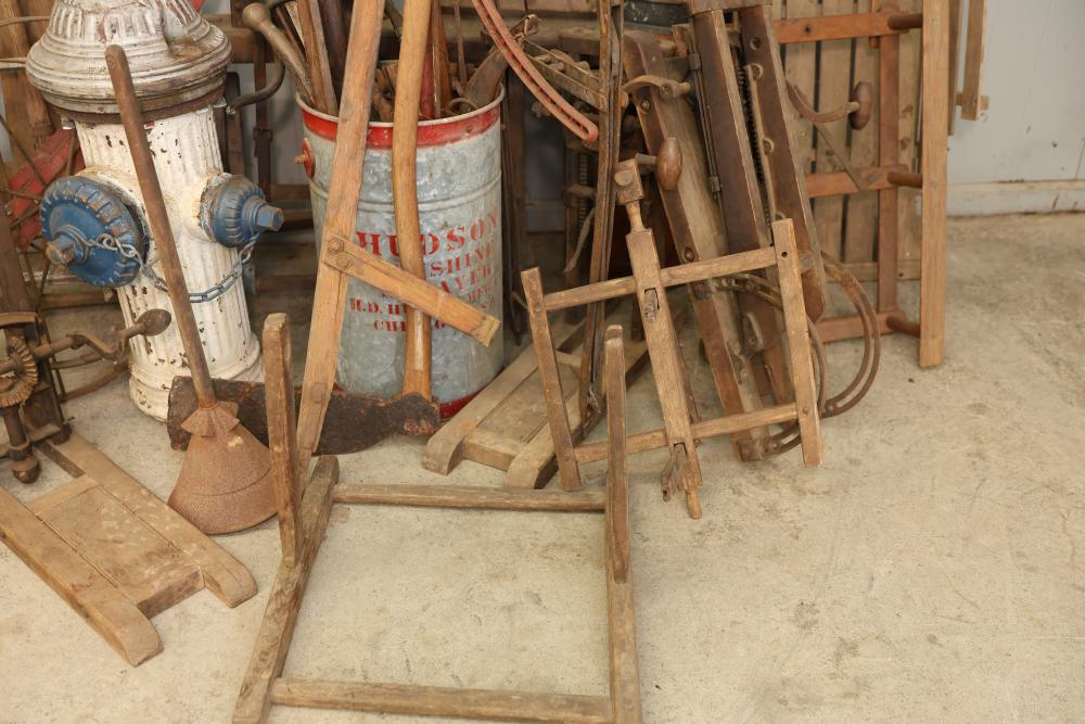 Vintage tools and items including sleds, snowshoes, fire hydrant, and more. Items feature a mix of wooden sled frames, snowshoes, a fire hydrant, Hudson Sunshine sprayer, and various wooden frames and tools. Pickup only.