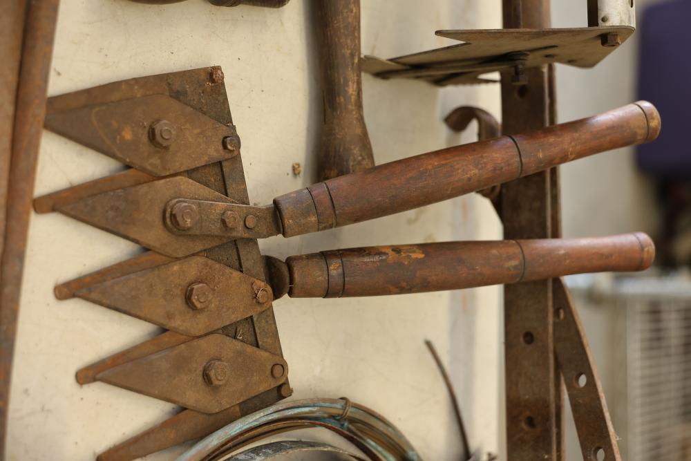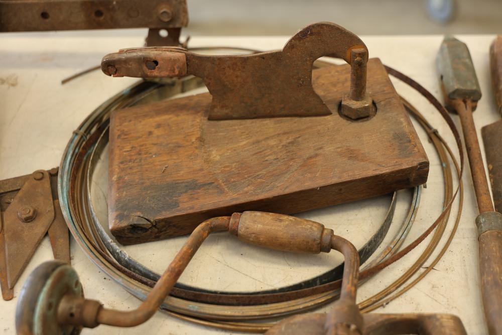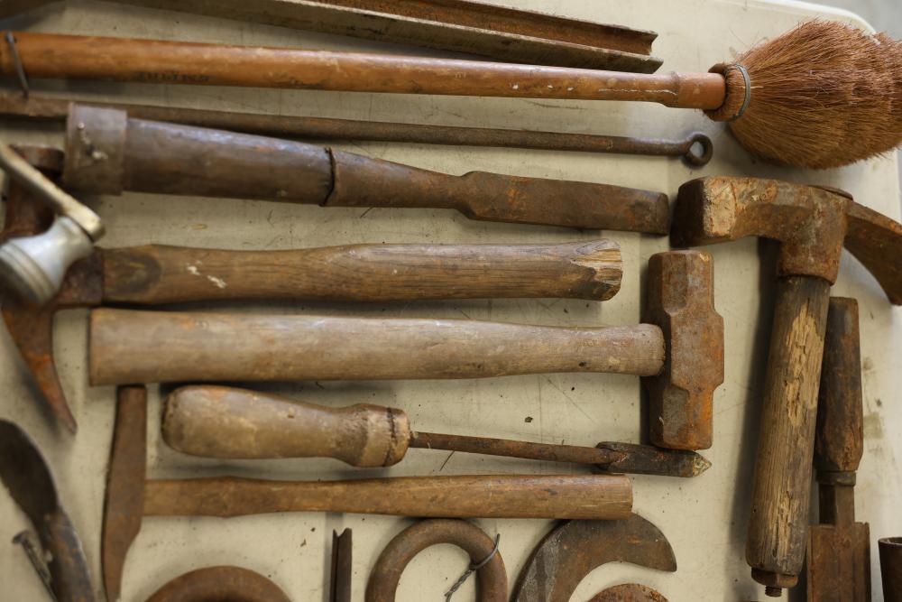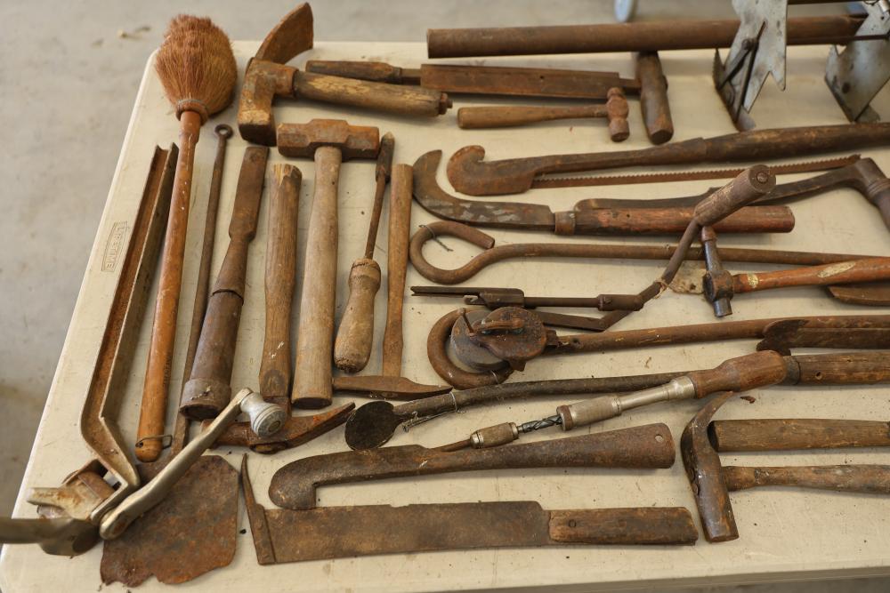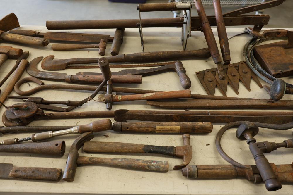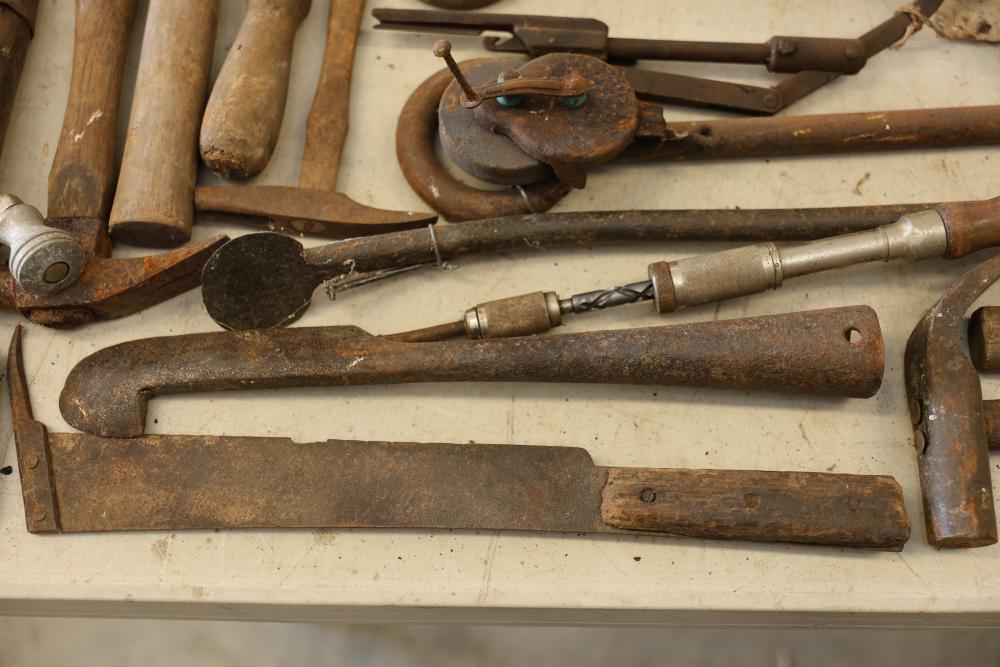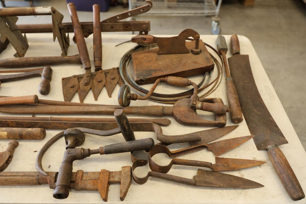 Vintage hand tools including wrenches, planes, nail pullers, saws, and hammers. The assortment features a variety of woodworking and construction tools in aged condition, showcasing signs of use and wear consistent with their age. Ideal for restoration or display purposes. Pickup only.