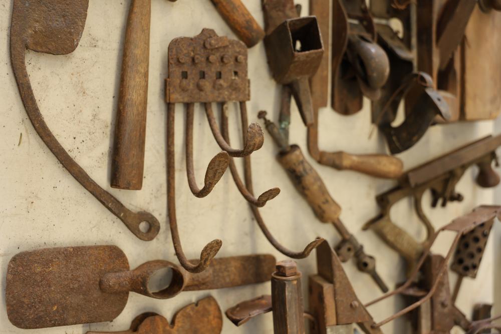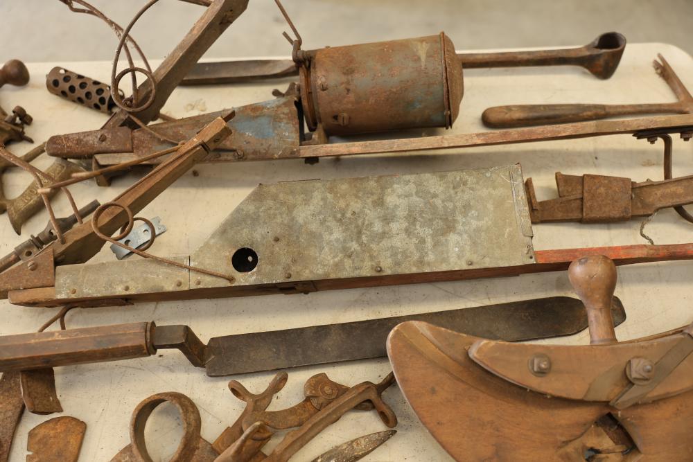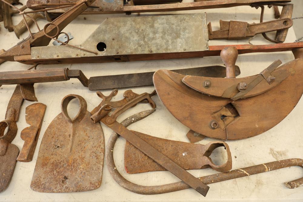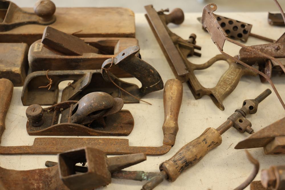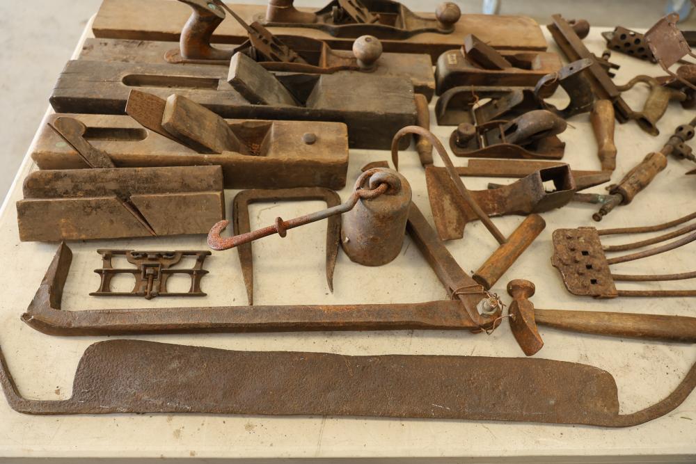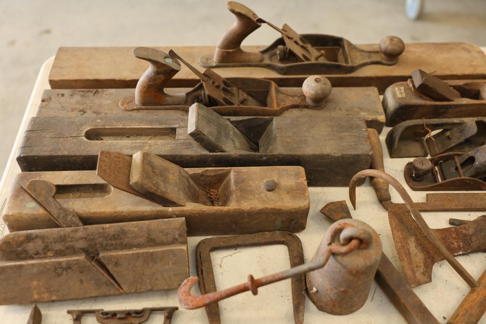 Woodworking Planes, Wrenches, Hinges. Group of vintage tools including wooden and metal woodworking planes, assorted wrenches, hinges, and other metal implements. Items show signs of rust and wear consistent with age and use. Pickup only.