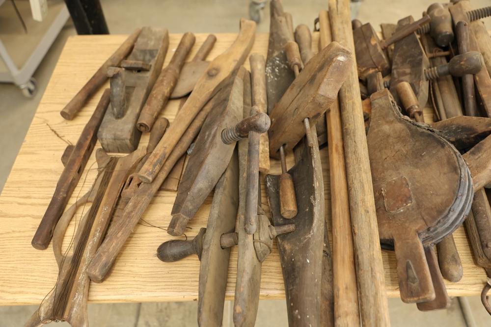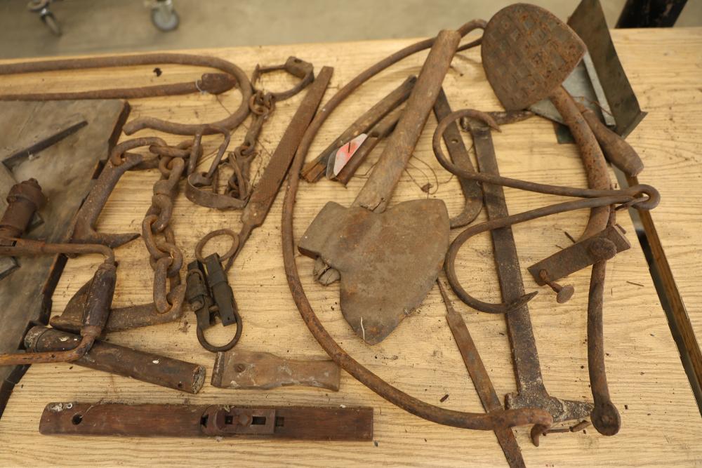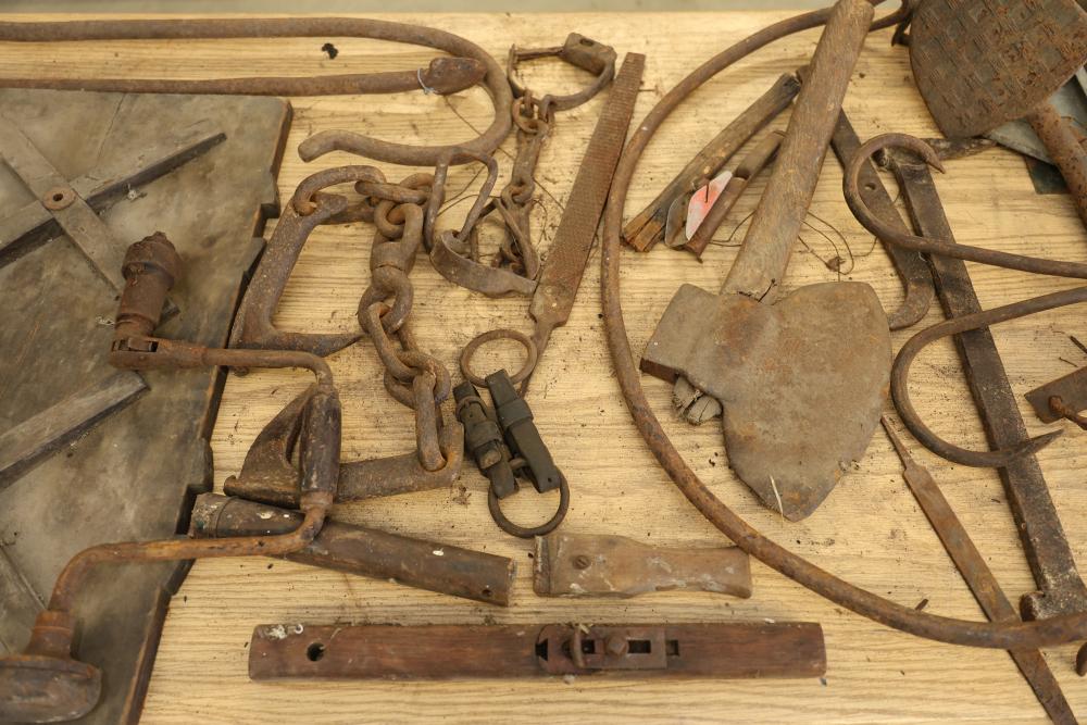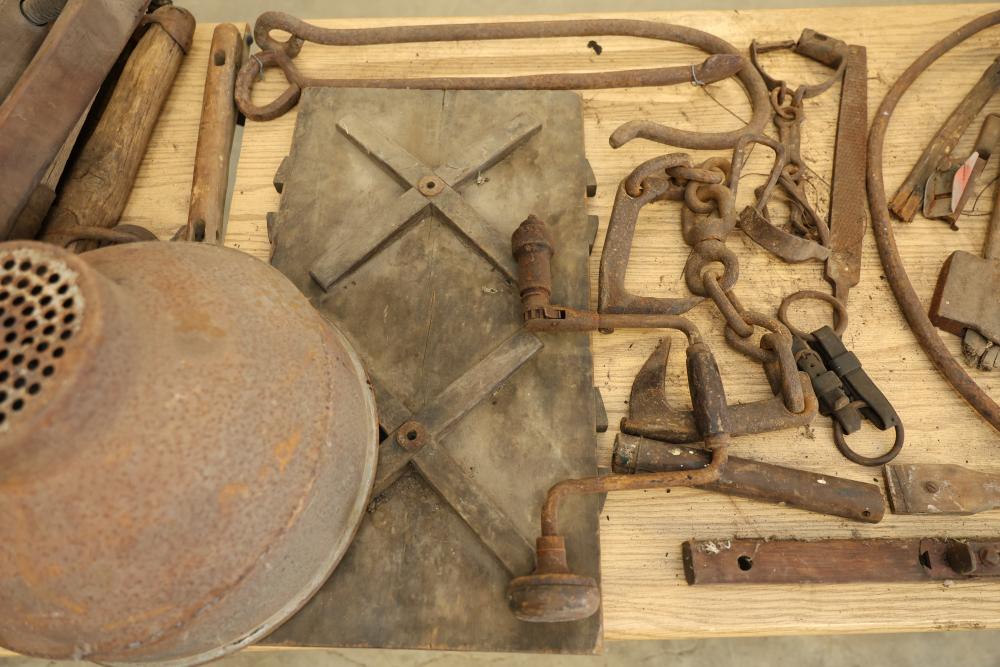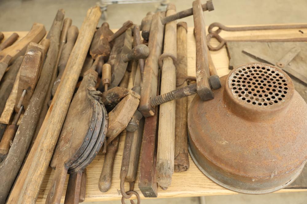 Vintage Tools Including Hand Tools, Hardware, and Metal Parts. A selection of wooden and metal vintage tools, hardware, and components, including hand tools, chain links, clamps, and other equipment or parts. Items exhibit signs of age, wear, oxidation, and patina consistent with vintage condition. Pickup only.