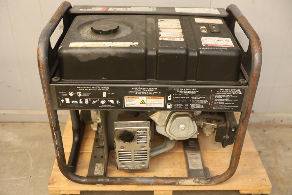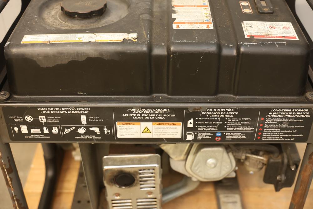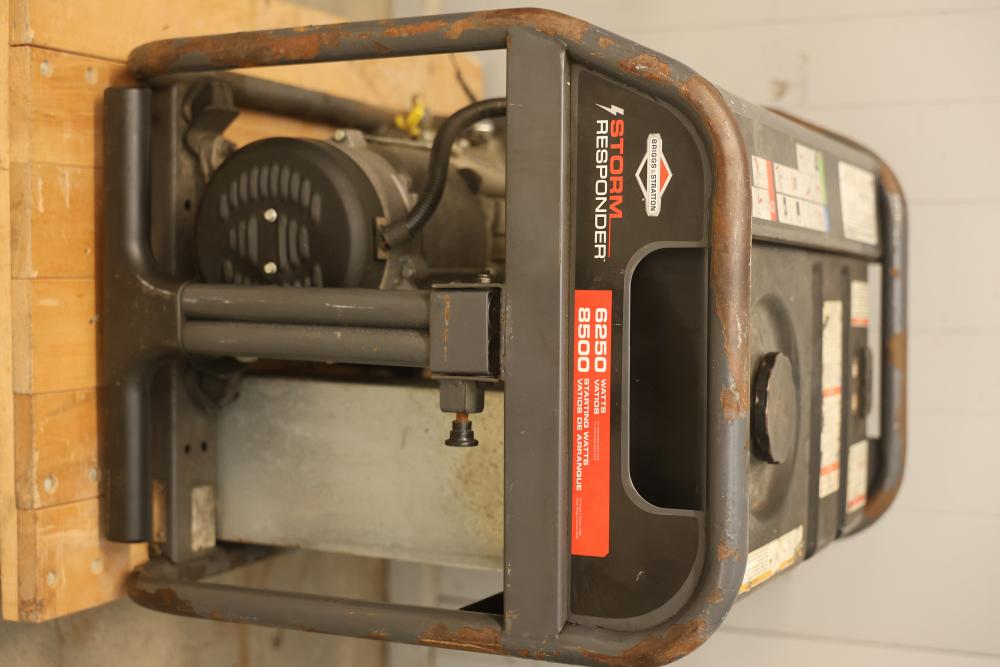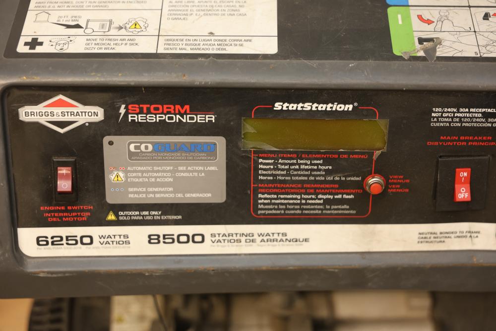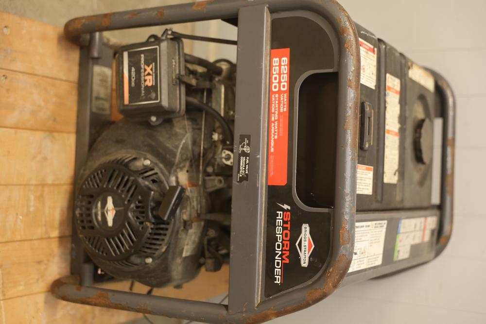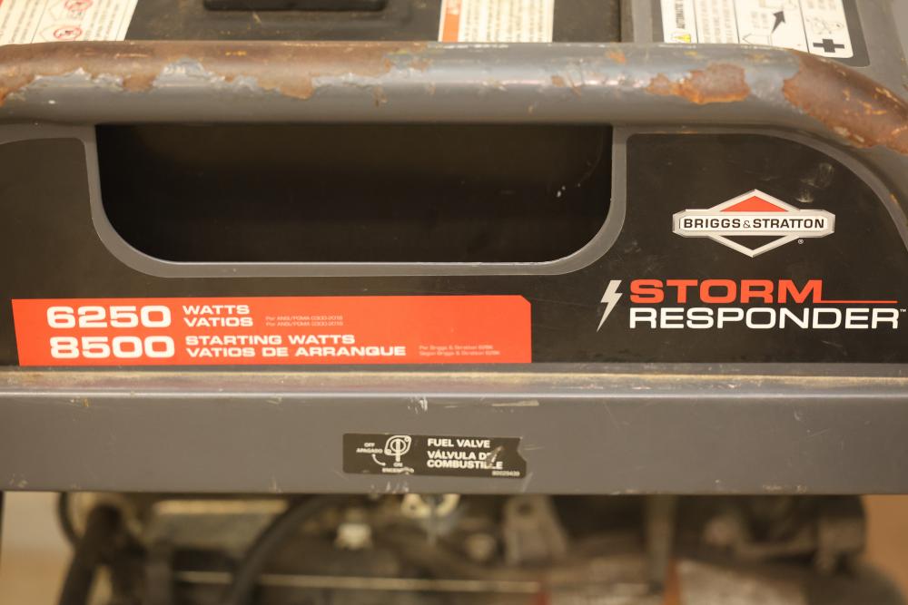 Briggs & Stratton Storm Responder 6250/8500-Watt Generator. Features a 420cc XR Professional engine and provides 6250 running watts and 8500 starting watts. Includes standard 120V/240V receptacles and instruction labeling on the unit. Exhibits wear and rust consistent with use. Pickup only.