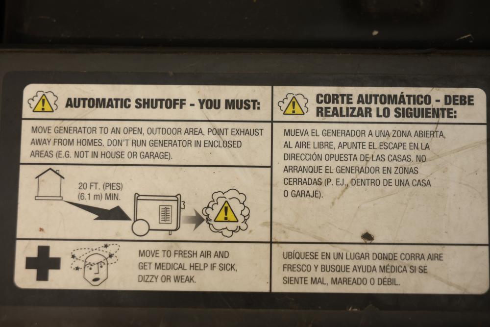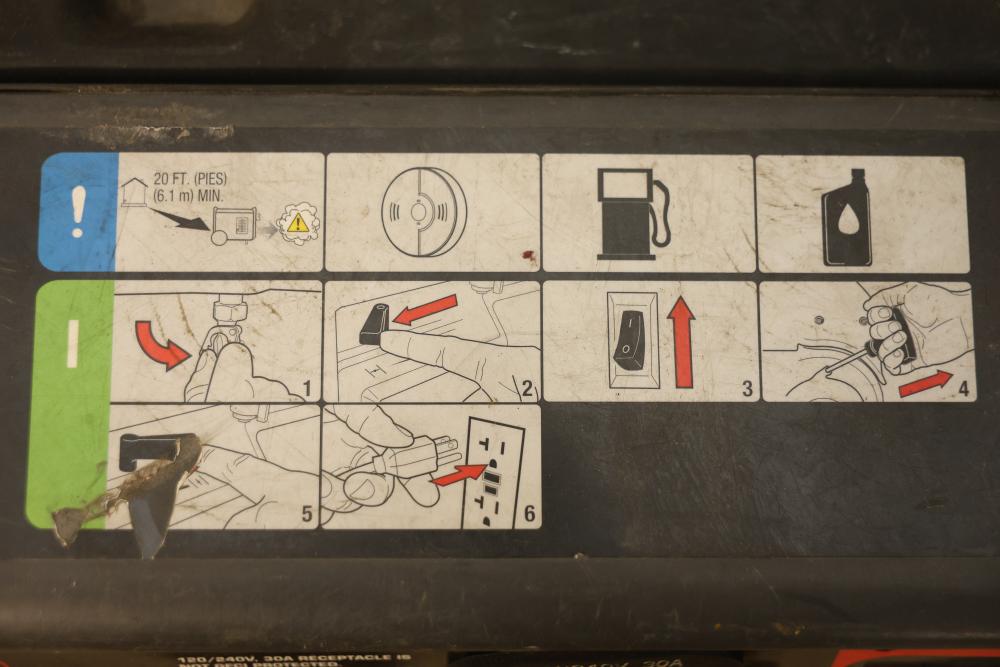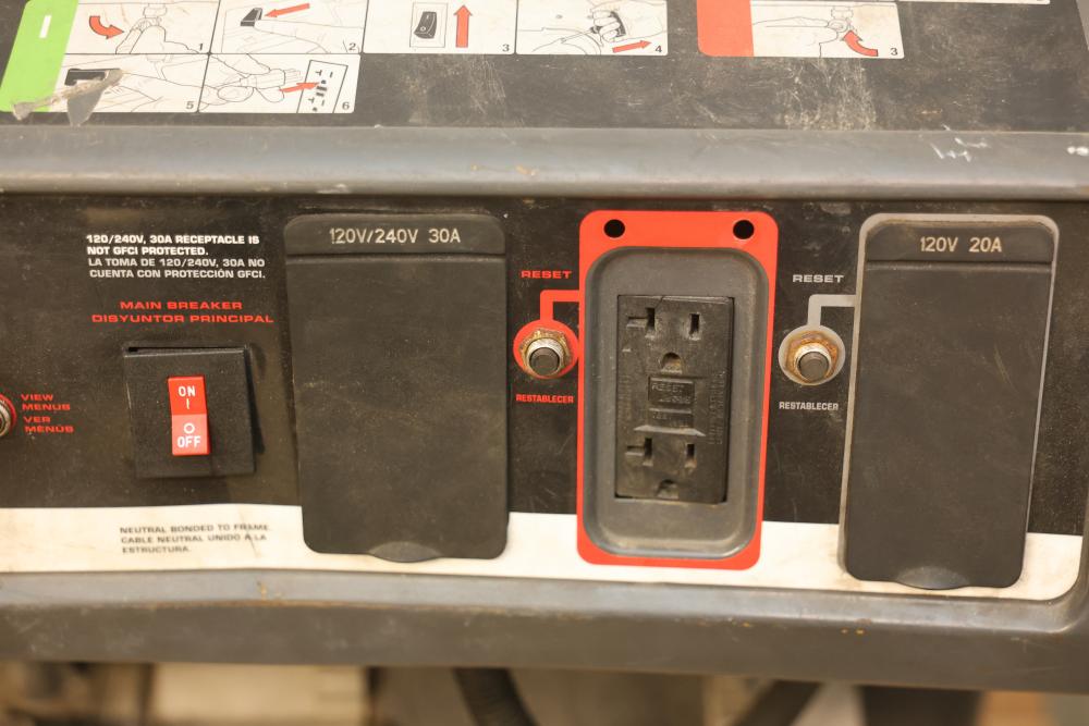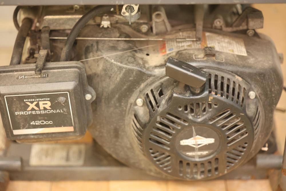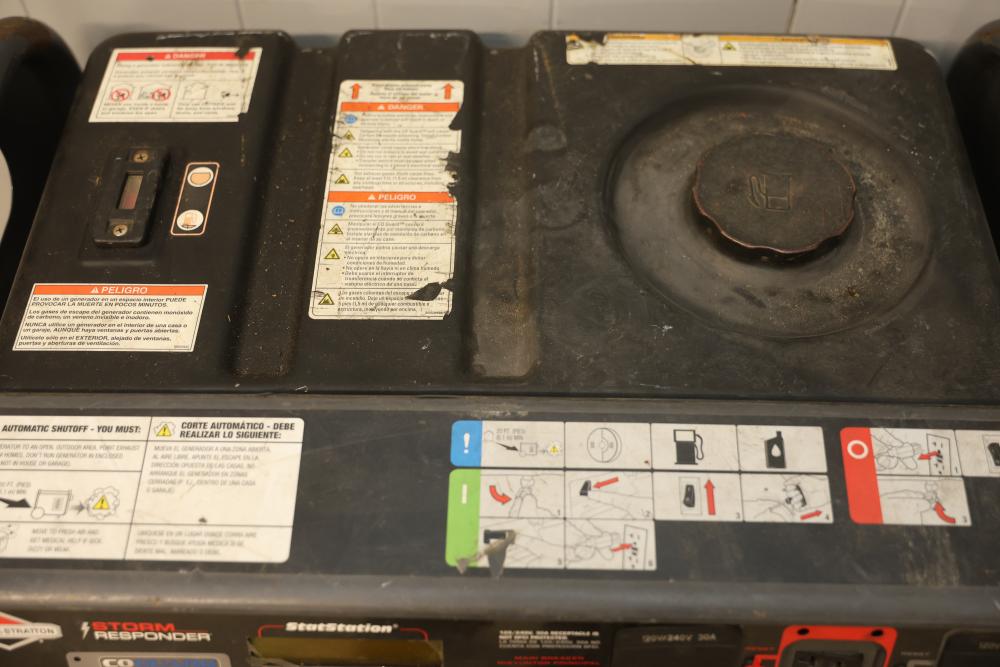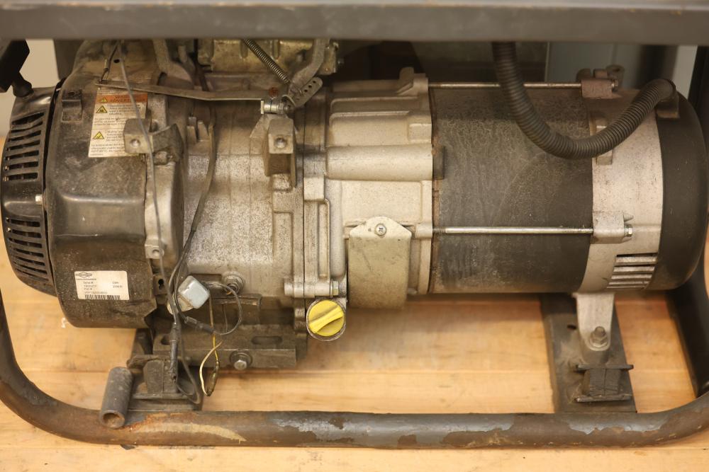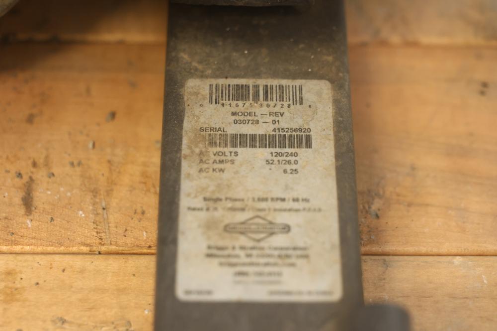 Briggs & Stratton Storm Responder 6250/8500-Watt Generator. Features a 420cc XR Professional engine and provides 6250 running watts and 8500 starting watts. Includes standard 120V/240V receptacles and instruction labeling on the unit. Exhibits wear and rust consistent with use. Pickup only.