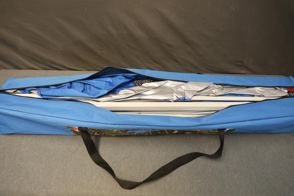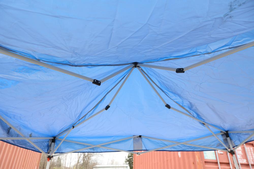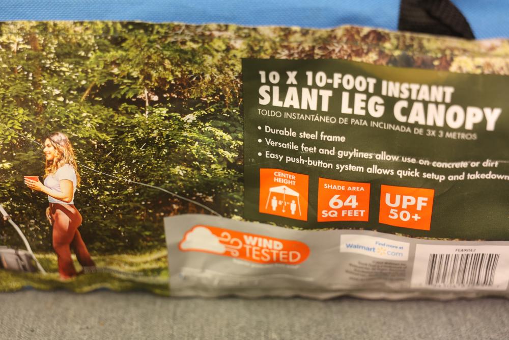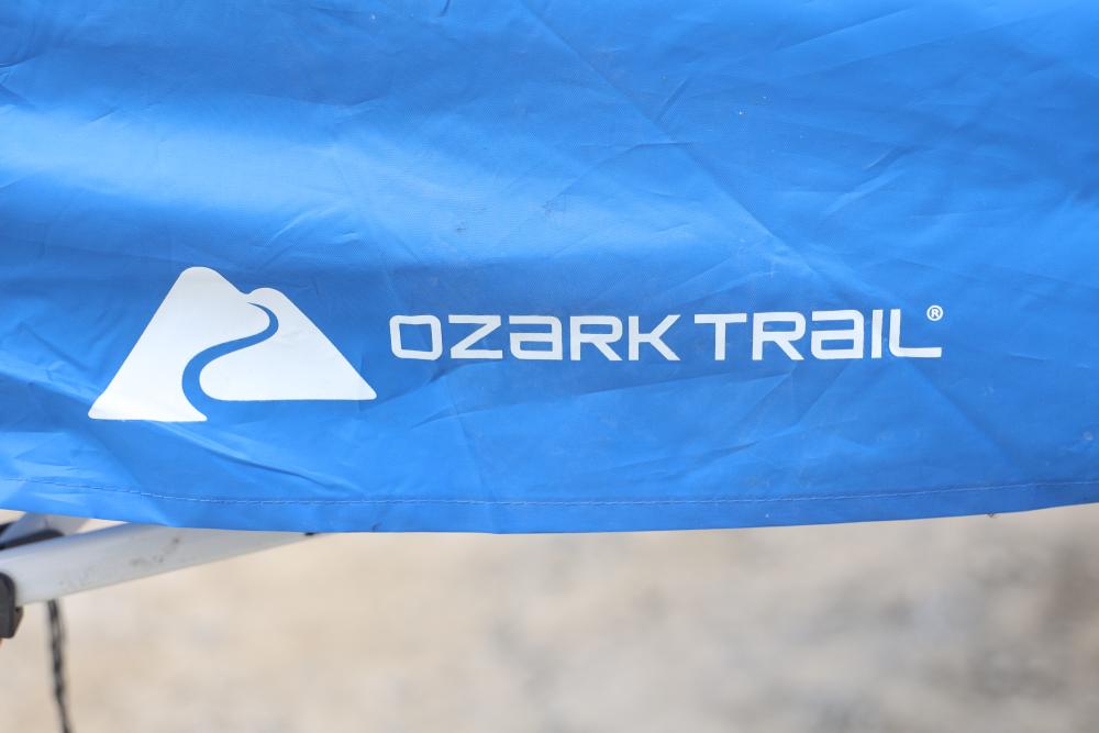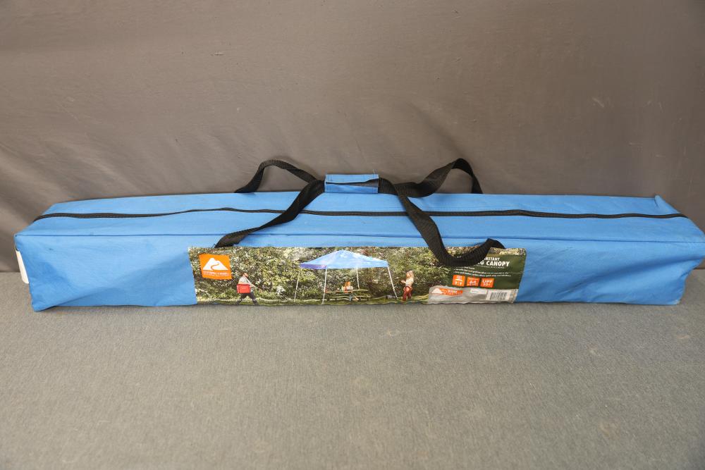 Ozark Trail 10 x 10-Foot Instant Slant Leg Canopy with Carry Bag. Features a durable steel frame, 64 square feet of shade area, and UPF 50+ protection. Includes an easy push-button system for quick setup and takedown. Pickup only.