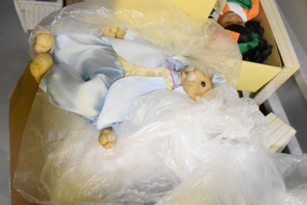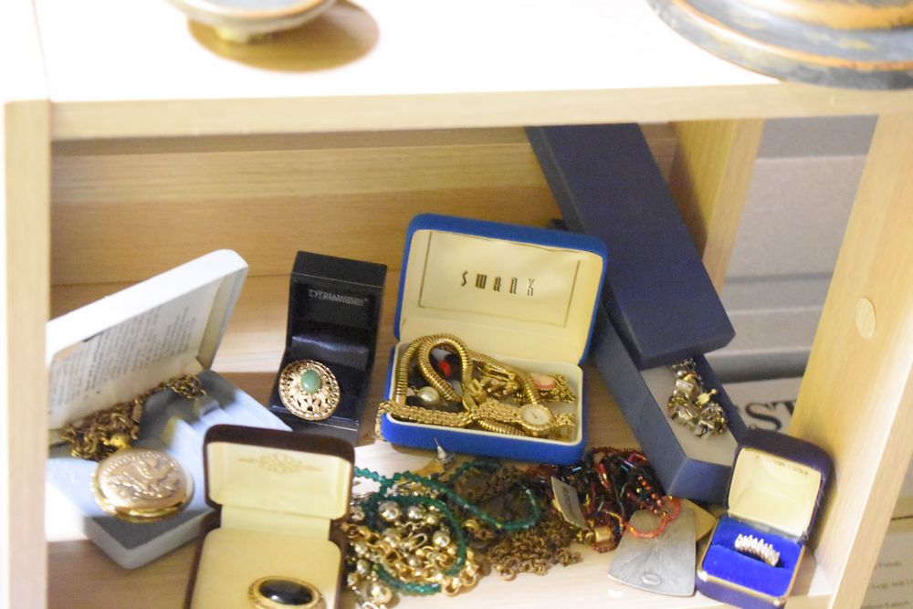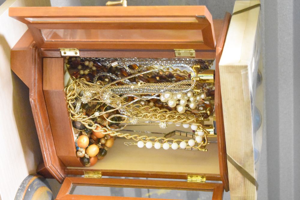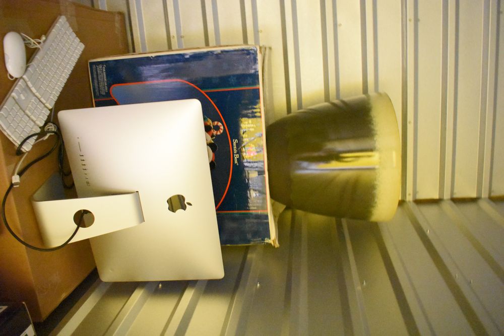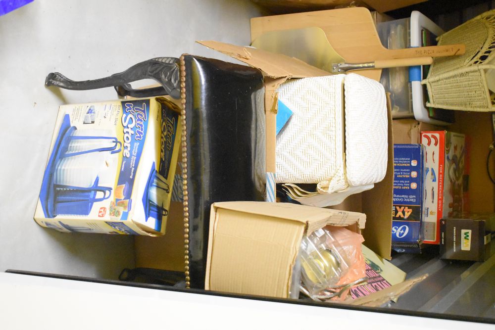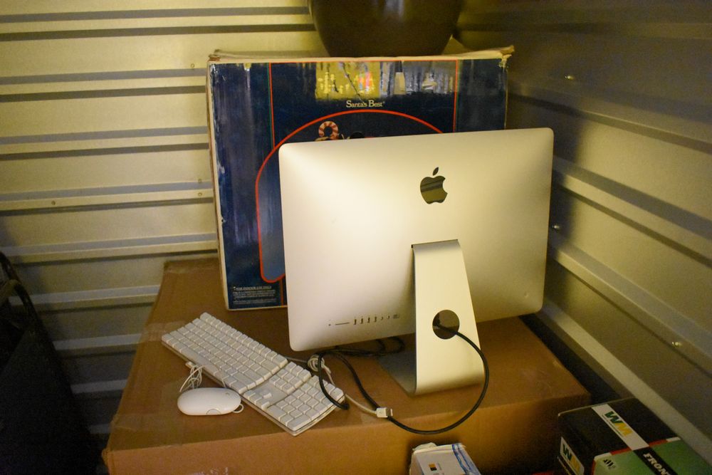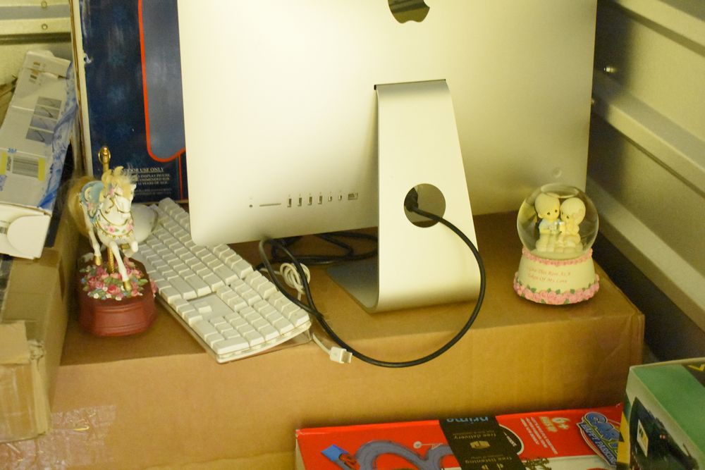 Contents of 10' x 5' storage unit being sold by the storage unit tenant. Contents include: Mixed Household & Decorative Storage Unit Contents, including Furniture, Electronics, Collectibles, & Kitchenware. wooden jewelry display cabinet (filled with assorted vintage costume jewelry), small shelving unit, upholstered bench/stool, plastic storage bins. Electronics: Apple iMac desktop computer, corning fiber optic cable, & various small electronic items. Collectibles: Large assortment of costume jewelry, collectible porcelain dolls, framed artwork, photo frames, decorative glassware, crystal bowl, candle holders, Christmas decorations, toys, etc. Clothing & Accessories: Vintage & new clothing, shoes & fashion accessories. Household Items: Mandoline slicer, assorted kitchenware, storage containers & miscellaneous home goods. The functionality of electric/electronic items are unknown/not tested. The authenticity of items have not been verified or guaranteed on any/all items. Items are located in Elmsford, NY.