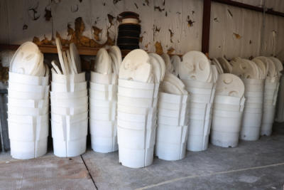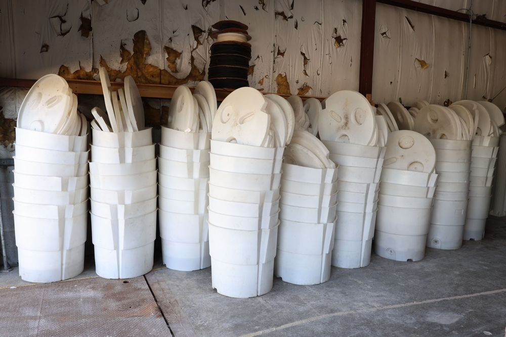 QTY:94 Large white plastic Giffy Tent weight barrels with matching round lids, stacked and nested together; barrels have molded side ribs, vertical supports, lower drain fittings.