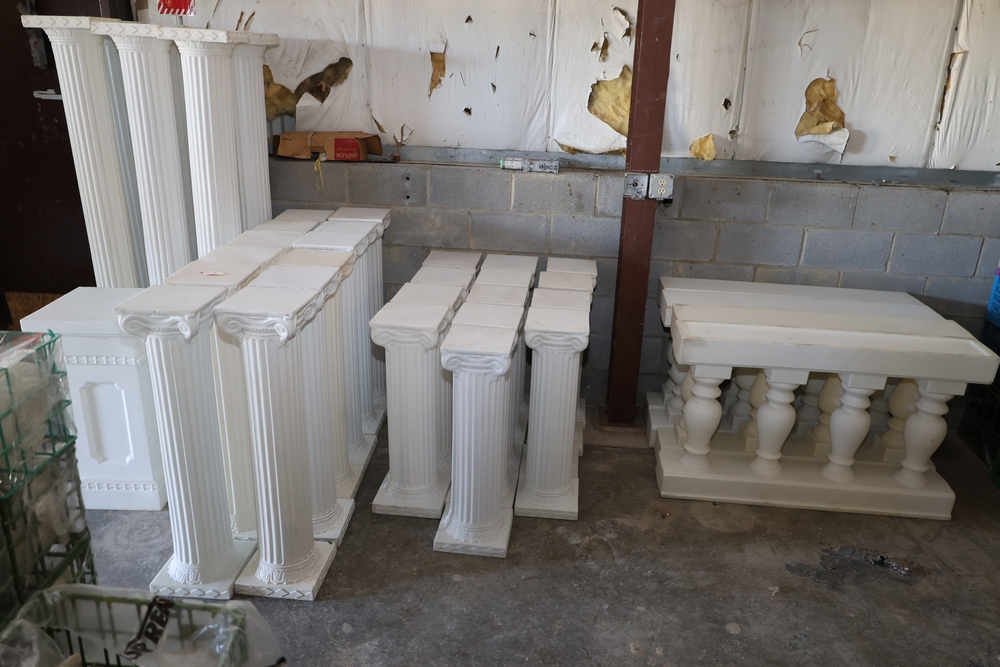 Group of white decorative columns pedestals and display stands including multiple fluted column pedestals with square tops and bases, four rectangular baluster stands approx. 47" x 7.5" x 29" tall, and one square pedestal stand with paneled sides approx. 16.5" square x 32" tall. QTY:6-72" pedestal approx. 11" square x 72" tall, QTY:12-40" pedestals approx. 9.5" square x 40" tall, QTY:13- 30" pedestal 9.5x30" tall