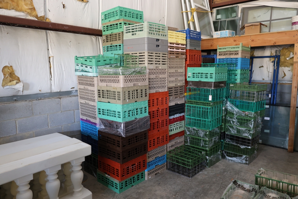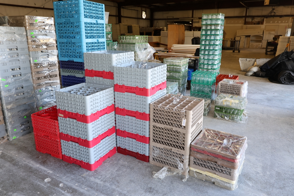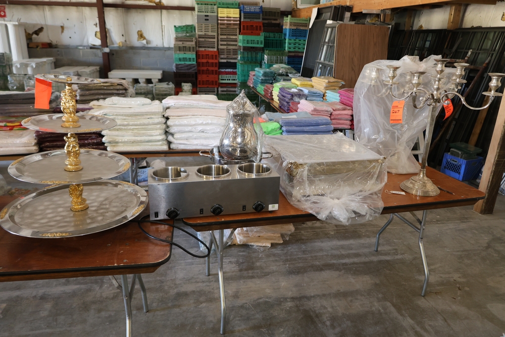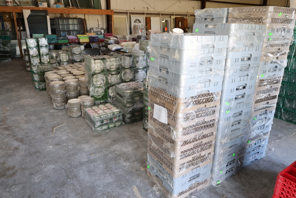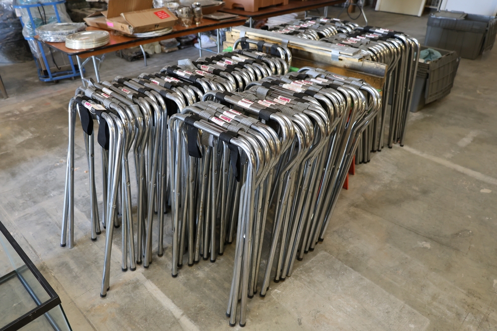Items include Giffy Barrels used as counterweights; large quantities of commercial dish racks; portable folding server stands; inflatable event items; string light support poles; assorted catering and event service equipment; banquet tables and stacking chairs including large quantity chair lots; shelving, storage, and miscellaneous rental inventory; along with additional fixtures, materials, and equipment from a large-scale rental inventory liquidation. Items are located in Fishkill, NY.