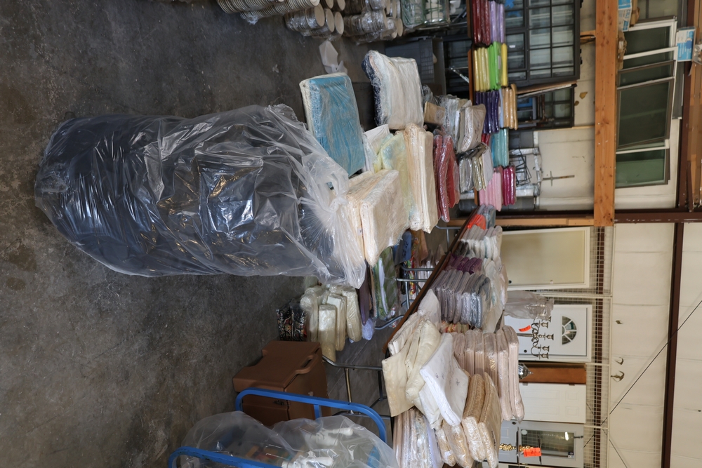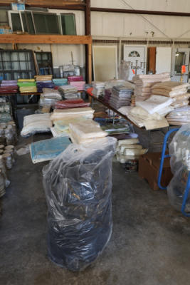 Large quantity of rental linens and fabric items including stacked table linens, runners, napkins, and assorted fabric covers in multiple colors and patterns, many wrapped in plastic and grouped on tables, on the floor, and inside a large gray storage bin. Also includes one bag of chair covers.