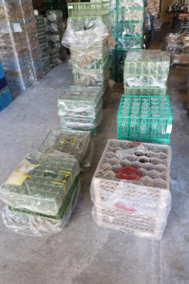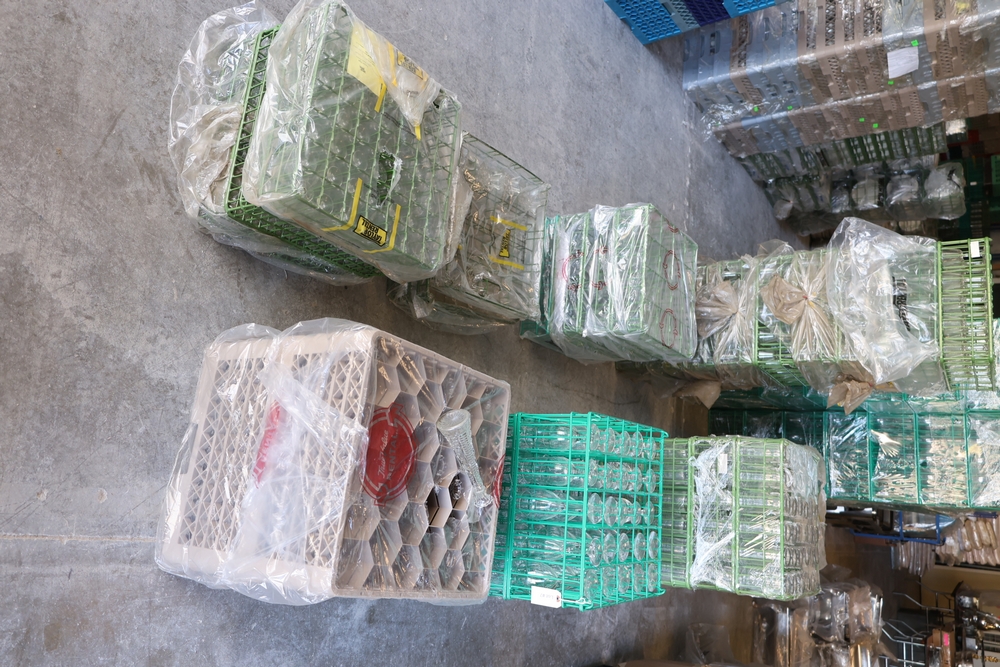Large quantity of assorted glassware in commercial dish racks, including tall drinking glasses, stemmed wine glasses, footed glasses, goblets, dessert cups, and decorative glass pieces, with many racks stacked and wrapped in plastic.