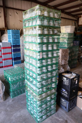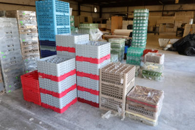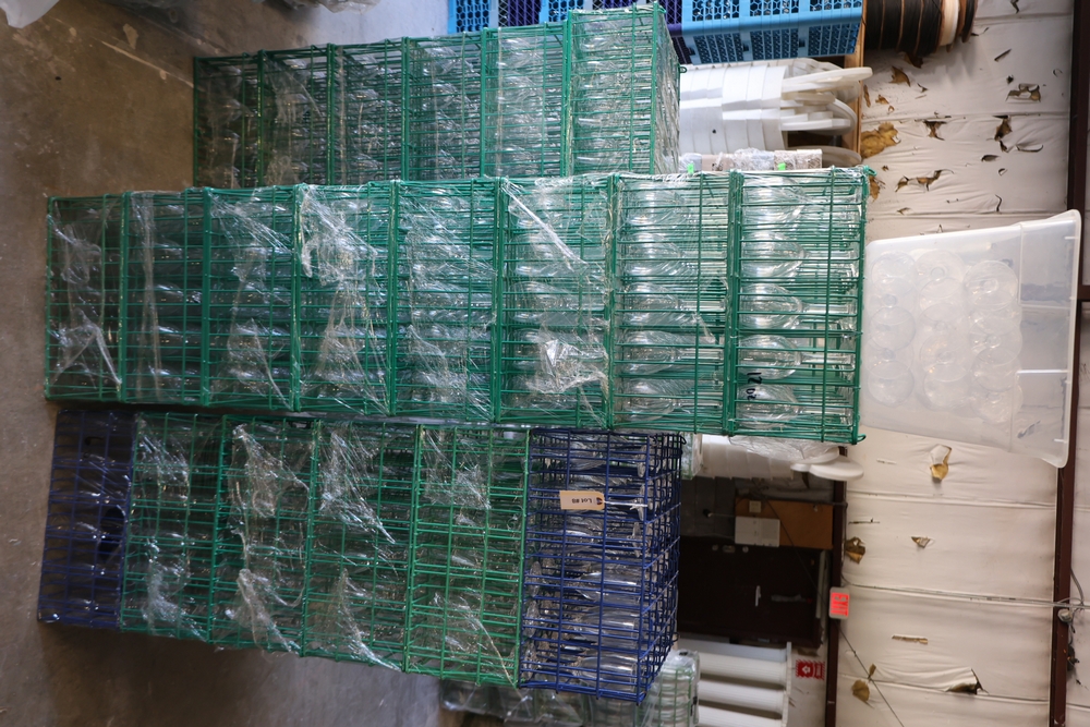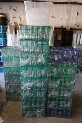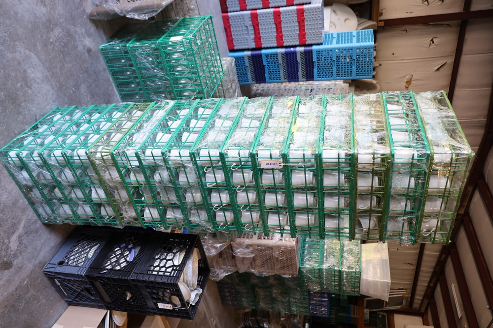 Large group of commercial glass racks including plastic rack trays, compartment racks, and multiple green metal wire glass racks, stacked and bundled together.