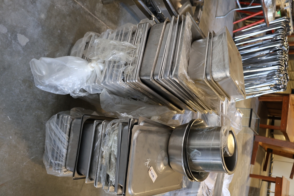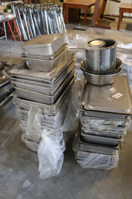 Large quantity of stainless steel hotel pans in various sizes, including perforated pan, solid pans, lids, divided insert pan, mixing bowls, and cylindrical containers.