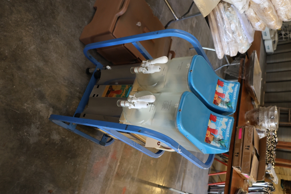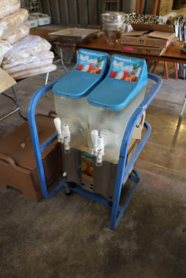 Dual tankfrozen beverage dispenser, model GB-220, with two clear reservoirs, dispensing taps, control panel, and mounted in blue metal rolling frame.