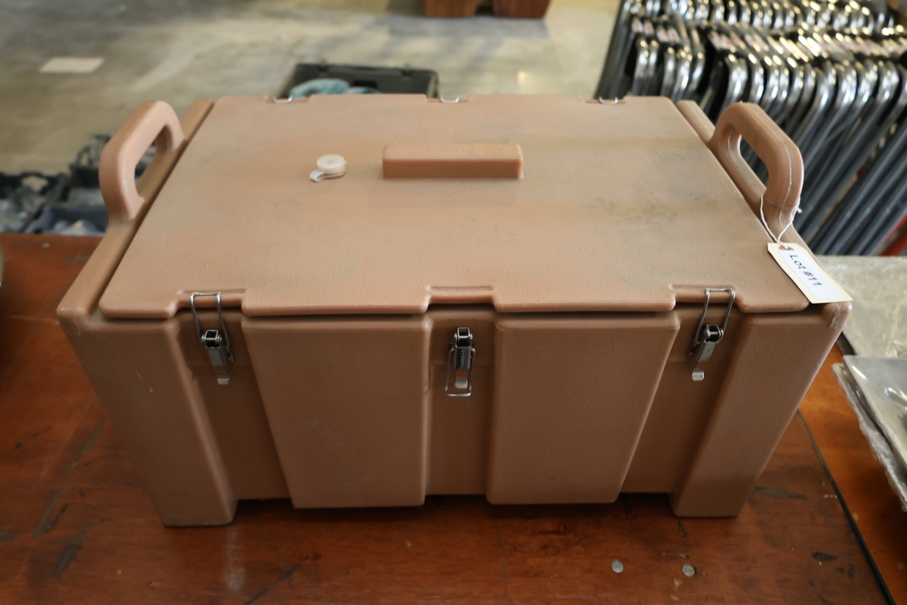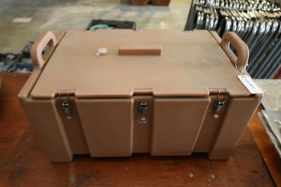 Cambro insulated food transport carrier with latching lid and side handles, approximately 23 in x 15 in x 12 in.