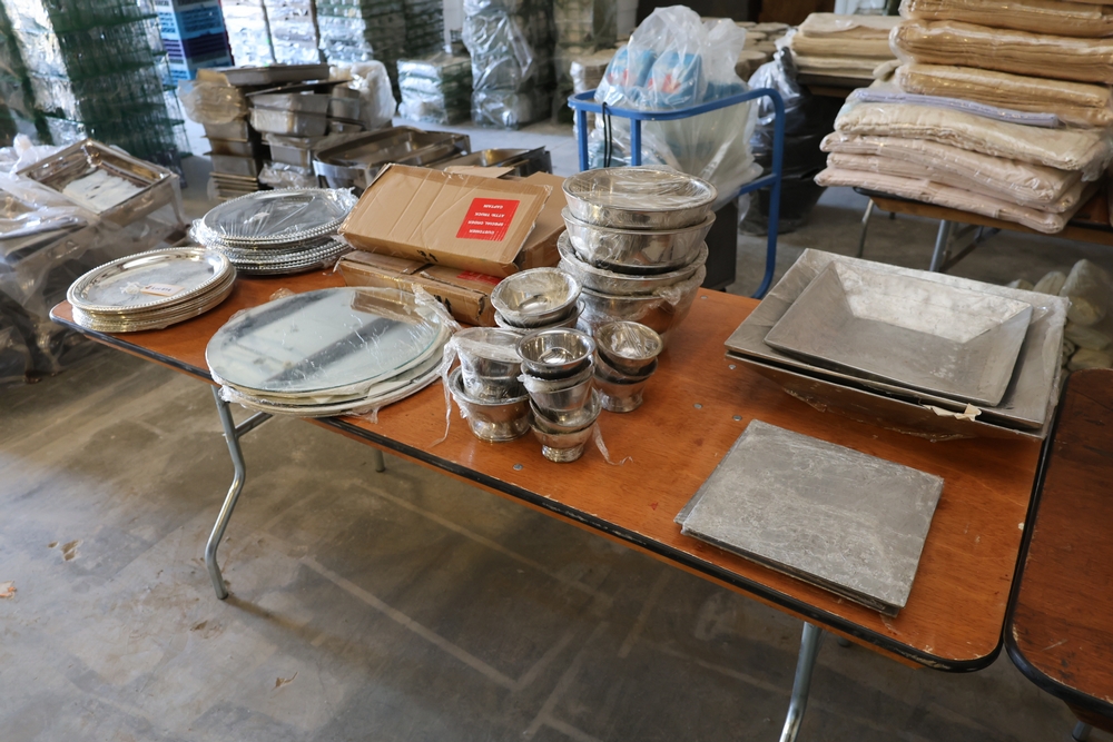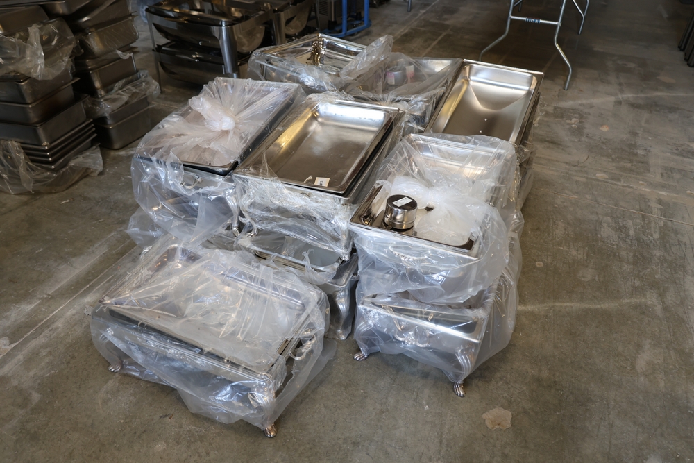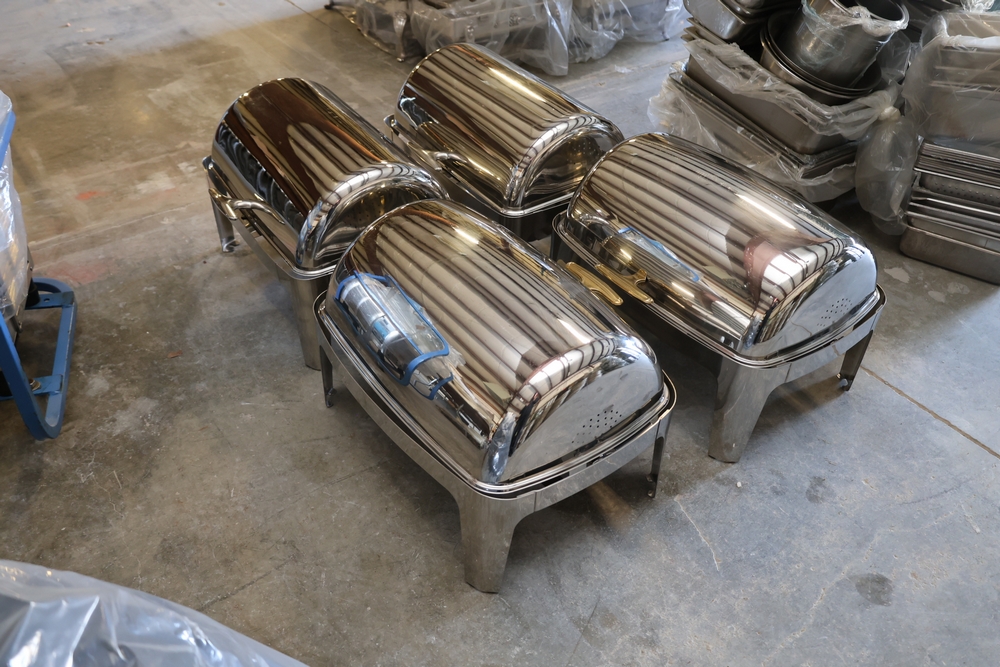 Catering serving ware including stainless steel serving trays, round serving platters, metal serving bowls, square display trays, etc.