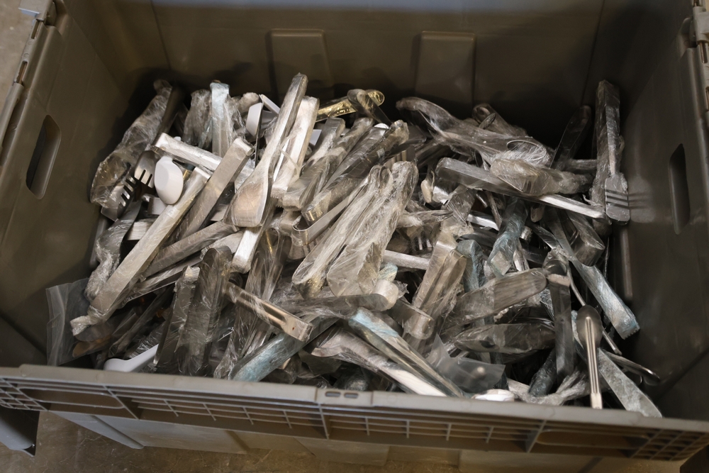 Large assortment of stainless steel utensils including tongs, spoons, and similar pieces in plastic tote.