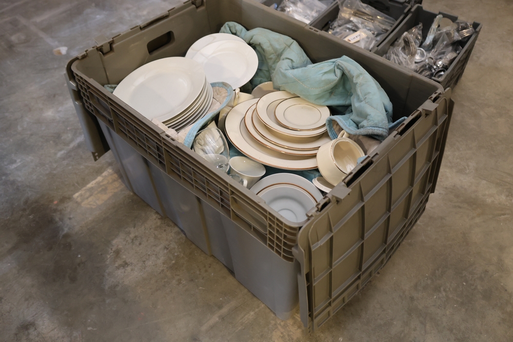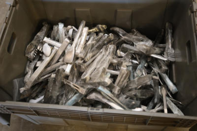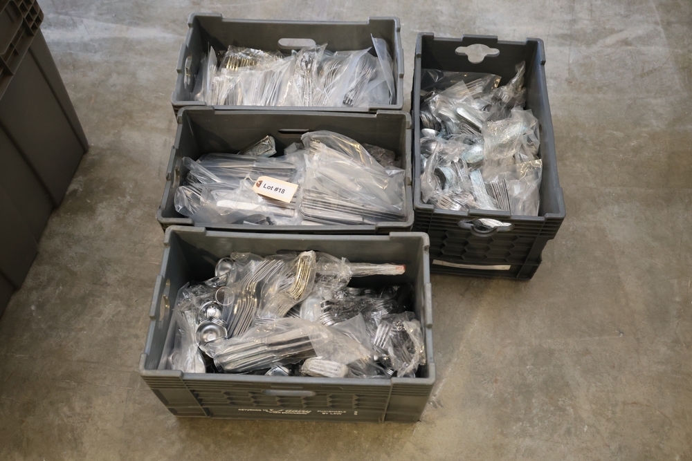 Assorted flatware including forks, knives, spoons, and serving pieces in plastic totes.