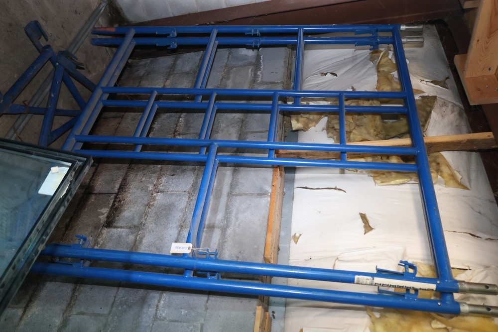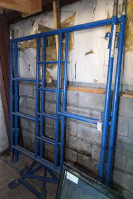 O’Farrell Scaffolding & Equipment set of blue metal scaffolding frames with one cross brace component.