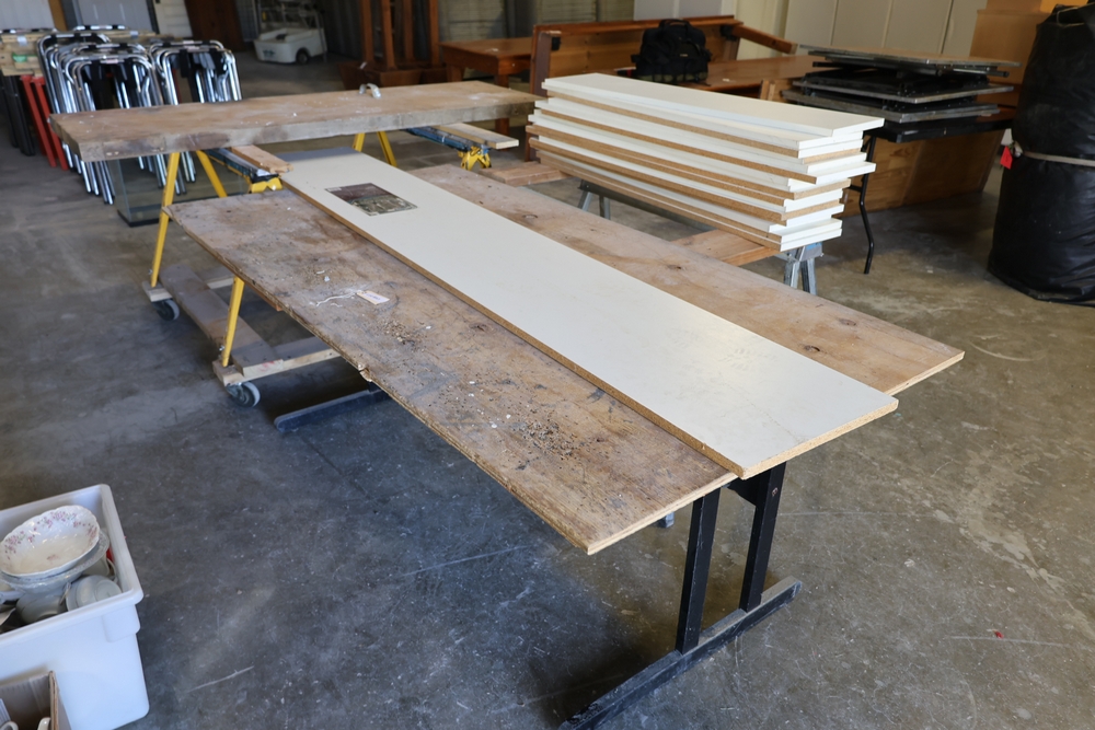 Assorted melamine boards including Veranda shelving boards; includes Fulton StableMate sawhorse and wood work surfaces.