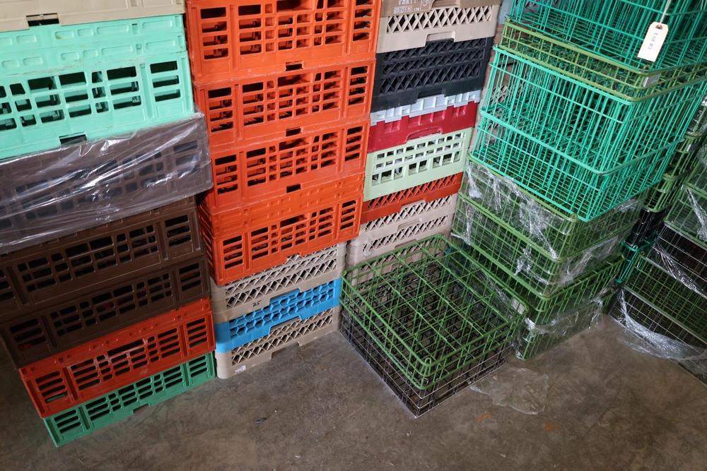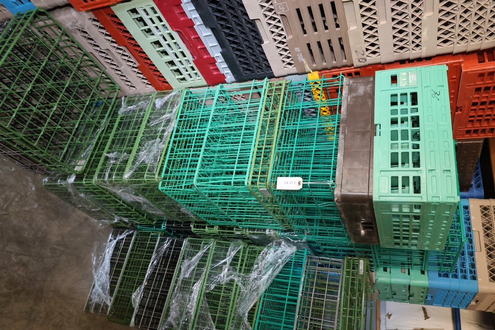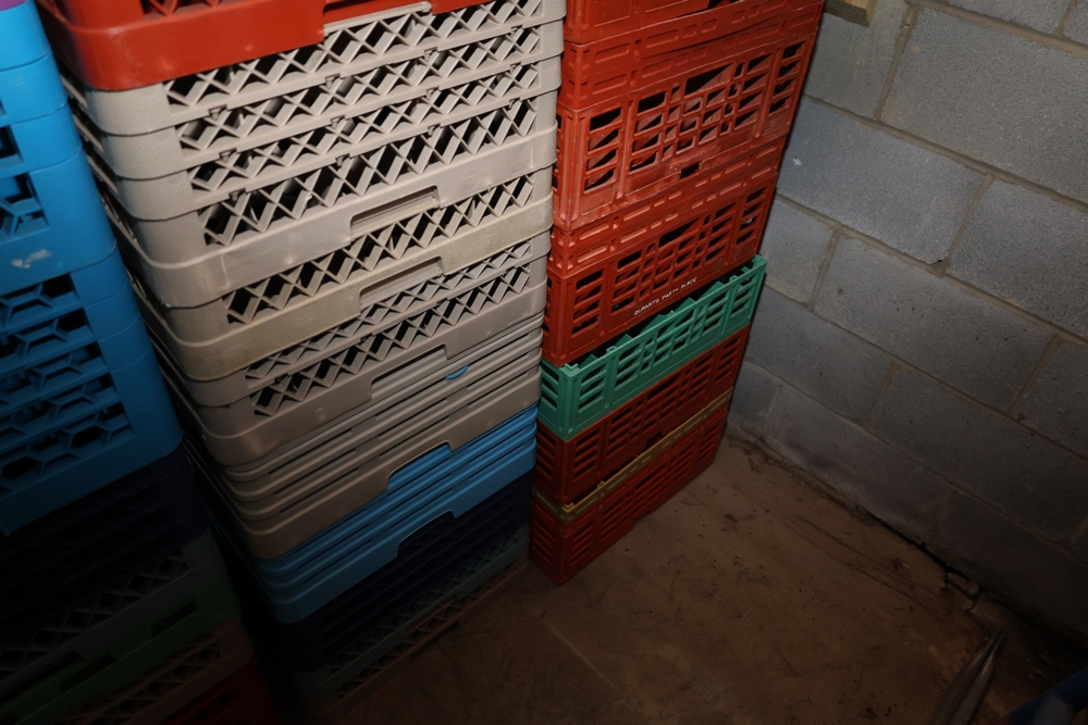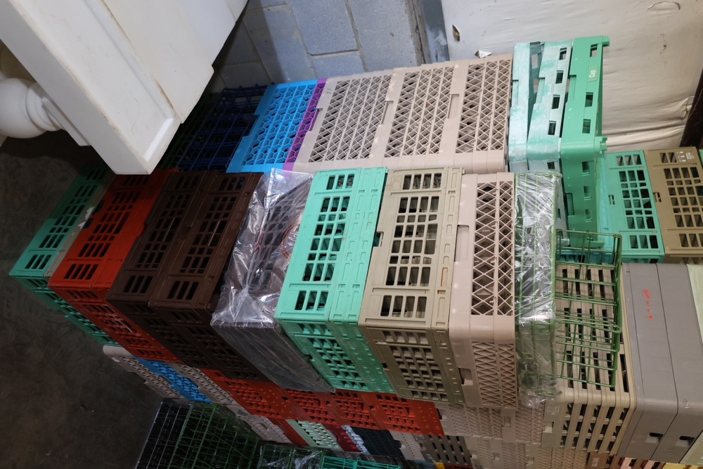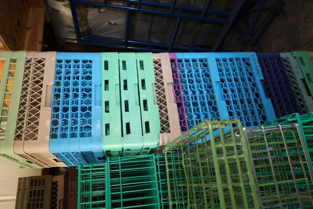 Large group of commercial glass racks including plastic rack trays, compartment racks, and multiple green metal wire glass racks, stacked and bundled together.