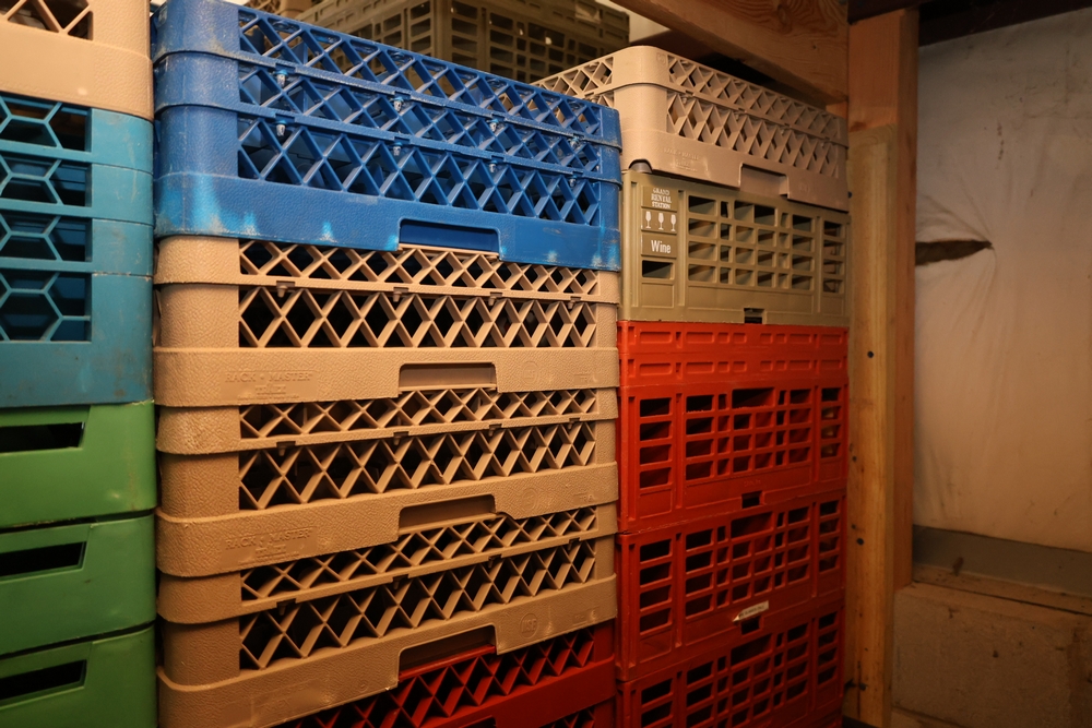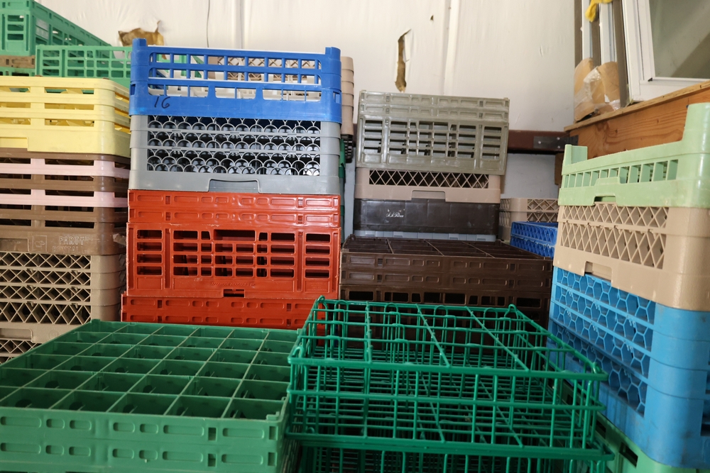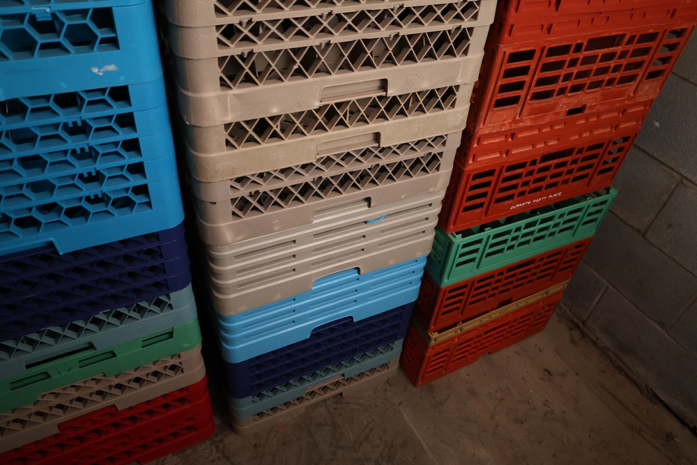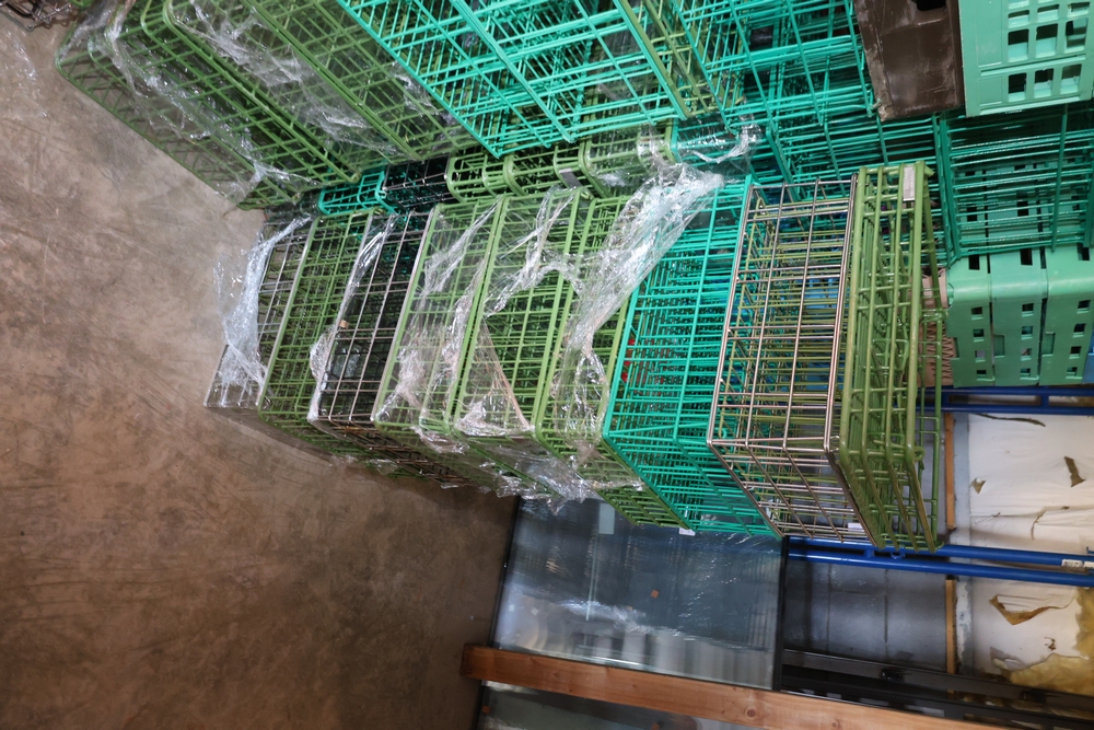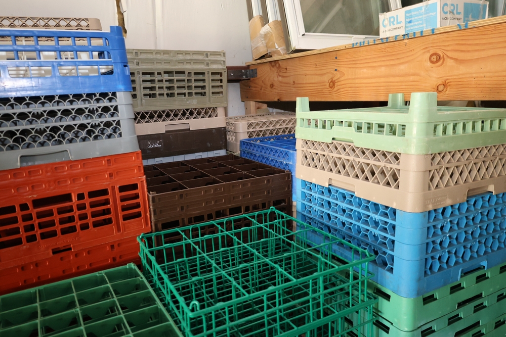 Large group of commercial glass racks including plastic rack trays, compartment racks, and multiple green metal wire glass racks, stacked and bundled together.