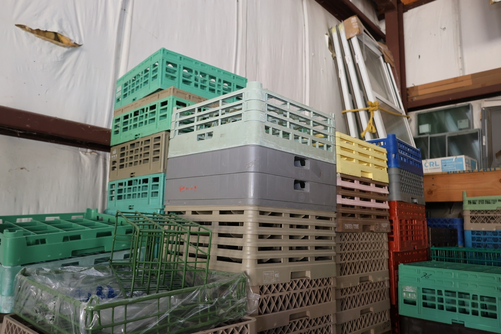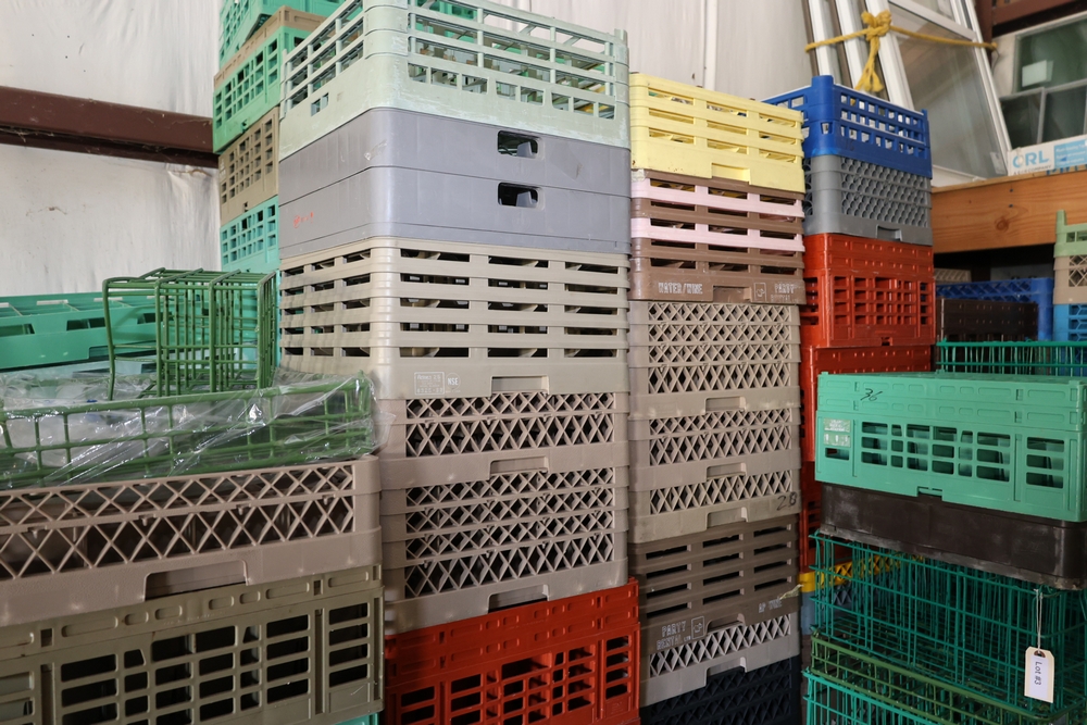 Items include Giffy Barrels used as counterweights; large quantities of commercial dish racks; portable folding server stands; inflatable event items; string light support poles; assorted catering and event service equipment; banquet tables and stacking chairs including large quantity chair lots; shelving, storage, and miscellaneous rental inventory; along with additional fixtures, materials, and equipment from a large-scale rental inventory liquidation. Items are located in Fishkill, NY.
