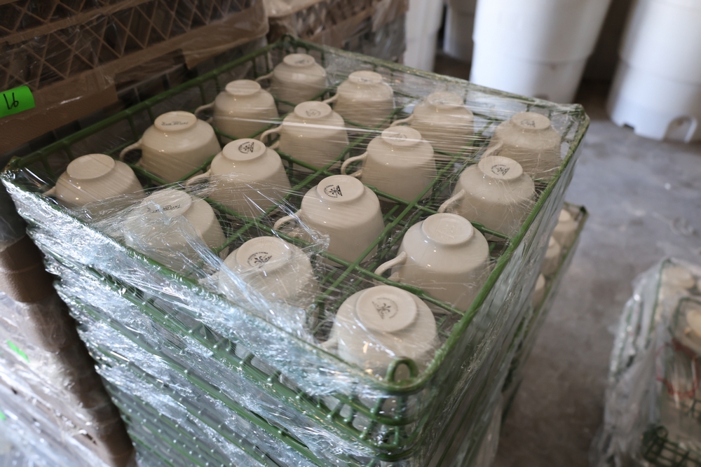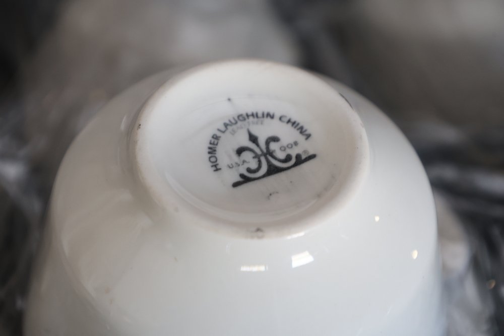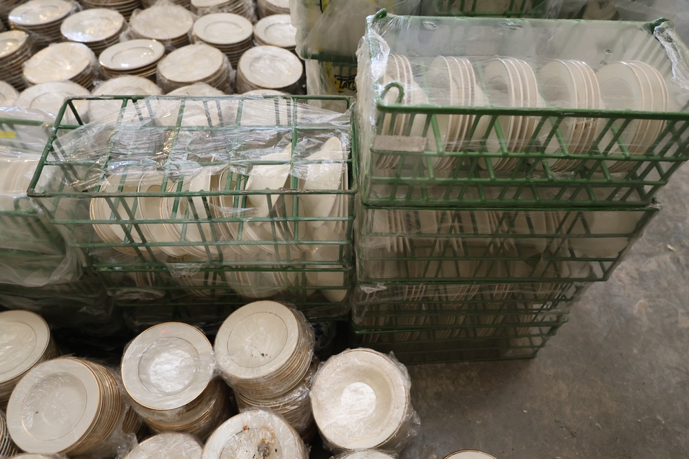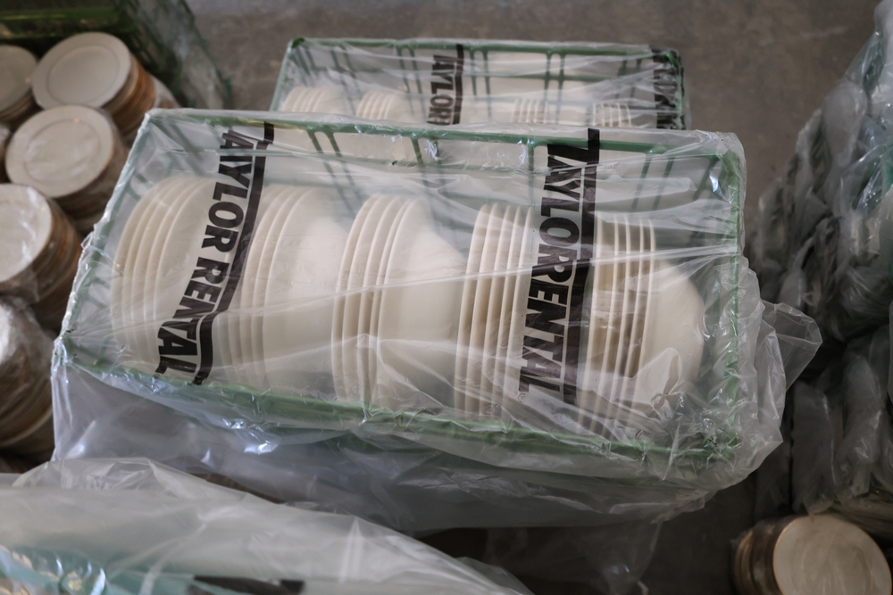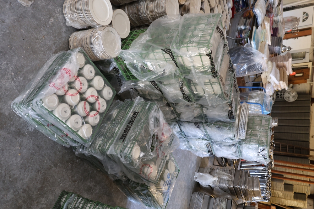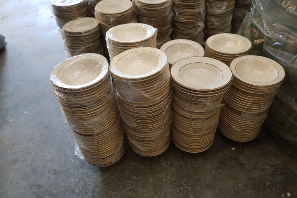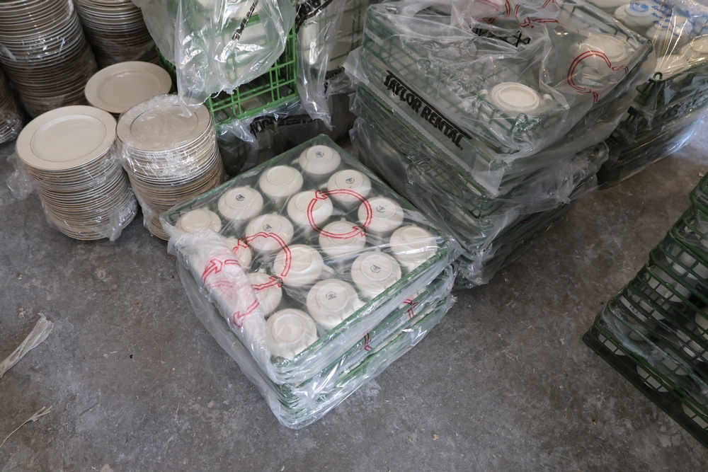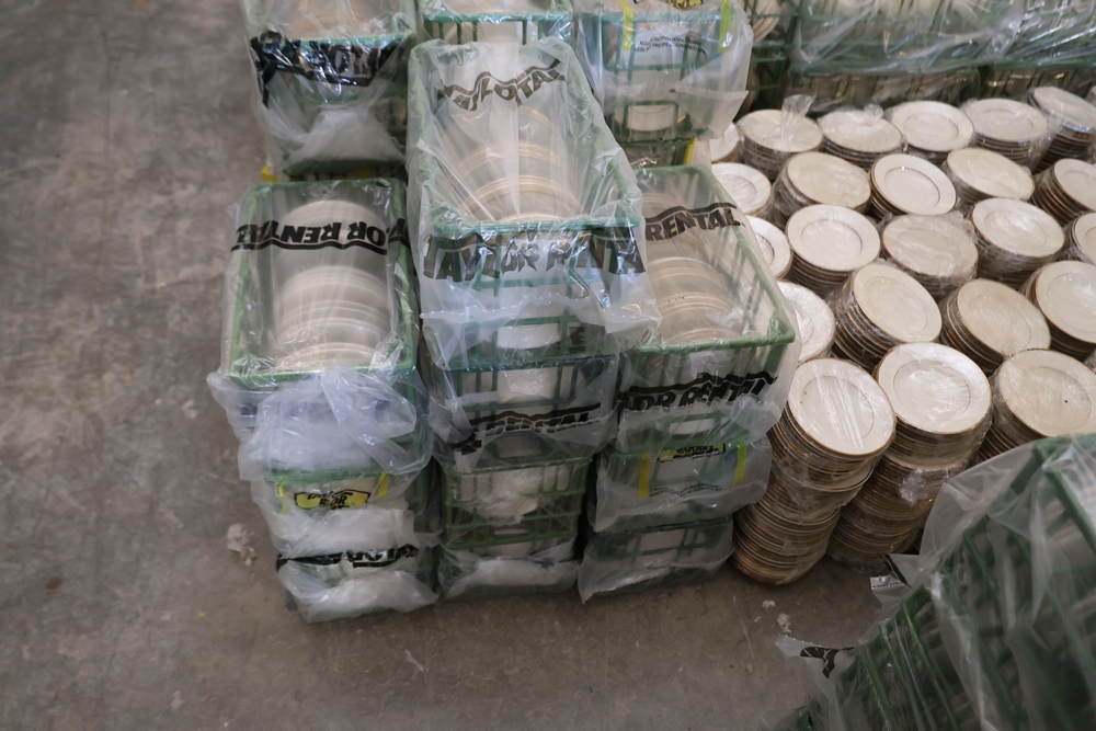 Large quantity of rental company dinnerware including numerous stacks of plates and shallow bowls, along with multiple wire dish racks filled with plates and bowls marked Taylor Rental, and additional stacked commercial plastic dish racks, with visible Homer Laughlin China USA markings on underside of pieces. Approx quantities: 10" dinner plate - 2000, 9" plate - 225, 7" plate - 3600, 5" plate - 1045, 9" bowl - 225, 7" bowl - 320, 5" bowl - 1350, sugar bowl - 50, creamers - 28, saucers - 2700, coffee cups - 1800.