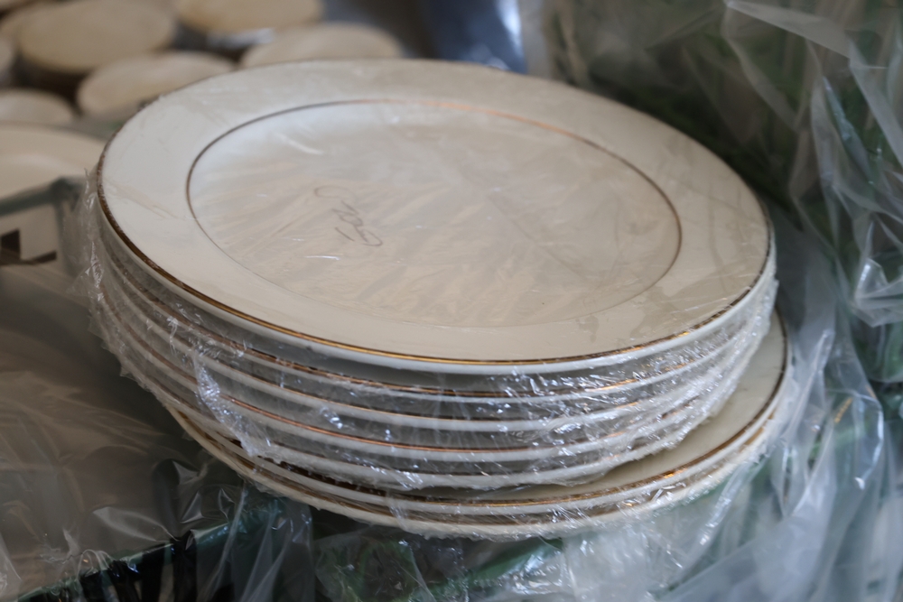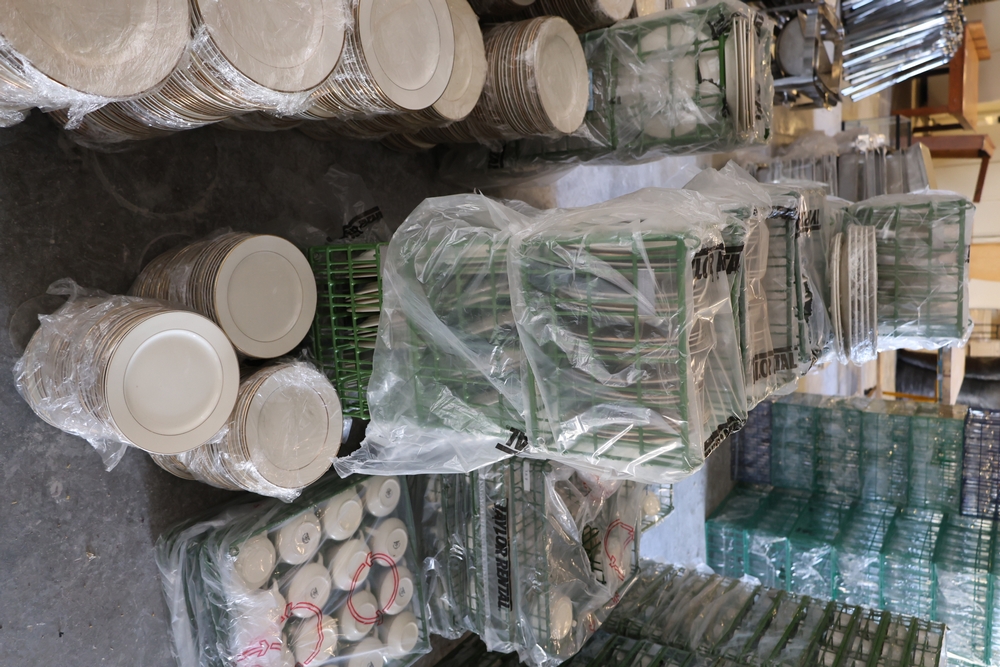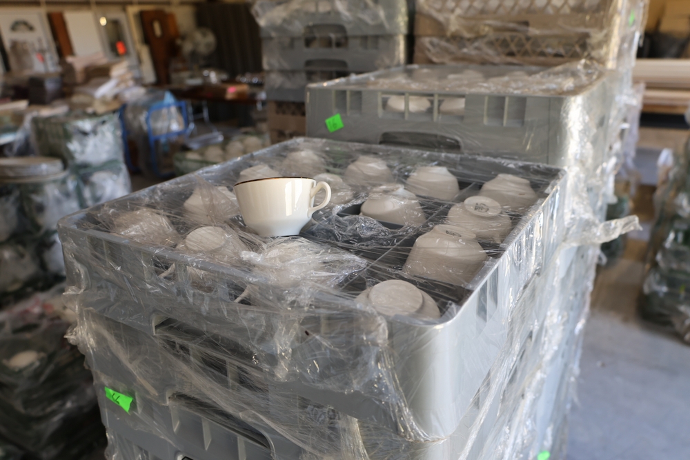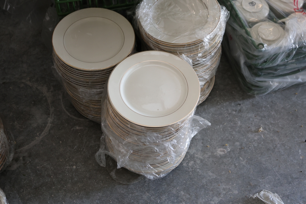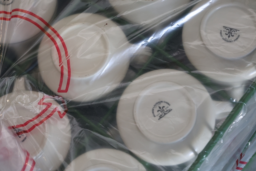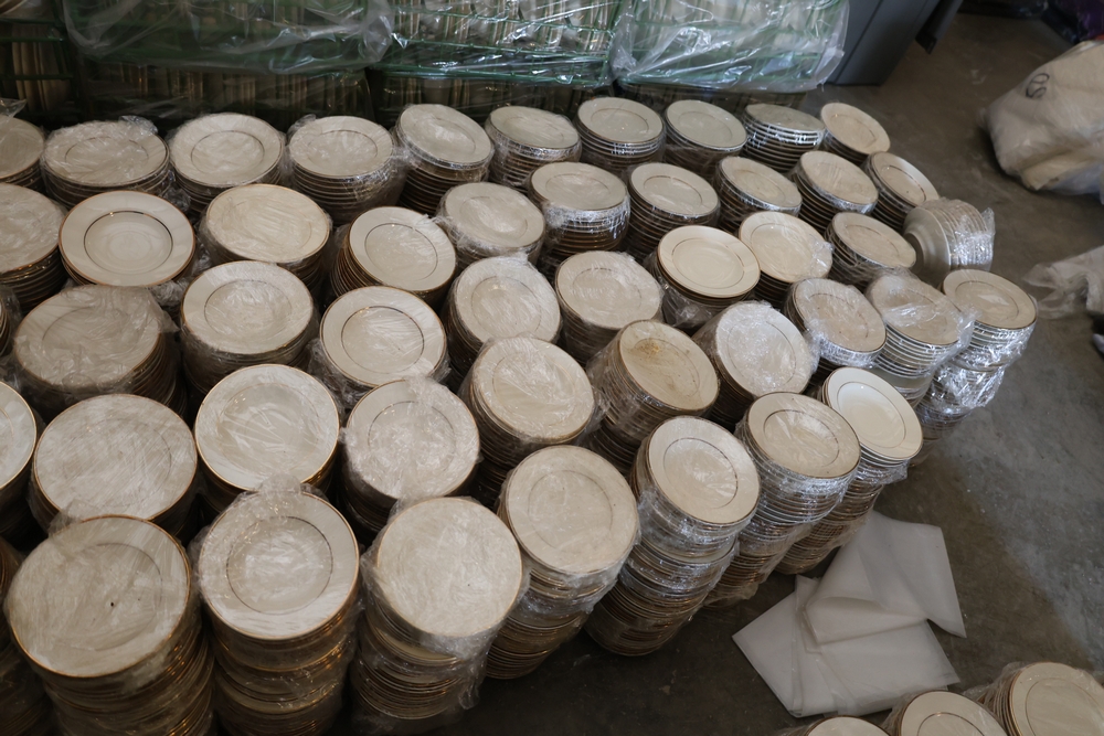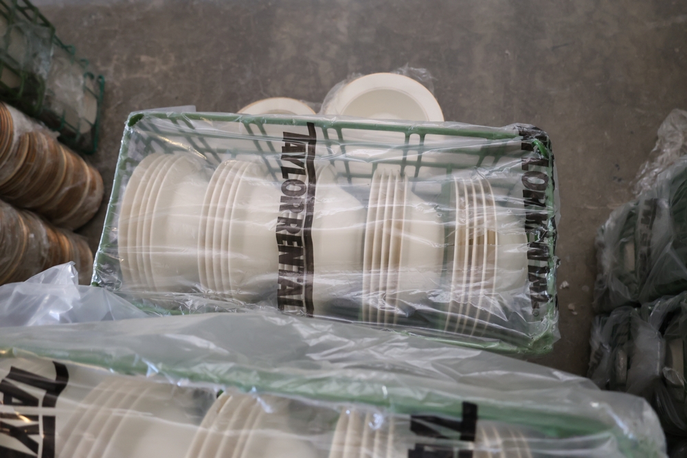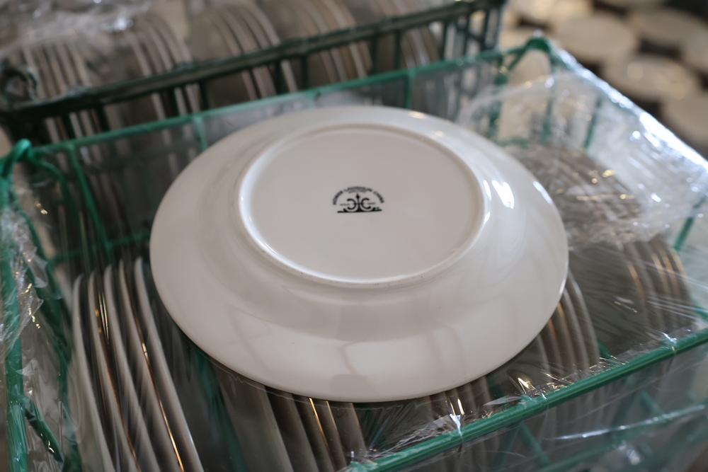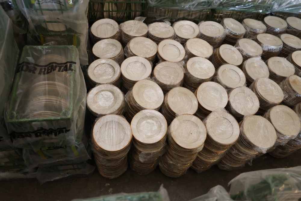 Large quantity of rental company dinnerware including numerous stacks of plates and shallow bowls, along with multiple wire dish racks filled with plates and bowls marked Taylor Rental, and additional stacked commercial plastic dish racks, with visible Homer Laughlin China USA markings on underside of pieces. Approx quantities: 10" dinner plate - 2000, 9" plate - 225, 7" plate - 3600, 5" plate - 1045, 9" bowl - 225, 7" bowl - 320, 5" bowl - 1350, sugar bowl - 50, creamers - 28, saucers - 2700, coffee cups - 1800.