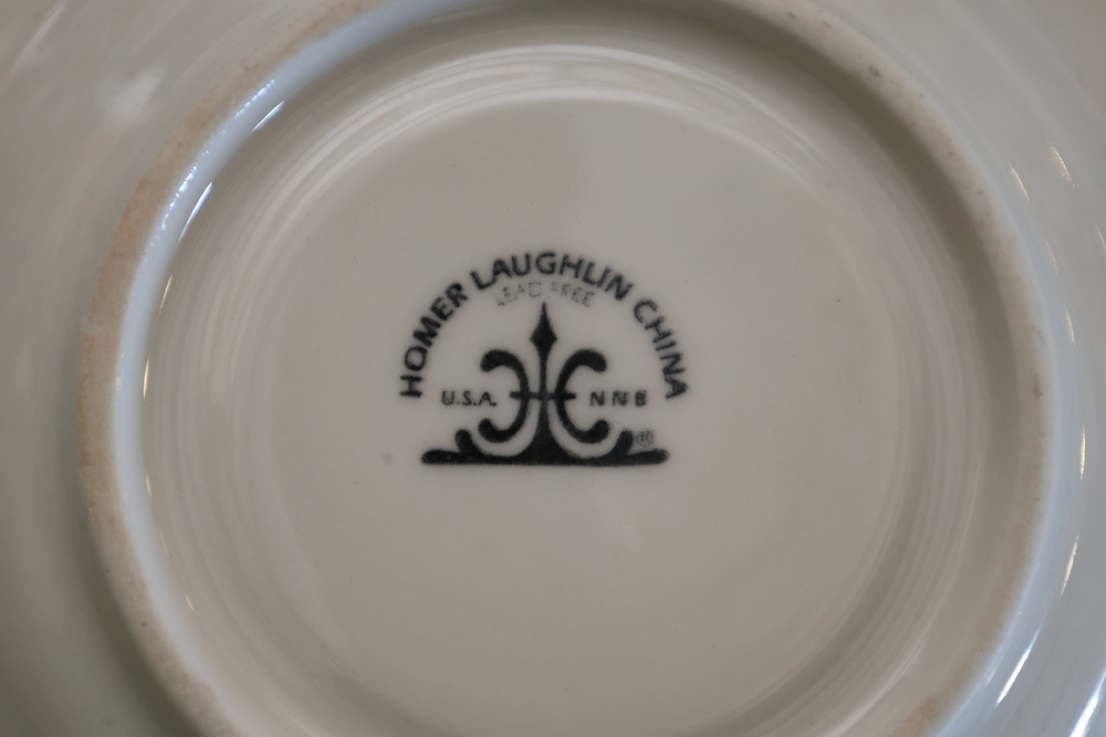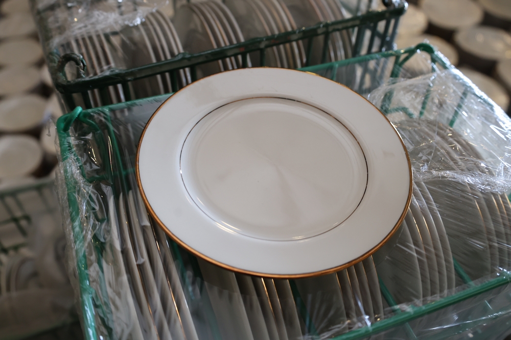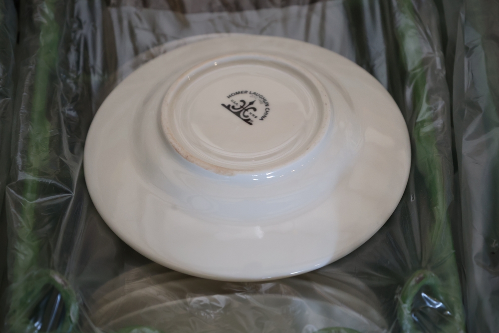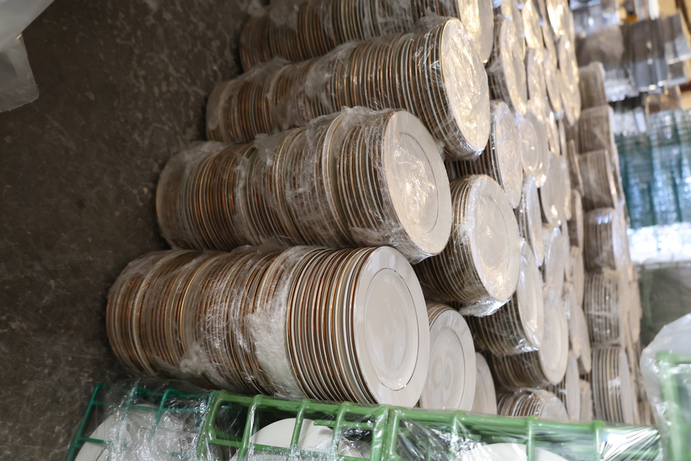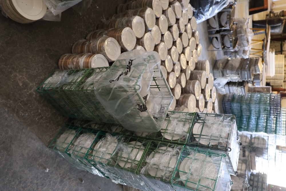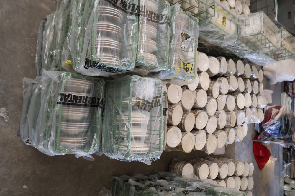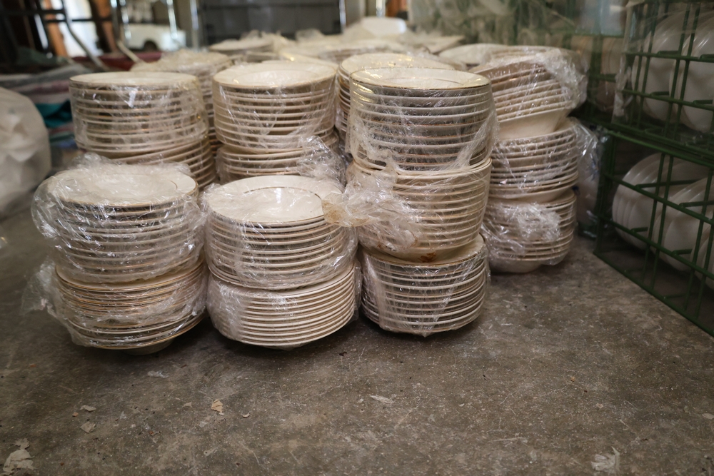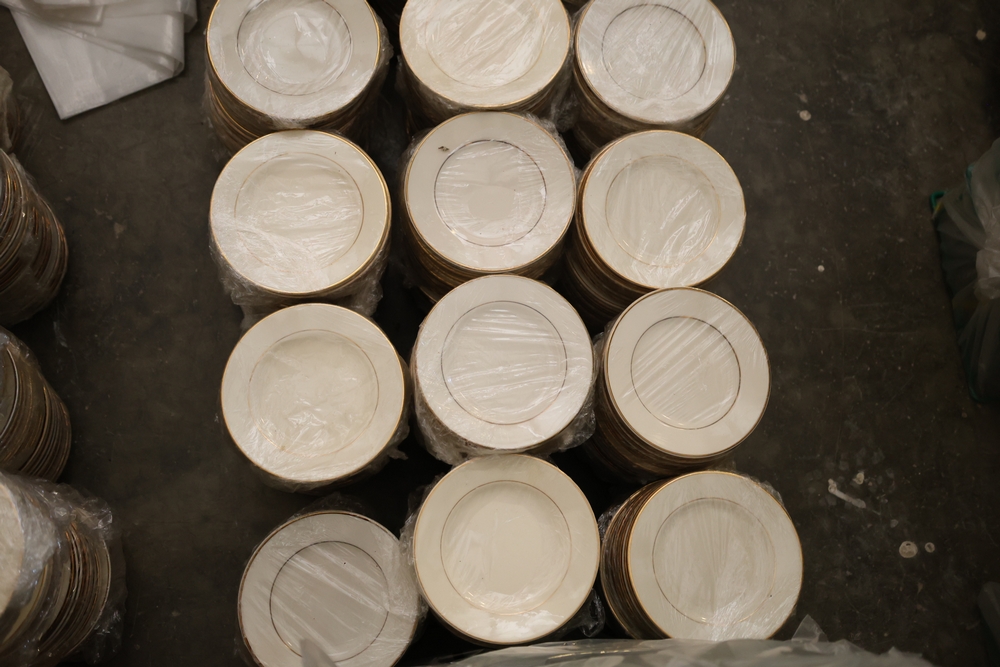 Large quantity of rental company dinnerware including numerous stacks of plates and shallow bowls, along with multiple wire dish racks filled with plates and bowls marked Taylor Rental, and additional stacked commercial plastic dish racks, with visible Homer Laughlin China USA markings on underside of pieces. Approx quantities: 10" dinner plate - 2000, 9" plate - 225, 7" plate - 3600, 5" plate - 1045, 9" bowl - 225, 7" bowl - 320, 5" bowl - 1350, sugar bowl - 50, creamers - 28, saucers - 2700, coffee cups - 1800.
