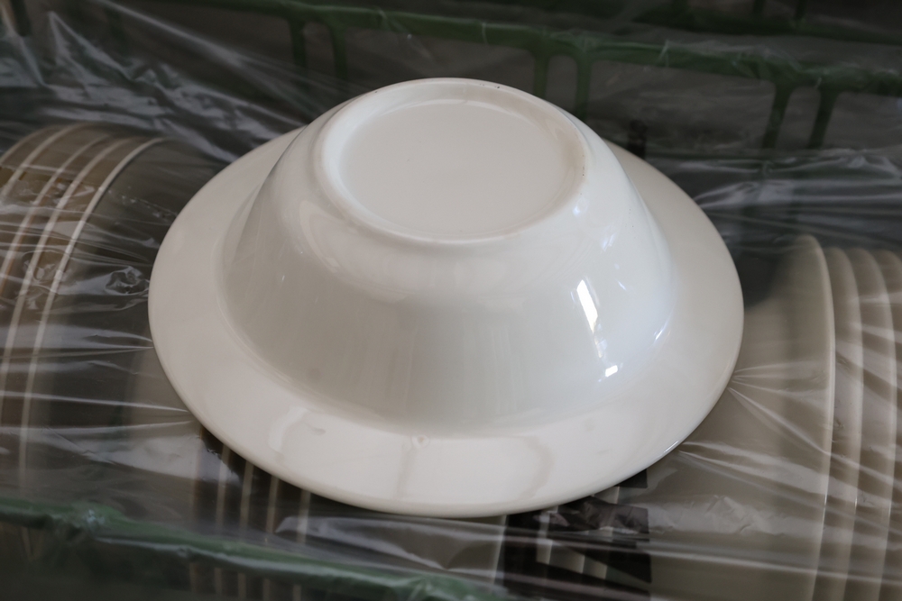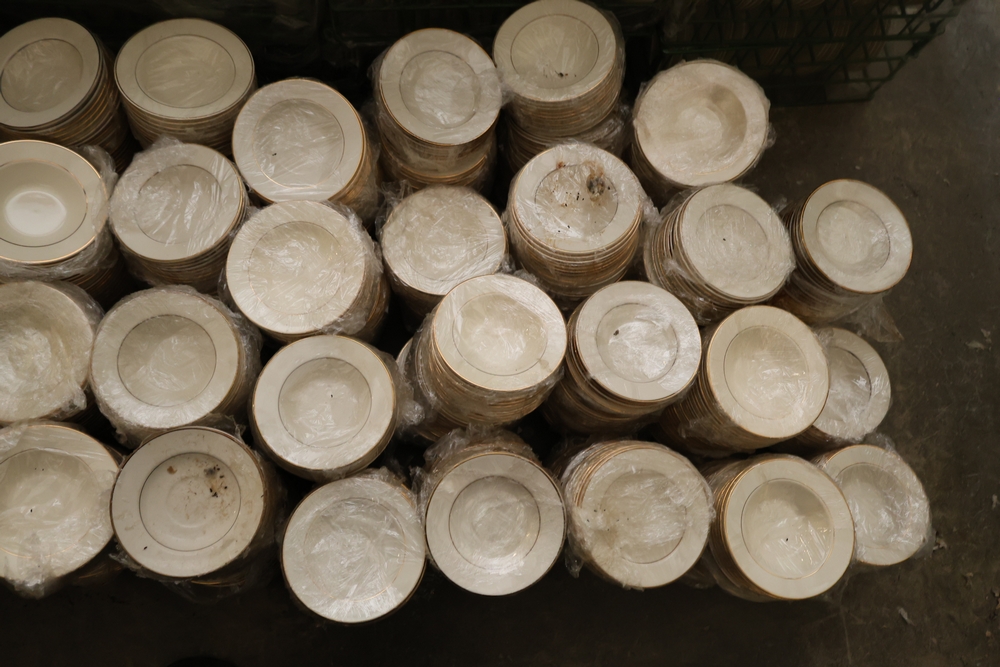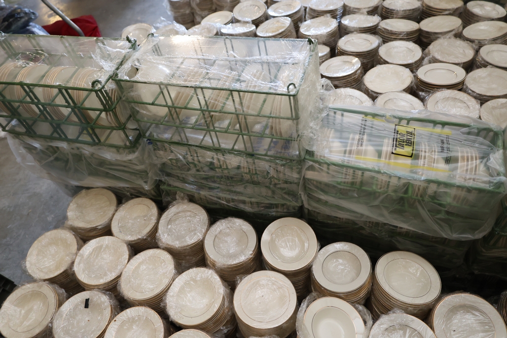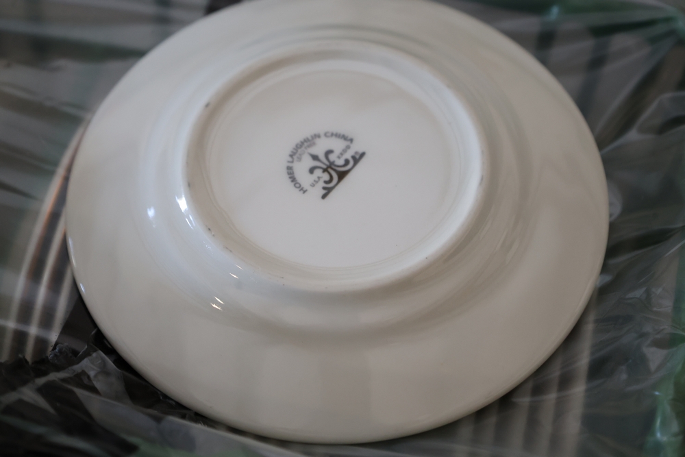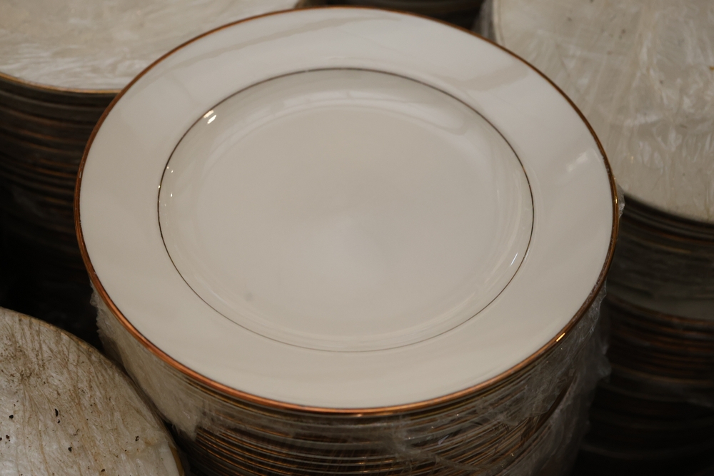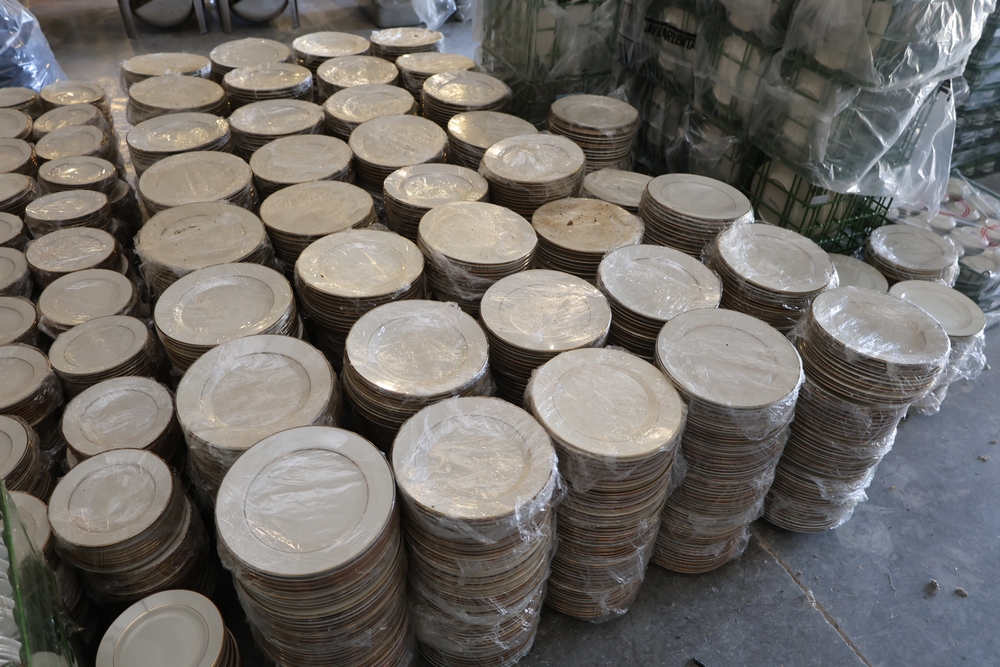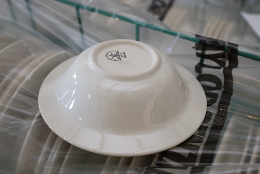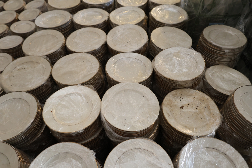 Large quantity of rental company dinnerware including numerous stacks of plates and shallow bowls, along with multiple wire dish racks filled with plates and bowls marked Taylor Rental, and additional stacked commercial plastic dish racks, with visible Homer Laughlin China USA markings on underside of pieces. Approx quantities: 10" dinner plate - 2000, 9" plate - 225, 7" plate - 3600, 5" plate - 1045, 9" bowl - 225, 7" bowl - 320, 5" bowl - 1350, sugar bowl - 50, creamers - 28, saucers - 2700, coffee cups - 1800.
