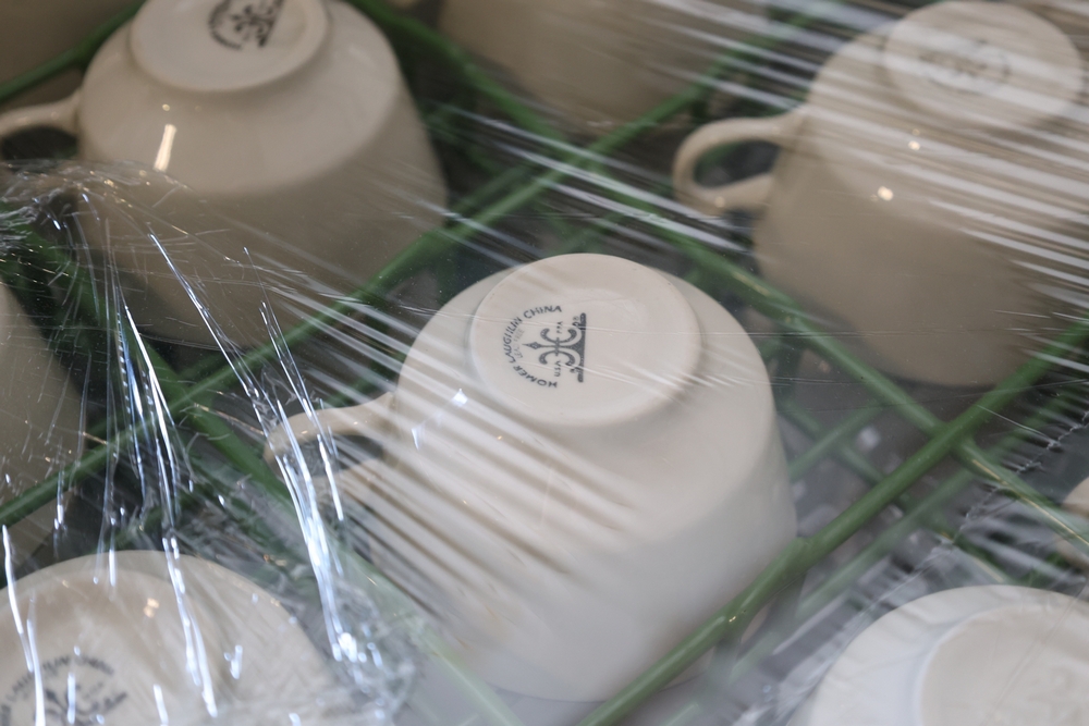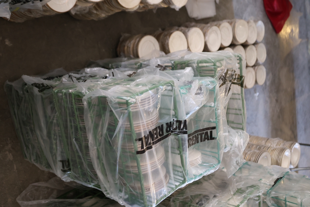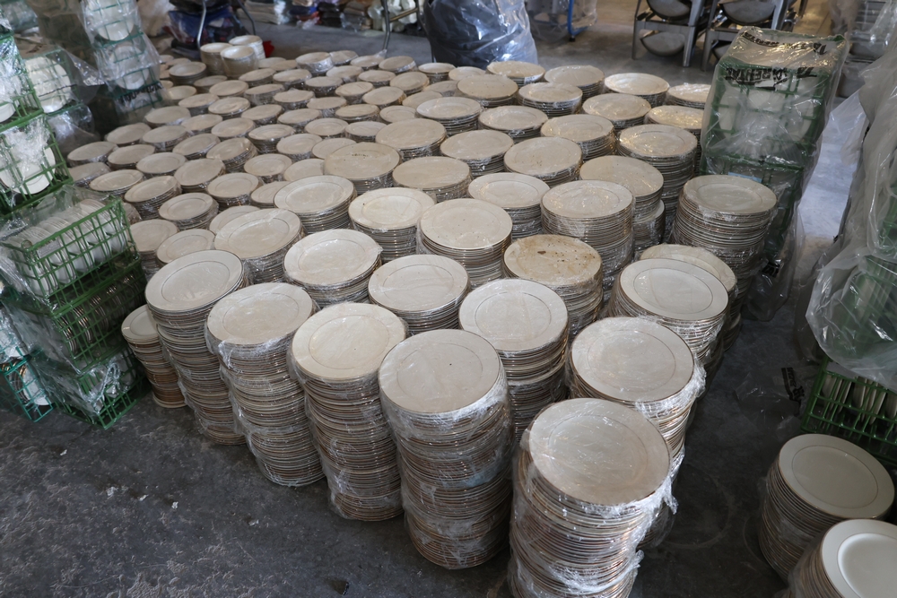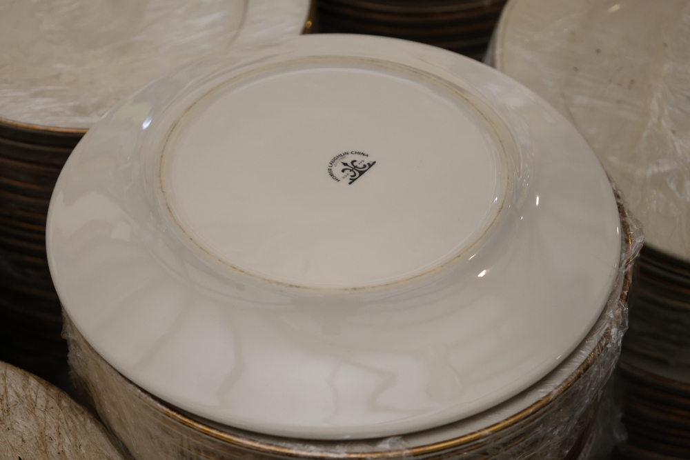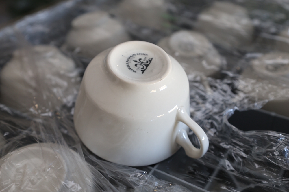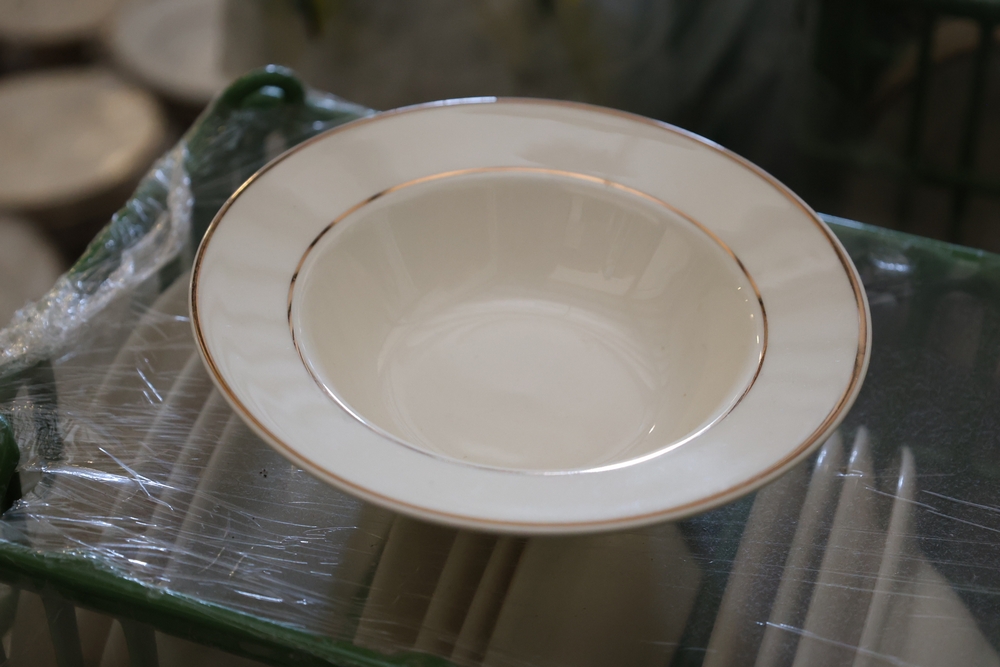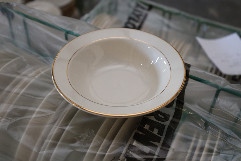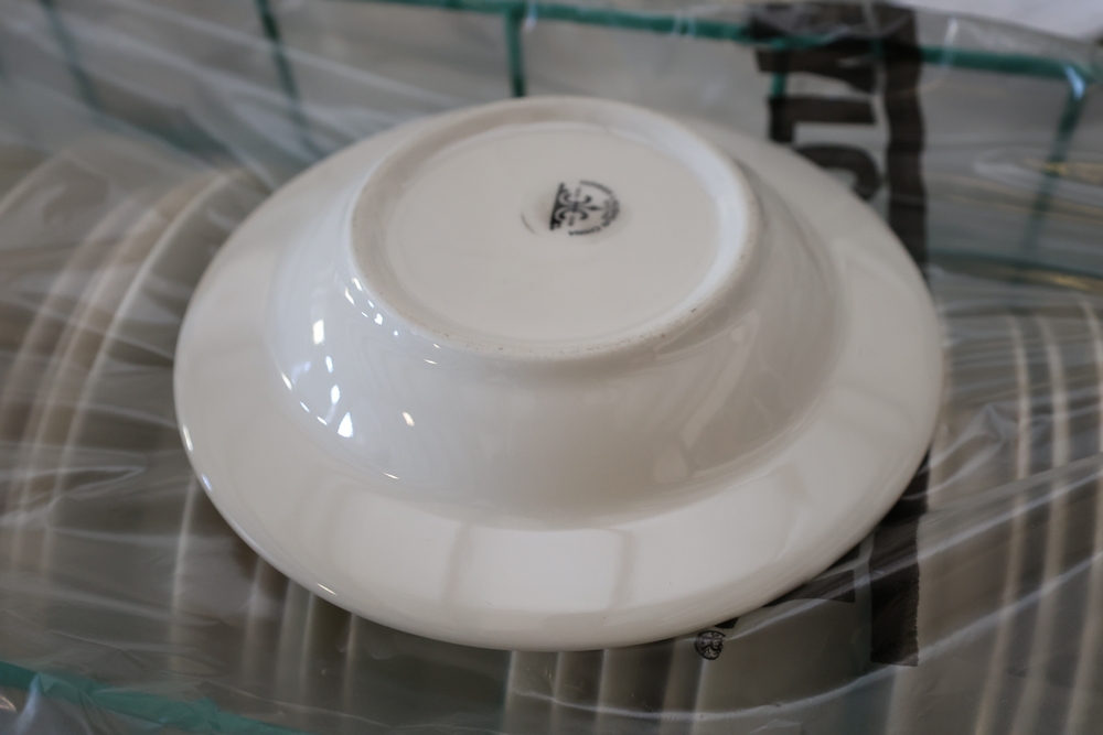 Large quantity of rental company dinnerware including numerous stacks of plates and shallow bowls, along with multiple wire dish racks filled with plates and bowls marked Taylor Rental, and additional stacked commercial plastic dish racks, with visible Homer Laughlin China USA markings on underside of pieces. Approx quantities: 10" dinner plate - 2000, 9" plate - 225, 7" plate - 3600, 5" plate - 1045, 9" bowl - 225, 7" bowl - 320, 5" bowl - 1350, sugar bowl - 50, creamers - 28, saucers - 2700, coffee cups - 1800.