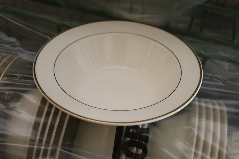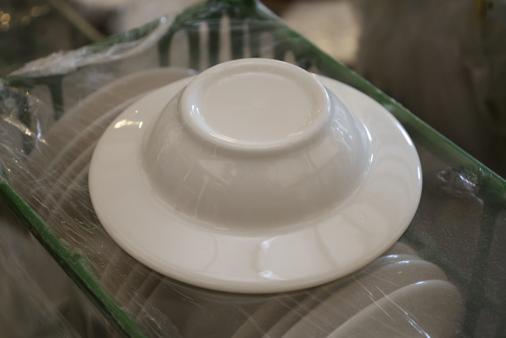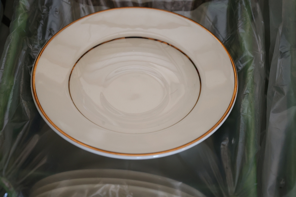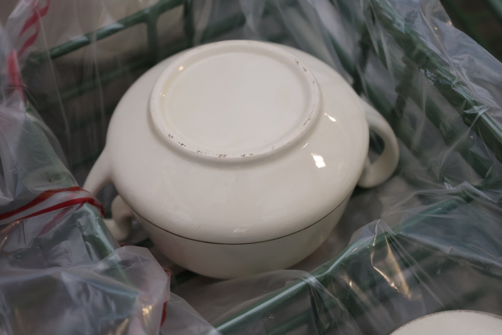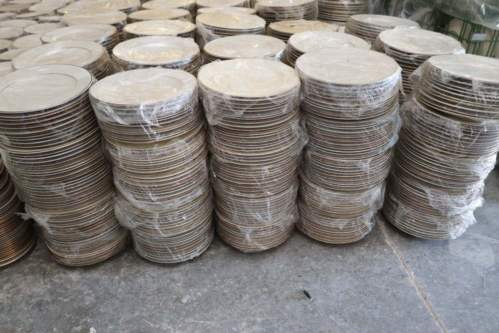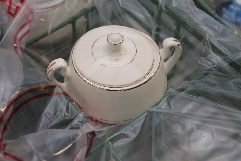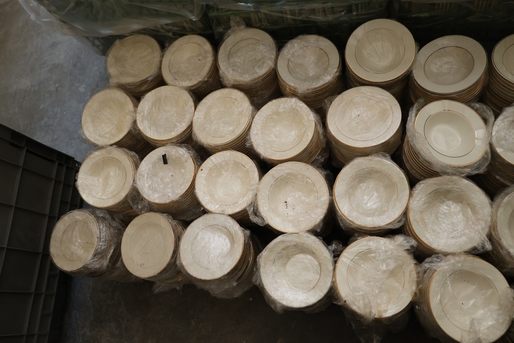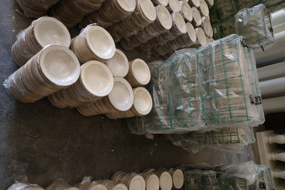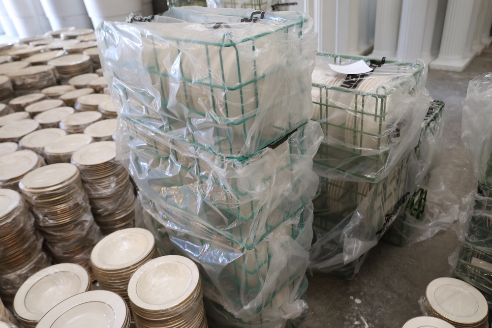 Large quantity of rental company dinnerware including numerous stacks of plates and shallow bowls, along with multiple wire dish racks filled with plates and bowls marked Taylor Rental, and additional stacked commercial plastic dish racks, with visible Homer Laughlin China USA markings on underside of pieces. Approx quantities: 10" dinner plate - 2000, 9" plate - 225, 7" plate - 3600, 5" plate - 1045, 9" bowl - 225, 7" bowl - 320, 5" bowl - 1350, sugar bowl - 50, creamers - 28, saucers - 2700, coffee cups - 1800.
